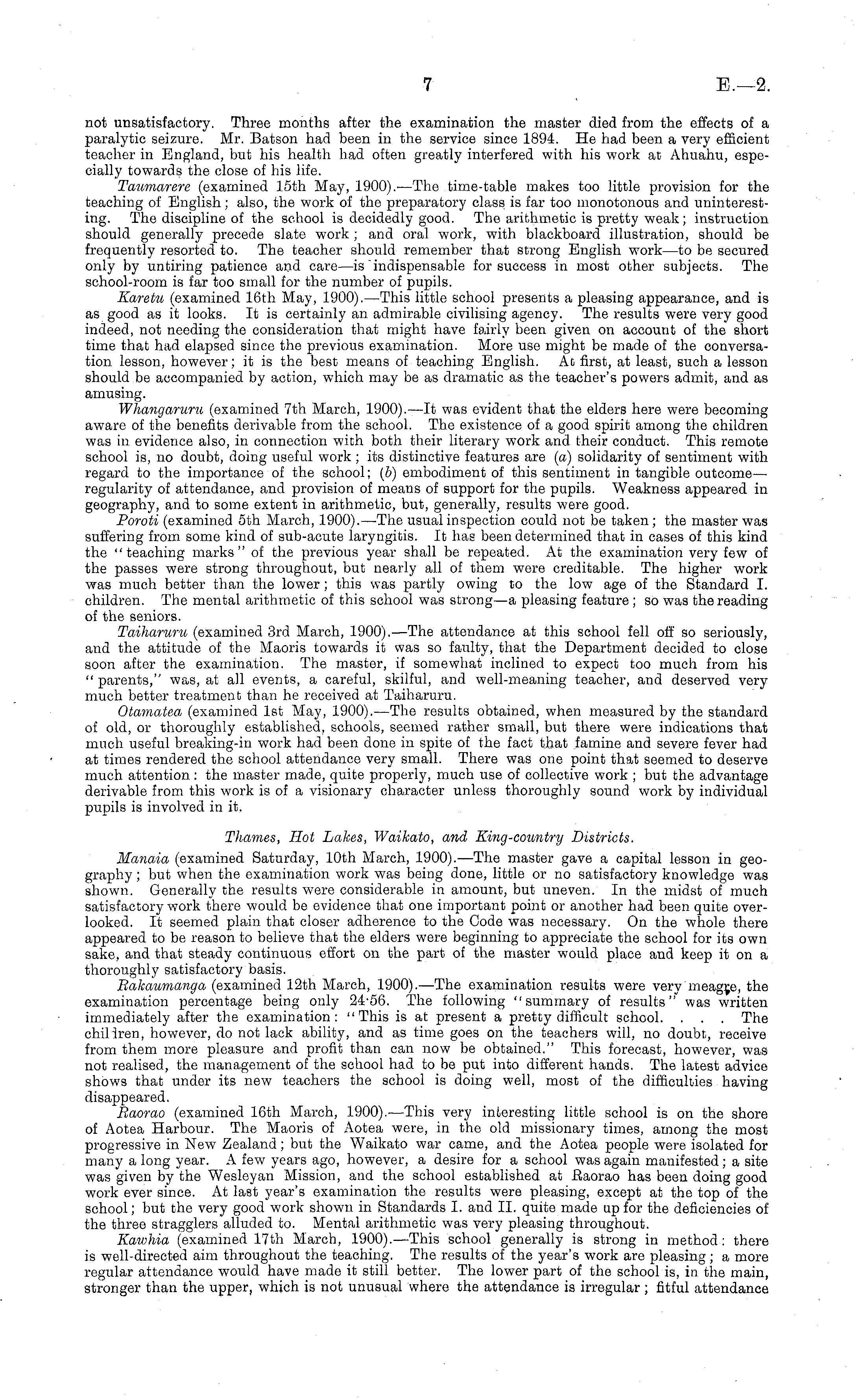 not unsatisfactory. Three months after the examination the master died from the effects of a paralytic seizure. Mr. Batson had been in the service since 1894. He had been a very efficient teacher in England, but his health had often greatly interfered with his work at Ahuahu, especially towards the close of his life. Taumarere (examined 15th May, 1900). —The time-table makes too little provision for the teaching of English; also, the work of the preparatory class is far too monotonous and uninteresting. The discipline of the school is decidedly good. The arithmetic is pretty weak; instruction should generally precede slate work ; and oral work, with blackboard illustration, should be frequently resorted to. The teacher should remember that strong English work—to be secured only by untiring patience and care—is for success in most other subjects. The school-room is far too small for the number of pupils. Karetu (examined 16th May, 1900). —This little school presents a pleasing appearance, and is as good as it looks. It is certainly an admirable civilising agency. The results were very good indeed, not needing the consideration that might have fairly been given on account of the short time that had elapsed since the previous examination. More use might be made of the conversation lesson, however; it is the best means of teaching English. At first, at least, such a lesson should be accompanied by action, which may be as dramatic as the teacher's powers admit, and as amusing. Whangaruru (examined 7th March, 1900). —It was evident that the elders here were becoming aware of the benefits derivable from the school. The existence of a good spirit among the children was in evidence also, in connection with both their literary work and their conduct. This remote school is, no doubt, doing useful work ; its distinctive features are (a) solidarity of sentiment with regard to the importance of the school; (&) embodiment of this sentiment in tangible outcome — regularity of attendance, and provision of means of support for the pupils. Weakness appeared in geography, and to some extent in arithmetic, but, generally, results were good. Poroti (examined sth March, 1900). —The usual inspection could not be taken; the master was suffering from some kind of sub-acute laryngitis. It has been determined that in cases of this kind the "teaching marks" of the previous year shall be repeated. At the examination very few of the passes were strong throughout, but nearly all of them were creditable. The higher work was much better than the lower; this was partly owing to the low age of the Standard I. children. The mental arithmetic of this school was strong—a pleasing feature ;so was the reading of the seniors. Taiharuru (examined 3rd March, 1900). —The attendance at this school fell off so seriously, and the attitude of the Maoris towards it was so faulty, that the Department decided to close soon after the examination. The master, if somewhat inclined to expect too much from his " parents," was, at all events, a careful, skilful, and well-meaning teacher, and deserved very much better treatment than he received at Taiharuru. Otamatea (examined Ist May, 1900). —The results obtained, when measured by the standard of old, or thoroughly established, schools, seemed rather small, but there were indications that much useful breaking-in work had been done in spite of the fact that famine and severe fever had at times rendered the school attendance very small. There was one point that seemed to deserve much attention : the master made, quite properly, much use of collective work ; but the advantage derivable from this work is of a visionary character unless thoroughly sound work by individual pupils is involved in it. Thames, Hot Lakes, Waikato, and King-country Districts. Manaia (examined Saturday, 10th March, 1900). —The master gave a capital lesson in geography ; but when the examination work was being done, little or no satisfactory knowledge was shown. Generally the results were considerable in amount, but uneven. In the midst of much satisfactory work there would be evidence that one important point or another had been quite overlooked. It seemed plain that closer adherence to the Code was necessary. On the whole there appeared to be reason to believe that the elders were beginning to appreciate the school for its own sake, and that steady continuous effort on the part of the master would place and keep it on a thoroughly satisfactory basis. Rakaumanga (examined 12th March, 1900). —The examination results were very meagre, the examination percentage being only 24-56. The following "summary of results" was written immediately after the examination: "This is at present a pretty difficult school. . . . The chiliren, however, do not lack ability, and as time goes on the teachers will, no doubt, receive from them more pleasure and profit than can now be obtained." This forecast, however, was not realised, the management of the school had to be put into different hands. The latest advice shows that under its new teachers the school is doing well, most of the difficulties having disappeared. Raorao (examined 16th March, 1900). —This very interesting little school is on the shore of Aotea Harbour. The Maoris of Aotea were, in the old missionary times, among the most progressive in New Zealand; but the Waikato war came, and the Aotea people were isolated for many a long year. A few years ago, however, a desire for a school was again manifested; a site was given by the Wesley an Mission, and the school established at Raorao has been doing good work ever since. At last year's examination the results were pleasing, except at the top of the school; but the very good work shown in Standards I. and 11. quite made up for the deficiencies of the three stragglers alluded to. Mental arithmetic was very pleasing throughout. Kawhia (examined 17th March, 1900). —This school generally is strong in method: the