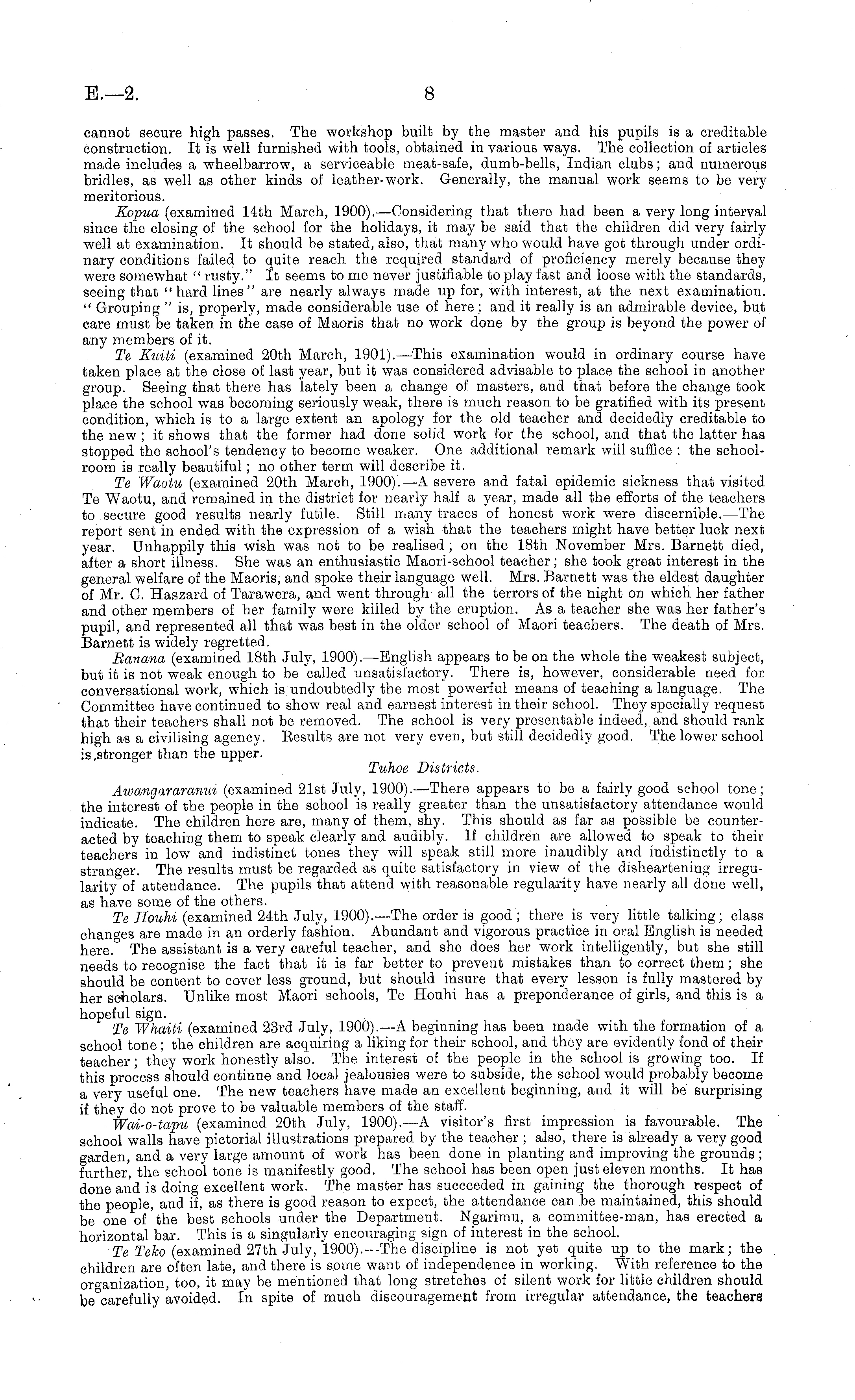 cannot secure high passes. The workshop built by the master and his pupils is a creditable construction. It is well furnished with tools, obtained in various ways. The collection of articles made includes a wheelbarrow, a serviceable meat-safe, dumb-bells, Indian clubs; and numerous bridles, as well as other kinds of leather-work. Generally, the manual work seems to be very meritorious. Kopua (examined 14th March, 1900). —Considering that there had been a very long interval since the closing of the school for the holidays, it may be said that the children did very fairly well at examination. It should be stated, also, that many who would have got through under ordinary conditions failed to quite reach the required standard of proficiency merely because they were somewhat " rusty." It seems to me never justifiable to play fast and loose with the standards, seeing that " hard lines " are nearly always made up for, with interest, at the next examination. " Grouping " is, properly, made considerable use of here; and it really is an admirable device, but care must be taken in the case of Maoris that no work done by the group is beyond the power of any members of it. Te Kuiti (examined 20th March, 1901). —This examination would in ordinary course have taken place at the close of last year, but it was considered advisable to place the school in another group. Seeing that there has lately been a change of masters, and that before the change took place the school was becoming seriously weak, there is much reason to be gratified with its present condition, which is to a large extent an apology for the old teacher and decidedly creditable to the new ; it shows that the former had done solid work for the school, and that the latter has stopped the school's tendency to become weaker. One additional remark will suffice : the schoolroom is really beautiful; no other term will describe it. Te Waotu (examined 20th March, 1900). —A severe and fatal epidemic sickness that visited Te Waotu, and remained in the district for nearly half a year, made all the efforts of the teachers to secure good results nearly futile. Still many traces of honest work were discernible.—The report sent in ended with the expression of a wish that the teachers might have better luck next year. Unhappily this wish was not to be realised ; on the 18th November Mrs. Barnett died, after a short illness. She was an enthusiastic Maori-school teacher; she took great interest in the general welfare of the Maoris, and spoke their language well. Mrs. Barnett was the eldest daughter of Mr. C. Haszard of Tarawera, and went through all the terrors of the night on which her father and other members of her family were killed by the eruption. As a teacher she was her father's pupil, and represented all that was best in the older school of Maori teachers. The death of Mrs. Barnett is widely regretted. Ranana (examined 18th July, 1900). —English appears to be on the whole the weakest subject, but it is not weak enough to be called unsatisfactory. There is, however, considerable need for conversational work, which is undoubtedly the most powerful means of teaching a language. The Committee have continued to show real and earnest interest in their school. They specially request that their teachers shall not be removed. The school is very presentable indeed, and should rank high as a civilising agency. Results are not very even, but still decidedly good. The lower school is .stronger than the upper. Tuhoe Districts. Aiuangararanui (examined 21st July, 1900). —There appears to be a fairly good school tone; the interest of the people in the school is really greater than the unsatisfactory attendance would indicate. The children here are, many of them, shy. This should as far as possible be counteracted by teaching them to speak clearly and audibly. If children are allowed to speak to their teachers in low and indistinct tones they will speak still more inaudibly and indistinctly to a stranger. The results must be regarded as quite satisfactory in view of the disheartening irregularity of attendance. The pupils that attend with reasonable regularity have nearly all done well, as have some of the others. Te Houhi (examined 24th July, 1900). —The order is good ; there is very little talking; class changes are made in an orderly fashion. Abundant and vigorous practice in oral English is needed here. The assistant is a very careful teacher, and she does her work intelligently, but she still needs to recognise the fact that it is far better to prevent mistakes than to correct them ; she should be content to cover less ground, but should insure that every lesson is fully mastered by her scholars. Unlike most Maori schools, Te Houhi has a preponderance of girls, and this is a hopeful sign. Te Whaiti (examined 23rd July, 1900). —A beginning has been made with the formation of a school tone ; the children are acquiring a liking for their school, and they are evidently fond of their teacher; they work honestly also. The interest of the people in the school is growing too. If this process should continue and local jealousies were to subside, the school would probably become a very useful one. The new teachers have made an excellent beginning, and it will be surprising if they do not prove to be valuable members of the staff. Wai-o-tapu (examined 20th July, 1900). —A visitor's first impression is favourable. The school walls have pictorial illustrations prepared by the teacher ; also, there is already a very good garden, and a very large amount of work has been done in planting and improving the grounds; further, the school tone is manifestly good. The school has been open just eleven months. It has done and is doing excellent work. The master has succeeded in gaining the thorough respect of the people, and if, as there is good reason to expect, the attendance can be maintained, this should be one of the best schools under the Department. Ngarimu,