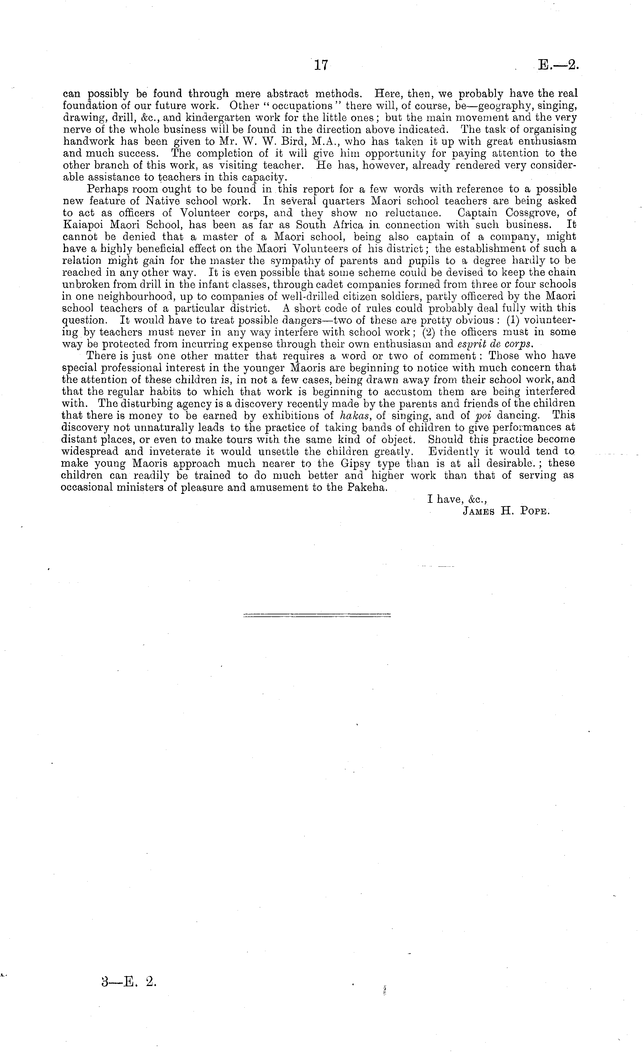 can possibly be found through mere abstract methods. Here, then, we probably have the real foundation of our future work. Other " occupations " there will, of course, be—geography, singing, drawing, drill, &c, and kindergarten work for the little ones; but the main movement and the very nerve of the whole business will be found in the direction above indicated. The task of organising handwork has been given to Mr. W. W. Bird, M.A., who has taken it up with great enthusiasm and much success. The completion of it will give him opportunity for paying attention to the other branch of this work, as visiting teacher. He has, however, already rendered very considerable assistance to teachers in this capacity. Perhaps room ought to be found in this report for a few words with reference to a possible new feature of Native school work. In several quarters Maori school teachers are being asked to act as officers of Volunteer corps, and they show no reluctance. Captain Cossgrove, of Kaiapoi Maori School, has been as far as South Africa in. connection with such business. It cannot be denied that a master of a Maori school, being also captain of a company, might have a highly beneficial effect on the Maori Volunteers of his district; the establishment of such a relation might gain for the master the sympathy of parents and pupils to a degree hardly to be reached in any other way. It is even possible that some scheme could be devised to keep the chain unbroken from drill in the infant classes, through cadet companies formed from three or four schools in one neighbourhood, up to companies of well-drilled citizen soldiers, partly officered by the Maori school teachers of a particular district. A short code of rules could probably deal fully with this question. It would have to treat possible dangers —two of these are pretty obvious : (1) volunteering by teachers must never in any way interfere with school work; (2) the officers must in some way be protected from incurring expense through their own enthusiasm and esprit de corps. There is just one other matter that requires a word or two of comment : Those who have special professional interest in the younger Maoris are beginning to notice with much concern that the attention of these children is, in not a few cases, being drawn away from their school work, and that the regular habits to which that work is beginning to accustom them are being interfered with. The disturbing agency is a discovery recently made by the parents and friends of the children that there is money to be earned by exhibitions of hakas, of singing, and of poi dancing. This discovery not unnaturally leads to the practice of taking bands of children to give performances at distant places, or even to make tours with the same kind of object. Should this practice become widespread and inveterate it would unsettle the children greatly. Evidently it would tend to make young Maoris approach much nearer to the Gipsy type than is at all desirable. ; these children can readily be trained to do much better and higher work than that of serving as occasional ministers of pleasure and amusement to the Pakeha. I have, &c, James H. Pope.