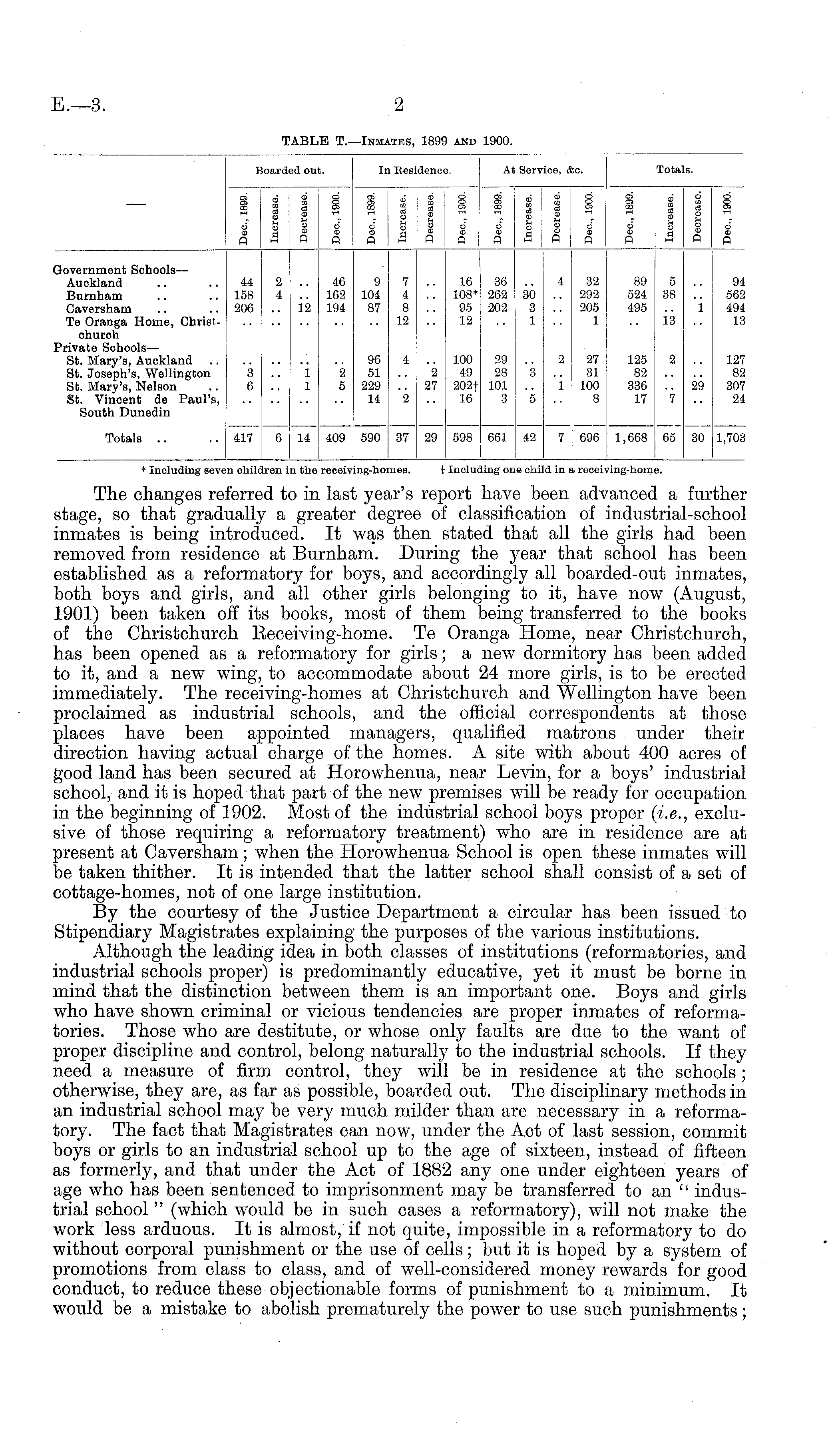 * Including seven children in the receiving-homes. t Including one child in a receiving-home. The changes referred to in last year's report have been advanced a further stage, so that gradually a greater degree of classification of industrial-school inmates is being introduced. It was then stated that all the girls had been removed from residence at Burnham. During the year that school has been established as a reformatory for boys, and accordingly all boarded-out inmates, both boys and girls, and all other girls belonging to it, have now (August, 1901) been taken off its books, most of them being transferred to the books of the Christchurch Eeceiving-home. Te Oranga Home, near Christchurch, has been opened as a reformatory for girls; a new dormitory has been added to it, and a new wing, to accommodate about 24 more girls, is to be erected immediately. The receiving-homes at Christchurch and Wellington have been proclaimed as industrial schools, and the official correspondents at those places have been appointed managers, qualified matrons under their direction having actual charge of the homes. A site with about 400 acres of good land has been secured at Horowhenua, near Levin, for a boys' industrial school, and it is hoped that part of the new premises will be ready for occupation in the beginning of 1902. Most of the industrial school boys proper (i.e., exclusive of those requiring a reformatory treatment) who are in residence are at present at Caversham; when the Horowhenua School is open these inmates will be taken thither. It is intended that the latter school shall consist of a set of cottage-homes, not of one large institution. By the courtesy of the Justice Department a circular has been issued to Stipendiary Magistrates explaining the purposes of the various institutions. Although the leading idea in both classes of institutions (reformatories, and industrial schools proper) is predominantly educative, yet it must be borne in mind that the distinction between them is an important one. Boys and girls who have shown criminal or vicious tendencies are proper inmates of reformatories. Those who are destitute, or whose only faults are due to the want of proper discipline and control, belong naturally to the industrial schools. If they need a measure of firm control, they will be in residence at the schools ; otherwise, they are, as far as possible, boarded out. The disciplinary methods in an industrial school may be very much milder than are necessary in a reformatory. The fact that Magistrates can now, under the Act of last session, commit boys or girls to an industrial school up to the age of sixteen, instead of fifteen as formerly, and that under the Act of 1882 any one under eighteen years of age who has been sentenced to imprisonment may be transferred to an " industrial school " (which would be in such cases a reformatory), will not make the work less arduous. It is almost, if not quite, impossible in a reformatory to do without corporal punishment or the use of cells; but it is hoped by a system of promotions from class to class, and of well-considered money rewards for good conduct, to reduce these objectionable forms of punishment to a minimum. It would be a mistake to abolish prematurely the power to use such punishments;