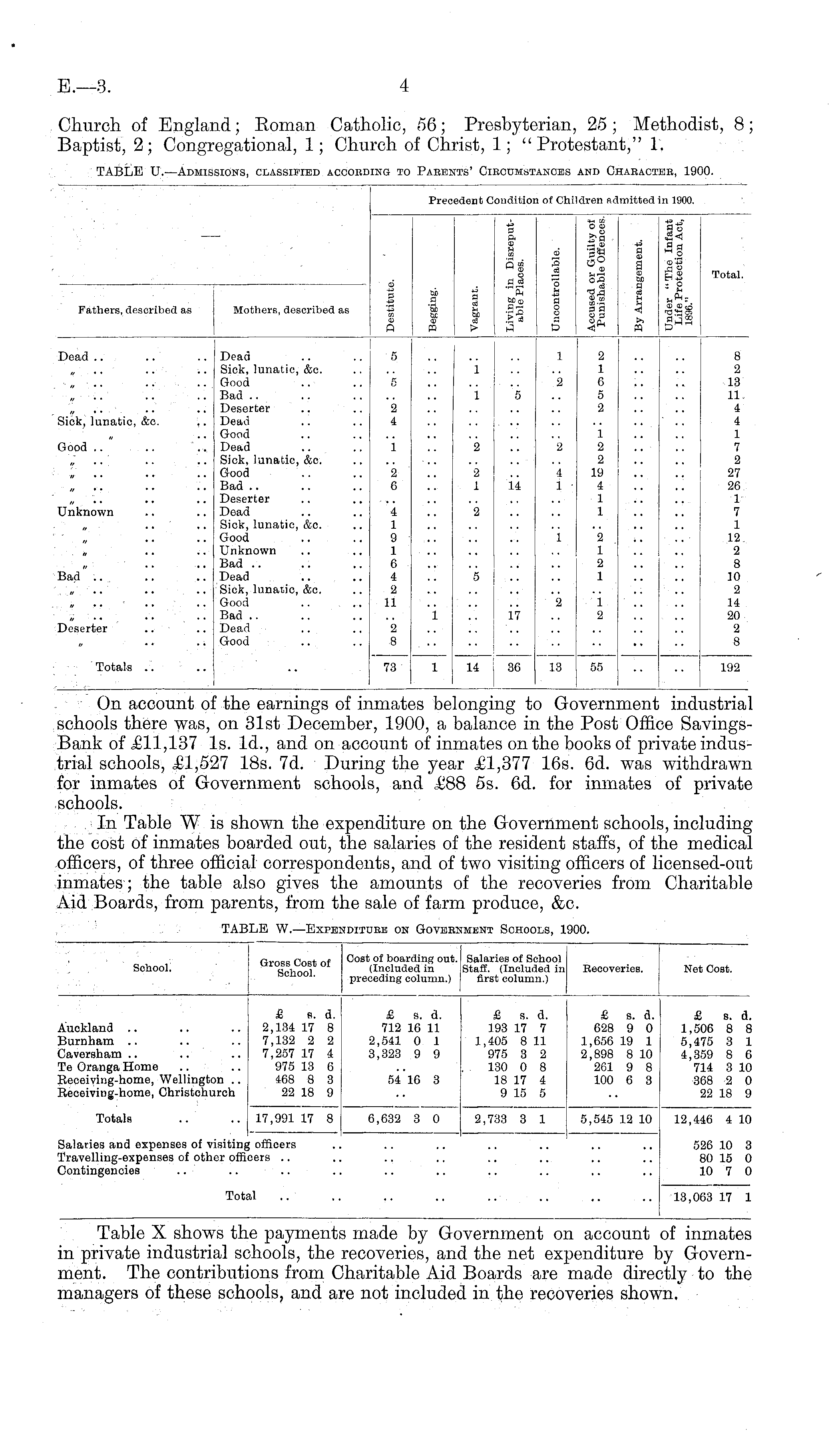 Church of England; Eoman Catholic, 66; Presbyterian, 25 ; Methodist, 8; Baptist, 2; Congregational, 1; Church of Christ, 1; "Protestant," 1. TABLE U. —Admissions, classified acoobding to Pabents' Circumstances and Characthe, 1900.
