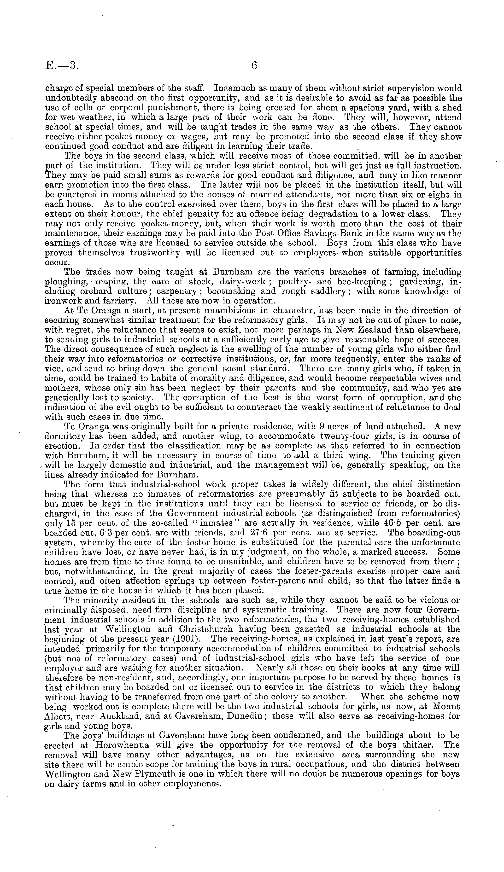 charge of special members of the staff. Inasmuch as many of them without strict supervision would undoubtedly abscond on the first opportunity, and as it is desirable to avoid as far as possible the use of cells or corporal punishment, there is being erected for them a spacious yard, with a shed for wet weather, in which a large part of their work can be done. They will, however, attend school at special times, and will be taught trades in the same way as the others. They cannot receive either pocket-money or wages, but may be promoted into the second class if they show continued good conduct and are diligent in learning their trade. The boys in the second class, which will receive most of those committed, will be in another part of the institution. They will be under less strict control, but will get just as full instruction. They may be paid small sums as rewards for good conduct and. diligence, and may in like manner earn promotion into the first class. The latter will not be placed in the institution itself, but will be quartered in rooms attached to the houses of married attendants, not more than six or eight in each house. As to the control exercised over them, boys in the first class will be placed to a large extent on their honour, the chief penalty for an offence being degradation to a lower class. They may not only receive pocket-money, but, when their work is worth more than the cost of their maintenance, their earnings may be paid into the Post-Office Savings-Bank in the same way as the earnings of those whe are licensed to service outside the school. Boys from this class who have proved themselves trustworthy will be licensed out to employers when suitable opportunities occur. The trades now being taught at Burnham are the various branches of farming, including ploughing, reaping, the care of stock, dairy-work ; poultry- and bee-keeping ; gardening, including orchard culture; carpentry ; bootmaking and rough saddlery; with some knowledge of ironwork and farriery. All these are now in operation. At Te Oranga a start, at present unambitious in character, has been made in the direction of securing somewhat similar treatment for the reformatory girls. It may not be out of place to note, with regret, the reluctance that seems to exist, not more perhaps in New Zealand than elsewhere, to sending girls to industrial schools at a sufficiently early age to give reasonable hope of success. The direct consequence of such neglect is the swelling of the number of young girls who either find their way into reformatories or corrective institutions, or, far more frequently, enter the ranks of vice, and tend to bring down the general social standard. There are many girls who, if taken in time, could be trained to habits of morality and diligence, and would become respectable wives and mothers, whose only sin has been neglect by their parents and the community, and who yet are practically lost to society. The corruption of the best is the worst form of corruption, and the indication of the evil ought to be sufficient to counteract the weakly sentiment of reluctance to deal with such cases in due time. Te Oranga was originally built for a private residence, with 9 acres of land attached. A new dormitory has been added, and another wing, to accommodate twenty-four girls, is in course of erection. In order that the classification may be as complete as that referred to in connection with Burnham, it will be necessary in course of time to add a third wing. The training given will be largely domestic and industrial, and the management will be, generally speaking, on the lines already indicated for Burnham. The form that industrial-school wbrk proper takes is widely different, the chief distinction being that whereas no inmates of reformatories are presumably fit subjects to be boarded out, but must be kept in the institutions until they can be licensed to service or friends, or be discharged, in the case of the Government industrial schools (as distinguished from reformatories) only 15 per cent, of the so-called " inmates" are actually in residence, while 46 - 5 per cent, are boarded out, 6-3 per cent, are with friends, and 276 per cent, are at service. The boarding-out system, whereby the care of the foster-home is substituted for the parental care the unfortunate children have lost, or have never had, is in my judgment, on the whole, a marked success. Some homes are from time to time found to be unsuitable, and children have to be removed from them ; but, notwithstanding, in the great majority of cases the foster-parents exerise proper care and control, and often affection springs up between foster-parent and child, so that the latter finds a true home in the house in which it has been placed. The minority resident in the schools are such as, while they cannot be said to be vicious or criminally disposed, need firm discipline and systematic training. There are now four Government industrial schools in addition to the two reformatories, the two receiving-homes established last year at Wellington and Ghristchurch having been gazetted as industrial schools at the beginning of the present year (1901). The receiving-homes, as explained in last year's report, are intended primarily for the temporary accommodation of children committed to industrial schools (but not of reformatory cases) and of industrial-school girls who have left the service of one employer and are waiting for another situation. Nearly all those on their books at any time will therefore be non-resident, and, accordingly, one important purpose to be served by these homes is that children may be boarded out or licensed out to service in the districts to which they belong without having to be transferred from one part of the colony to another. When the scheme now being worked out is complete there will be the two industrial schools for girls, as now, at Mount Albert, near Auckland, and at Caversham, Dunedin; these will also serve as recei