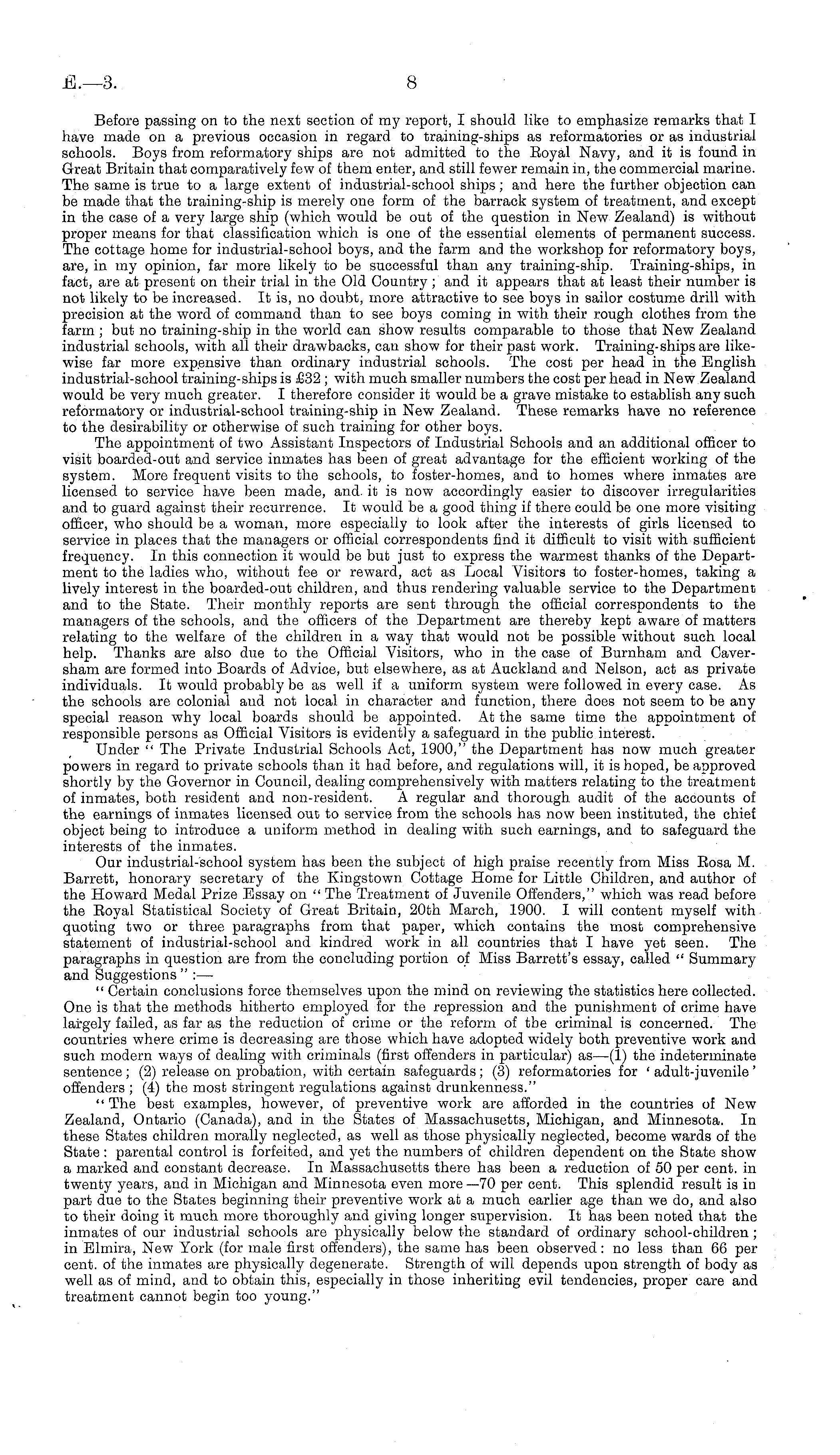 Before passing on to the next section of my report, I should like to emphasize remarks that I have made on a previous occasion in regard to training-ships as reformatories or as industrial schools. Boys from reformatory ships are not admitted to the Eoyal Navy, and it is found in Great Britain that comparatively few of them enter, and still fewer remain in, the commercial marine. The same is true to a large extent of industrial-school ships; and here the further objection can be made that the training-ship is merely one form of the barrack system of treatment, and except in the case of a very large ship (which would be out of the question in New Zealand) is without proper means for that classification which is one of the essential elements of permanent success. The cottage home for industrial-school boys, and the farm and the workshop for reformatory boys, are, in my opinion, far more likely to be successful than any training-ship. Training-ships, in fact, are at present on their trial in the Old Country ; and it appears that at least their number is not likely to be increased. It is, no doubt, more attractive to see boys in sailor costume drill with precision at the word of command than to see boys coming in with their rough clothes from the farm ; but no training-ship in the world can show results comparable to those that New Zealand industrial schools, with all their drawbacks, can show for their past work. Training-ships are likewise far more expensive than ordinary industrial schools. The cost per head in the English industrial-school training-ships is £32 ; with much smaller numbers the cost per head in New Zealand would be very much greater. I therefore consider it would be a grave mistake to establish any such reformatory or industrial-school training-ship in New Zealand. These remarks have no reference to the desirability or otherwise of such training for other boys. The appointment of two Assistant Inspectors of Industrial Schools and an additional officer to visit boarded-out and service inmates has been of great advantage for the efficient working of the system. More frequent visits to the schools, to foster-homes, and to homes where inmates are licensed to service have been made, and. it is now accordingly easier to discover irregularities and to guard against their recurrence. It would be a good thing if there could be one more visiting officer, who should be a woman, more especially to look after the interests of girls licensed to service in places that the managers or official correspondents find it difficult to visit with sufficient frequency. In this connection it would be but just to express the warmest thanks of the Department to the ladies who, without fee or reward, act as Local Visitors to foster-homes, taking a lively interest in the boarded-out children, and thus rendering valuable service to the Department and to the State. Their monthly reports are sent through the official correspondents to the managers of the schools, and the officers of the Department are thereby kept aware of matters relating to the welfare of the children in a way that would not be possible without such local help. Thanks are also due to the Official Visitors, who in the case of Burnham and Caversham are formed into Boards of Advice, but elsewhere, as at Auckland and Nelson, act as private individuals. It would probably be as well if a uniform system were followed in every case. As the schools are colonial and not local in character and function, there does not seem to be any special reason why local boards should be appointed. At the same time the appointment of responsible persons as Official Visitors is evidently a safeguard in the public interest. Under " The Private Industrial Schools Act, 1900," the Department has now much greater powers in regard to private schools than it had before, and regulations will, it is hoped, be approved shortly by the Governor in Council, dealing comprehensively with matters relating to the treatment of inmates, both resident and non-resident. A regular and thorough audit of the accounts of the earnings of inmates licensed out to service from the schools has now been instituted, the chief object being to introduce a uniform method in dealing with such earnings, and to safeguard the interests of the inmates. Our industrial-school system has been the subject of high praise recently from Miss Rosa M. Barrett, honorary secretary of the Kingstown Cottage Home for Little Children, and author of the Howard Medal Prize Essay on " The Treatment of Juvenile Offenders," which was read before the Eoyal Statistical Society of Great Britain, 20th March, 1900. I will content myself with quoting two or three paragraphs from that paper, which contains the most comprehensive statement of industrial-school and kindred work in all countries that I have yet seen. The paragraphs in question are from the concluding portion of Miss Barrett's essay, called " Summary and Suggestions " : — " Certain conclusions force themselves upon the mind on reviewing the statistics here collected. One is that the methods hitherto employed for the repression and the punishment of crime have largely failed, as far as the reduction of crime or the reform of the criminal is concerned. The countries where crime is decreasing are those which have adopted widely both preventive work and such modern ways of dealing with criminals (first offenders in particular) as—(l) the indeterminate sentence ; (2) release on probation, with certain safeguards; (3) reformatories for ' adult-juvenile ' offenders ; (4) the most stringent regulations against drunkenness." "The best examples, however, of preventive work are afforded in the countries of New Zealand, Ontario (Canada), and in the States of Massachusetts, Michigan, and Minnesota. In these States children morally neglected, as well as those physically neglected, become wards of the State: parental control is forfeited, and yet the numbers of children dep