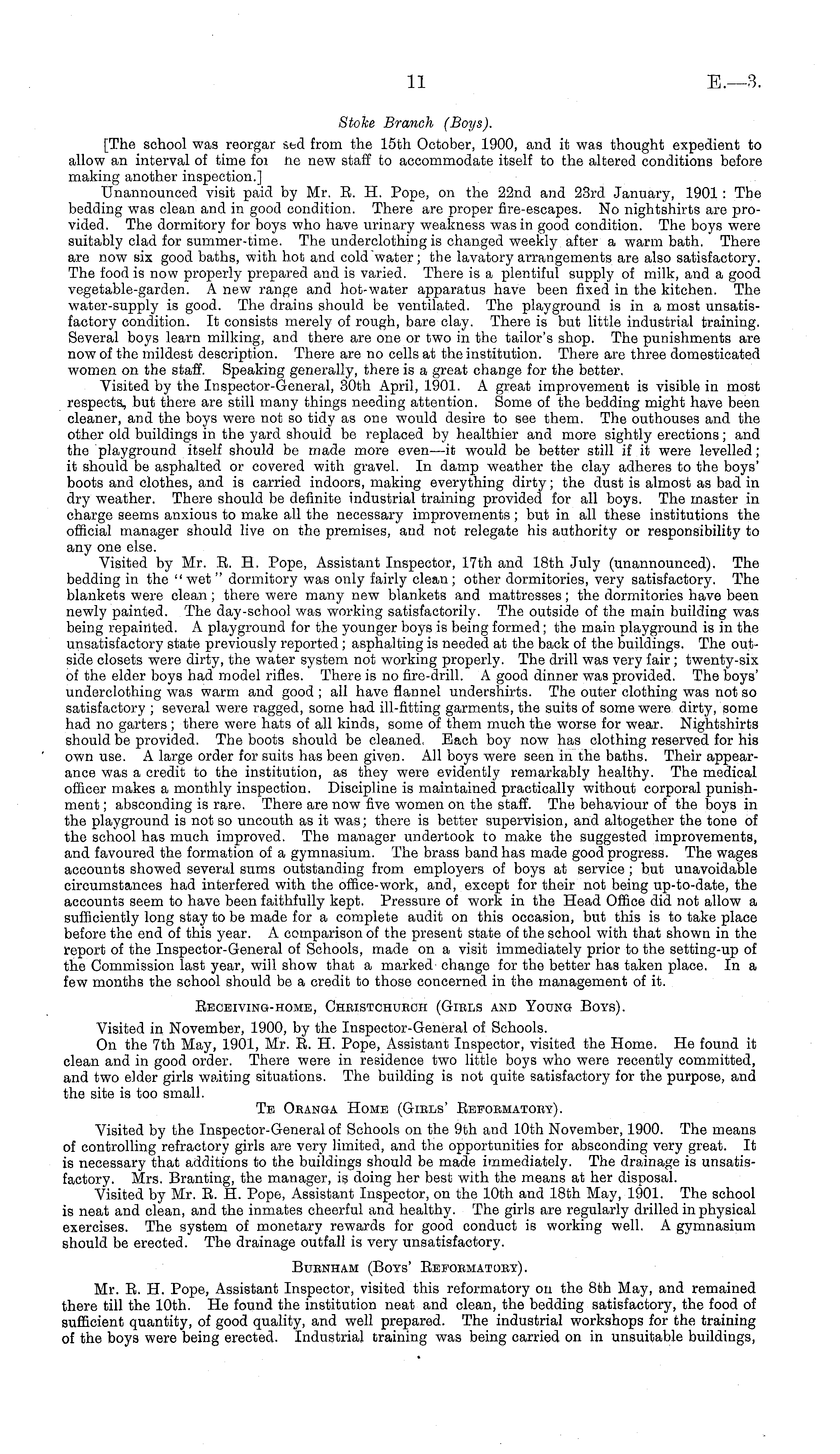 Stoke Branch (Boys). [The school was reorgar Sbd from the 15th October, 1900, and it was thought expedient to allow an interval of time foi ne new staff to accommodate itself to the altered conditions before making another inspection.] Unannounced visit paid by Mr. E. H. Pope, on the 22nd and 23rd January, 1901 : The bedding was clean and in good condition. There are proper fire-escapes. No nightshirts are provided. The dormitory for boys who have urinary weakness was in good condition. The boys were suitably clad for summer-time. The underclothing is changed weekly after a warm bath. There are now six good baths, with hot and cold'water; the lavatory arrangements are also satisfactory. The food is now properly prepared and is varied. There is a plentiful supply of milk, and a good vegetable-garden. A new range and hot-water apparatus have been fixed in the kitchen. The water-supply is good. The drains should be ventilated. The plaj'ground is in a most unsatisfactory condition.. It consists merely of rough, bare clay. There is but little industrial training. Several boys learn milking, and there are one or two in the tailor's shop. The punishments are now of the mildest description. There are no cells at the institution. There are three domesticated women on the staff. Speaking generally, there is a great change for the better. Visited by the Inspector-General, 30th April, 1901. A great improvement is visible in most respects, but there are still many things needing attention. Some of the bedding might have been cleaner, and the boys were not so tidy as one would desire to see them. The outhouses and the other old buildings in the yard should be replaced by healthier and more sightly erections; and the playground itself should be made more even —it would be better still if it were levelled; it should, be asphalted or covered with gravel. In damp weather the clay adheres to the boys' boots and clothes, and is carried indoors, making everything dirty; the dust is almost as bad in dry weather. There should be definite industrial training provided for all boys. The master in charge seems anxious to make all the necessary improvements ; but in all these institutions the official manager should live on the premises, and not relegate his authority or responsibility to any one else. Visited by Mr. E. H. Pope, Assistant Inspector, 17th and 18th July (unannounced). The bedding in the " wet " dormitory was only fairly clean ; other dormitories, very satisfactory. The blankets were clean; there were many new blankets and mattresses; the dormitories have been newly painted. The day-school was working satisfactorily. The outside of the main building was being repainted. A playground for the younger boys is being formed; the main playground is in the unsatisfactory state previously reported ; asphalting is needed at the back of the buildings. The outside closets were dirty, the water system not working properly. The drill was very fair ; twenty-six of the elder boys had model rifles. There is no fire-drill. A good dinner was provided. The boys' underclothing was warm and good ; all have flannel undershirts. The outer clothing was not so satisfactory ; several were ragged, some had ill-fitting garments, the suits of some were dirty, some had no garters ; there were hats of all kinds, some of them much the worse for wear. Nightshirts should be provided. The boots should be cleaned. Each boy now has clothing reserved for his own use. A large order for suits has been given. All boys were seen in the baths. Their appearance was a credit to the institution, as they were evidently remarkably healthy. The medical officer makes a monthly inspection. Discipline is maintained practically without corporal punishment ; absconding is rare. There are now five women on the staff. The behaviour of the boys in the playground is not so uncouth as it was; there is better supervision, and altogether the tone of the school has much improved. The manager undertook to make the suggested improvements, and favoured the formation of a gymnasium. The brass band has made good progress. The wages accounts showed several sums outstanding from employers of boys at service ; but unavoidable circumstances had interfered with the office-work, and, except for their not being up-to-date, the accounts seem to have been faithfully kept. Pressure of work in the Head Office did not allow a sufficiently long stay to be made for a complete audit on this occasion, but this is to take place before the end of this year. A comparison of the present state of the school with that shown in the report of the Inspector-General of Schools, made on a visit immediately prior to the setting-up of the Commission last year, will show that a marked change for the better has taken place. In a few months the school should be a credit to those concerned in the management of it. EBCBiviNa-HOMB, Cheistchukch (Girls and Young Boys). Visited in November, 1900, by the Inspector-General of Schools. On the 7th May, 1901, Mr. E. H. Pope, Assistant Inspector, visited the Home. He found it clean and in good order. There were in residence two little boys who were recently committed, and two elder girls waiting situations. The building is not quite satisfactory for the purpose, and the site is too small. Te Oeanga Home (Gibls' Befobmatoky) . Visited by the Inspector-General of Schools on the 9th and 10th November, 1900. The means of controlling refractory girls are very limited, and the opportunities for absconding very great. It is necessary that additions to the buildings should be made immediately. The drainage is unsatisfactory. Mrs. Branting, the manager, is doing her best with the means at her disposal. Visited by Mr. E. H. Pope, Assistant Inspector, on the 10th and 18th May, 1901. The school is neat and clean, and the inmates cheerful and healthy. The girls are regularly drilled in physical exercises. The system of monetary rewards for good conduct is working well. 
