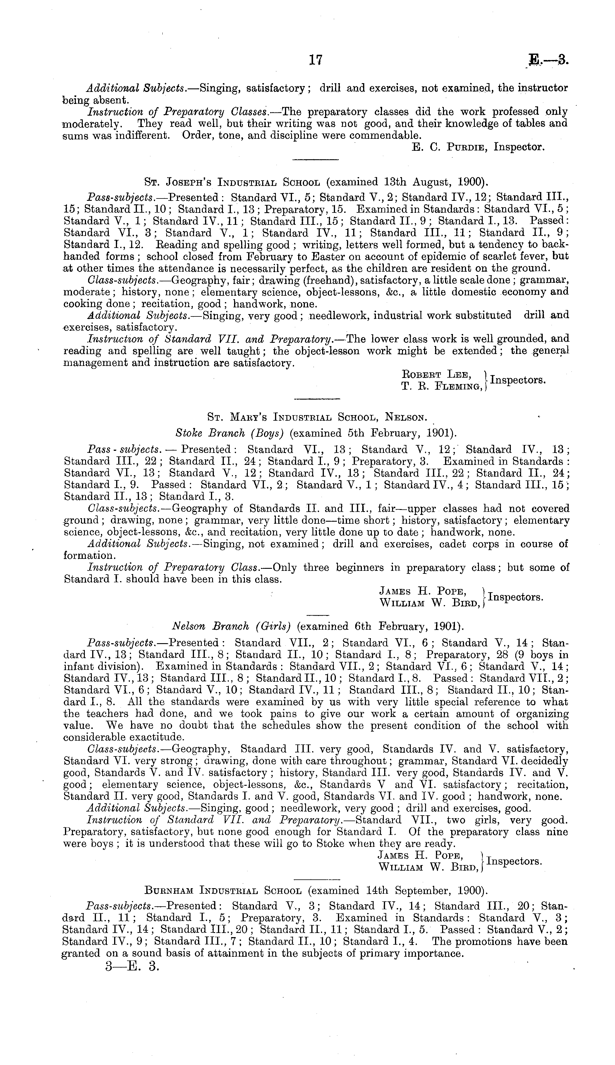 Nelson Branch (Girls) (examined 6th February, 1901). Pass-subjects. —Presented: Standard VII., 2; Standard VI., 6; Standard V., 14; Standard IV., 13; Standard 111., 8; Standard 11., 10; Standard 1., 8; Preparatory, 28 (9 boys in infant division). Examined in Standards : Standard VII., 2; Standard VI., 6; Standard V., 14; Standard IV., 13 ; Standard 111., 8 ; Standard 11., 10 ; Standard 1., 8. Passed : Standard VII., 2 ; Standard VI., 6; Standard V., 10; Standard IV., 11; Standard 111., 8; Standard 11., 10; Standard 1., 8. All the standards were examined by us with very little special reference to what the teachers had done, and we took pains to give our work a certain amount of organizing value. We have no doubt that the schedules show the present condition of the school with considerable exactitude. Glass-subjects. —Geography, Standard 111. very good, Standards IV. and V. satisfactory, Standard VI. very strong ; drawing, done with care throughout; grammar, Standard VI. decidedly good, Standards V. and IV. satisfactory ; history, Standard 111. very good, Standards IV. and V. good; elementary science, object-lessons, &c, Standards V and VI. satisfactory; recitation, Standard 11. very good, Standards I. and V. good, Standards VI. and IV. good ; handwork, none. Additional Subjects. —Singing, good ; needlework, very good ; drill and exercises, good. Instruction of Standard VII. and Preparatory. —Standard VII., two girls, very good. Preparatory, satisfactory, but none good enough for Standard I. Of the preparatory class nine were boys ; it is understood that these will go to Stoke when they are ready. James H. Pope, ) T , William W. Bm D ,) lnSpect ° rS -