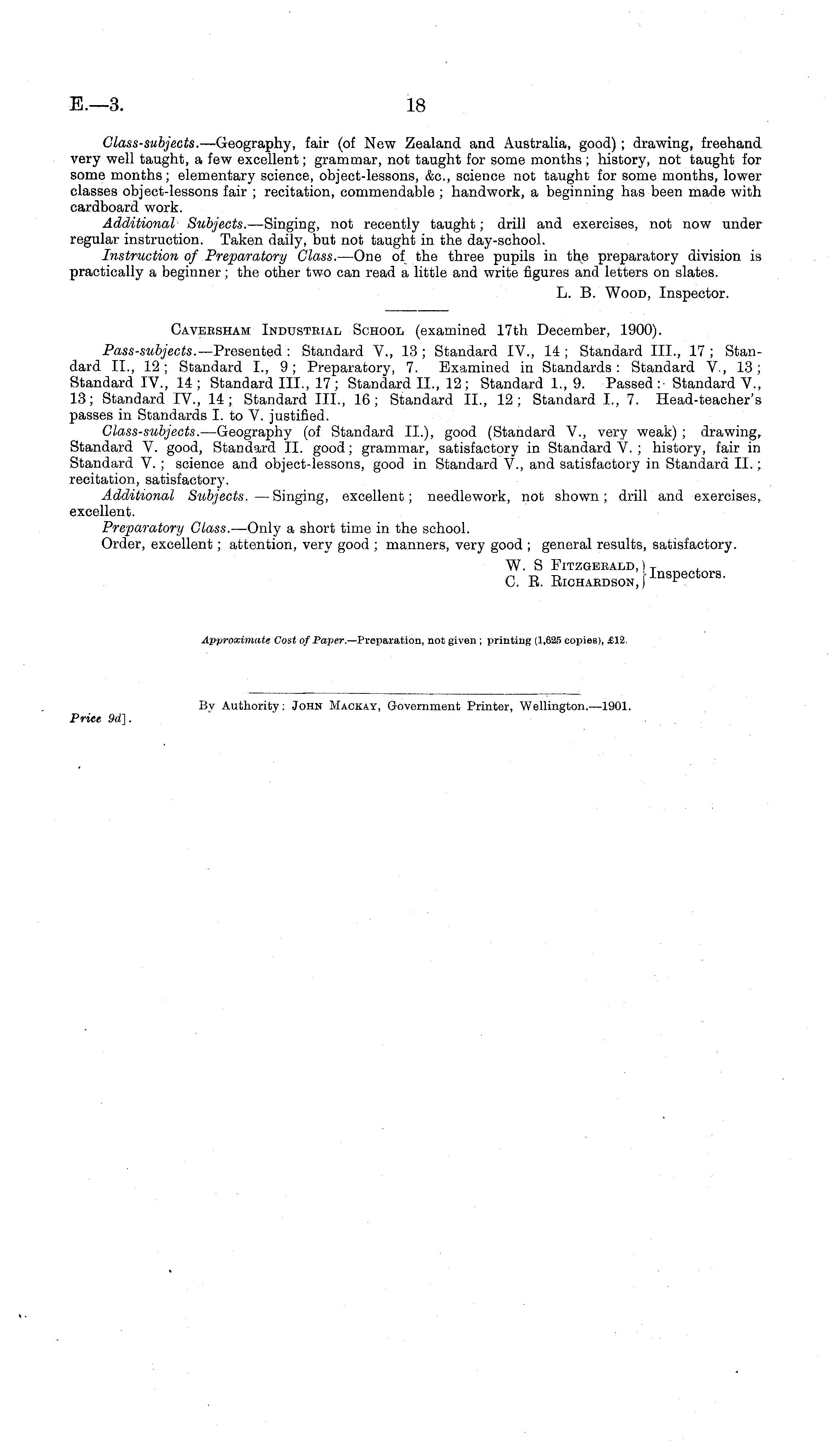 Cavebsham Industeial School (examined 17th December, 1900). Pass-subjects. —Presented : Standard V., 13 ; Standard IV., 14 ; Standard 111., 17 ; Standard 11., 12; Standard 1., 9; Preparatory, 7. Examined in Standards: Standard V., 13; Standard IV., 14; Standard 111., 17; Standard 11., 12; Standard 1., 9. Passed: Standard V., 13; Standard IV., 14; Standard 111., 16; Standard 11., 12; Standard 1., 7. Head-teacher's passes in Standards I. to V. justified. Class-subjects. —Geography (of Standard II.), good (Standard V., very weak) ; drawing, Standard V. good, Standard 11. good; grammar, satisfactory in Standard V. ; history, fair in Standard V. ; science and object-lessons, good in Standard V., and satisfactory in Standard II.; recitation, satisfactory. Additional Subjects. —Singing, excellent; needlework, not shown; drill and exercises, excellent. Preparatory Class. —Only a short time in the school. Order, excellent; attention, very good ; manners, very good ; general results, satisfactory. W. S Fitzgerald, 1 T ,-, -D -o t Inspectors. C. E. Bichardson, j Approximate Cost of Paper. —Preparation, not given; printing (1,625 copies), £12,