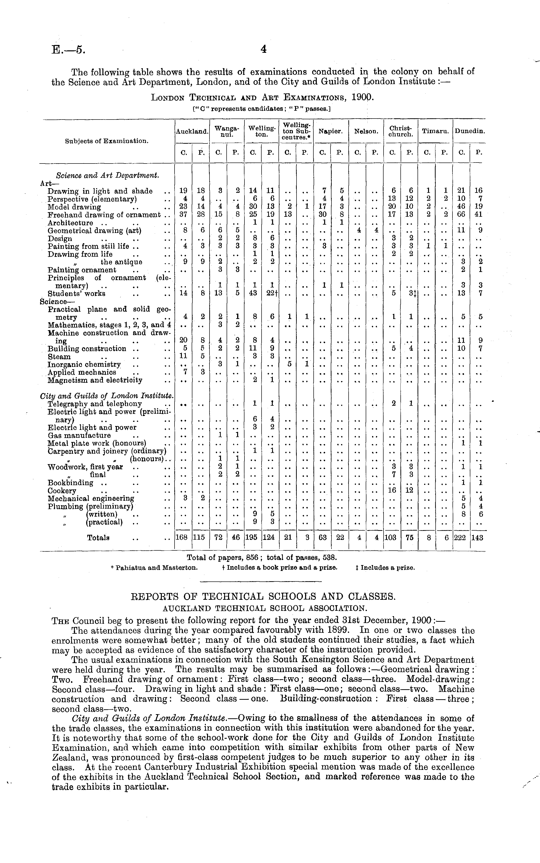 REPORTS OF TECHNICAL SCHOOLS AND CLASSES. AUCKLAND TECHNICAL SCHOOL ASSOCIATION. The Council beg to present the following report for the year ended 31st December, 1900: — The attendances during the year compared favourably with 1899. In one or two classes the enrolments were somewhat better; many of the old students continued their studies, a fact which may be accepted as evidence of the satisfactory character of the instruction provided. The usual examinations in connection with the South Kensington Science and Art Department were held during the year. The results may be summarised as follows:—Geometrical drawing : Two. Freehand drawing of ornament: First class —two; second class —three. Model-drawing: Second class—four. Drawing in light and shade : First class—one; second class—two. Machine construction and drawing: Second class — one. Building-construction: First class — three; second class—two. City and Guilds of London Institute. —Owing to the smallness of the attendances in some of the trade classes, the examinations in connection with this institution were abandoned for the year. It is noteworthy that some of the school-work done for the City and Guilds of London Institute Examination, and which came into competition with similar exhibits from other parts of New Zealand, was pronounced by first-class competent judges to be much superior to any other in its class. At the recent Canterbury Industrial Exhibition special mention was made of the excellence of the exhibits in the Auckland Technical School Section, and marked reference was made to the trade exhibits in particular.