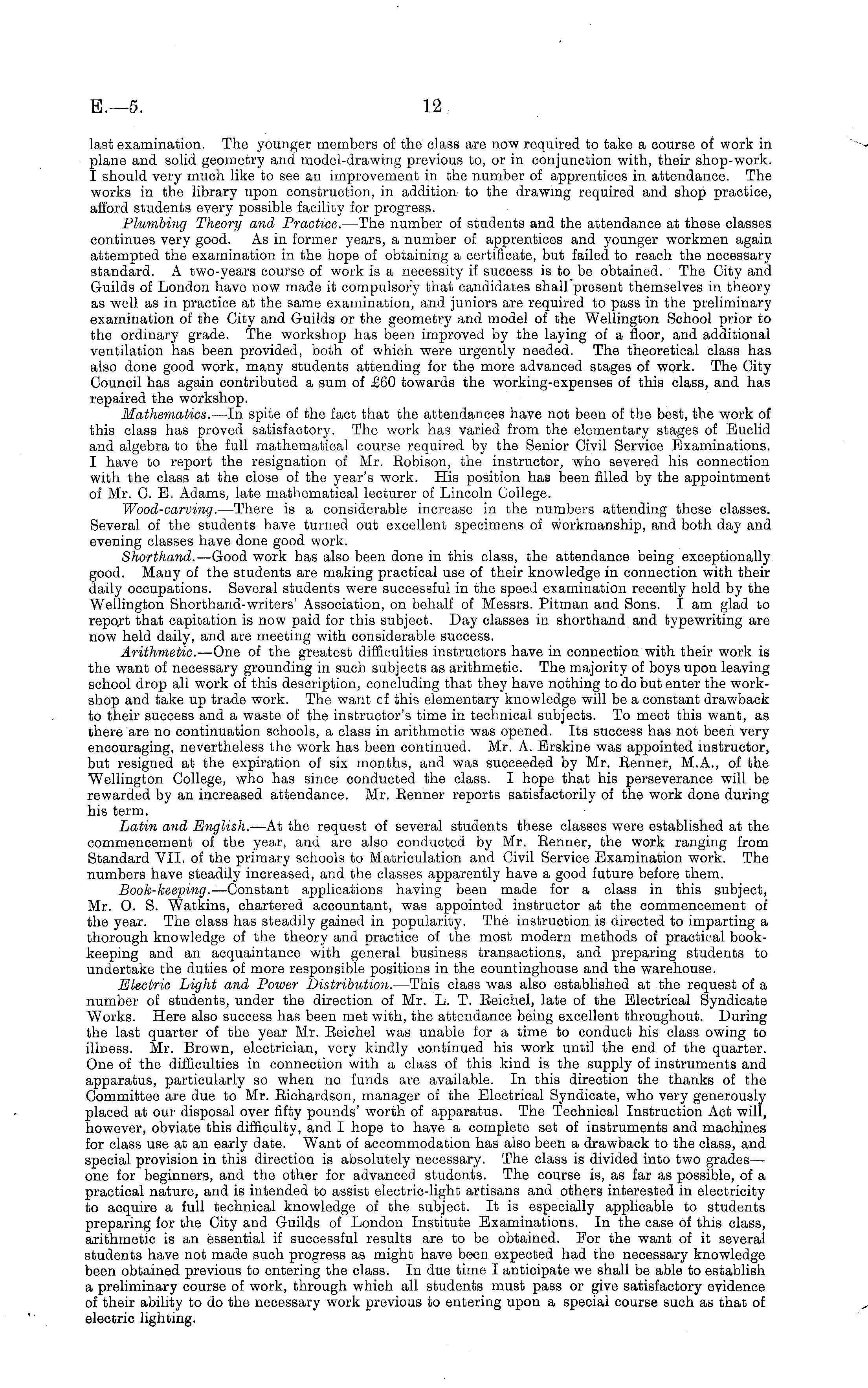 last examination. The younger members of the class are now required to take a course of work in plane and solid geometry and model-drawing previous to, or in conjunction with, their shop-work. I should very much like to see an improvement in the number of apprentices in attendance. The works in the library upon construction, in addition to the drawing required and shop practice, afford students every possible facility for progress. Plumbing Theory and Practice. —The number of students and the attendance at these classes continues very good. As in former years, a number of apprentices and younger workmen again attempted the examination in the hope of obtaining a certificate, but failed to reach the necessary standard. A two-years course of work is a necessity if success is to be obtained. The City and Guilds of London have now made it compulsory that candidates shall present themselves in theory as well as in practice at the same examination, and juniors are required to pass in the preliminary examination of the City and Guilds or the geometry and model of the Wellington School prior to the ordinary grade. The workshop has been improved by the laying of a floor, and additional ventilation has been provided, both of which were urgently needed. The theoretical class has also done good work, many students attending for the more advanced stages of work. The City Council has again contributed a sum of £60 towards the working-expenses of this class, and has repaired the workshop. Mathematics. —In spite of the fact that the attendances have not been of the best, the work of this class has proved satisfactory. The work has varied from the elementary stages of Euclid and algebra to the full mathematical course required by the Senior Civil Service Examinations. I have to report the resignation of Mr. Robison, the instructor, who severed his connection with the class at the close of the year's work. His position has been filled by the appointment of Mr. C. E. Adams, late mathematical lecturer of Lincoln College. Wood-carving. —There is a considerable increase in the numbers attending these classes. Several of the students have turned out excellent specimens of workmanship, and both day and evening classes have done good work. Shorthand. —Good work has also been done in this class, the attendance being exceptionally good. Many of the students are making practical use of their knowledge in connection with their daily occupations. Several students were successful in the speed examination recently held by the Wellington Shorthand-writers' Association, on behalf of Messrs. Pitman and Sons. I am glad to report that capitation is now paid for this subject. Day classes in shorthand and typewriting are now held daily, and are meeting with considerable success. Arithmetic. —One of the greatest difficulties instructors have in connection with their work is the want of necessary grounding in such subjects as arithmetic. The majority of boys upon leaving school drop all work of this description, concluding that they have nothing to do but enter the workshop and take up trade work. The want cf this elementary knowledge will be a constant drawback to their success and a waste of the instructor's time in technical subjects. To meet this want, as there are no continuation schools, a class in arithmetic was opened. Its success has not been very encouraging, nevertheless the work has been continued. Mr. A. Erskine was appointed instructor, but resigned at the expiration of six months, and was succeeded by Mr. Renner, M.A., of the Wellington College, who has since conducted the class. I hope that his perseverance will be rewarded by an increased attendance. Mr. Renner reports satisfactorily of the work done during his term. Latin and English. —At the request of several students these classes were established at the commencement of the year, and are also conducted by Mr. Renner, the work ranging from Standard VII. of the primary schools to Matriculation and Civil Service Examination work. The numbers have steadily increased, and the classes apparently have a good future before them. Book-keeping. —Constant applications having been made for a class in this subject, Mr. O. S. Watkins, chartered accountant, was appointed instructor at the commencement of the year. The class has steadily gained in popularity. The instruction is directed to imparting a thorough knowledge of the theory and practice of the most modern methods of practical bookkeeping and an acquaintance with general business transactions, and preparing students to undertake the duties of more responsible positions in the countinghouse and the warehouse. Electric Light and Power Distribution. —This class was also established at the request of a number of students, under the direction of Mr. L. T. Reichel, late of the Electrical Syndicate Works. Here also success has been met with, the attendance being excellent throughout. During the last quarter of the year Mr. Reichel was unable for a time to conduct his class owing to illness. Mr. Brown, electrician, very kindly continued his work until the end of the quarter. One of the difficulties in connection with a class of this kind is the supply of instruments and apparatus, particularly so when no funds are available. In this direction the thanks of the Committee are due to Mr. Richardson, manager of the Electrical Syndicate, who very generously placed at our disposal over fifty pounds' worth of apparatus. The Technical Instruction Act will, however, obviate this difficulty, and I hope to have a complete set of instruments and machines for class use at an early date. Want of accommodation has also been a drawback to the class, and special provision in this direction is absolutely necessary. The class is divided into two grades— one for beginners, and the other for advanced students. The course is, as far as possible, of a practical nature, and is intended to assist electric-light artisans and othe
