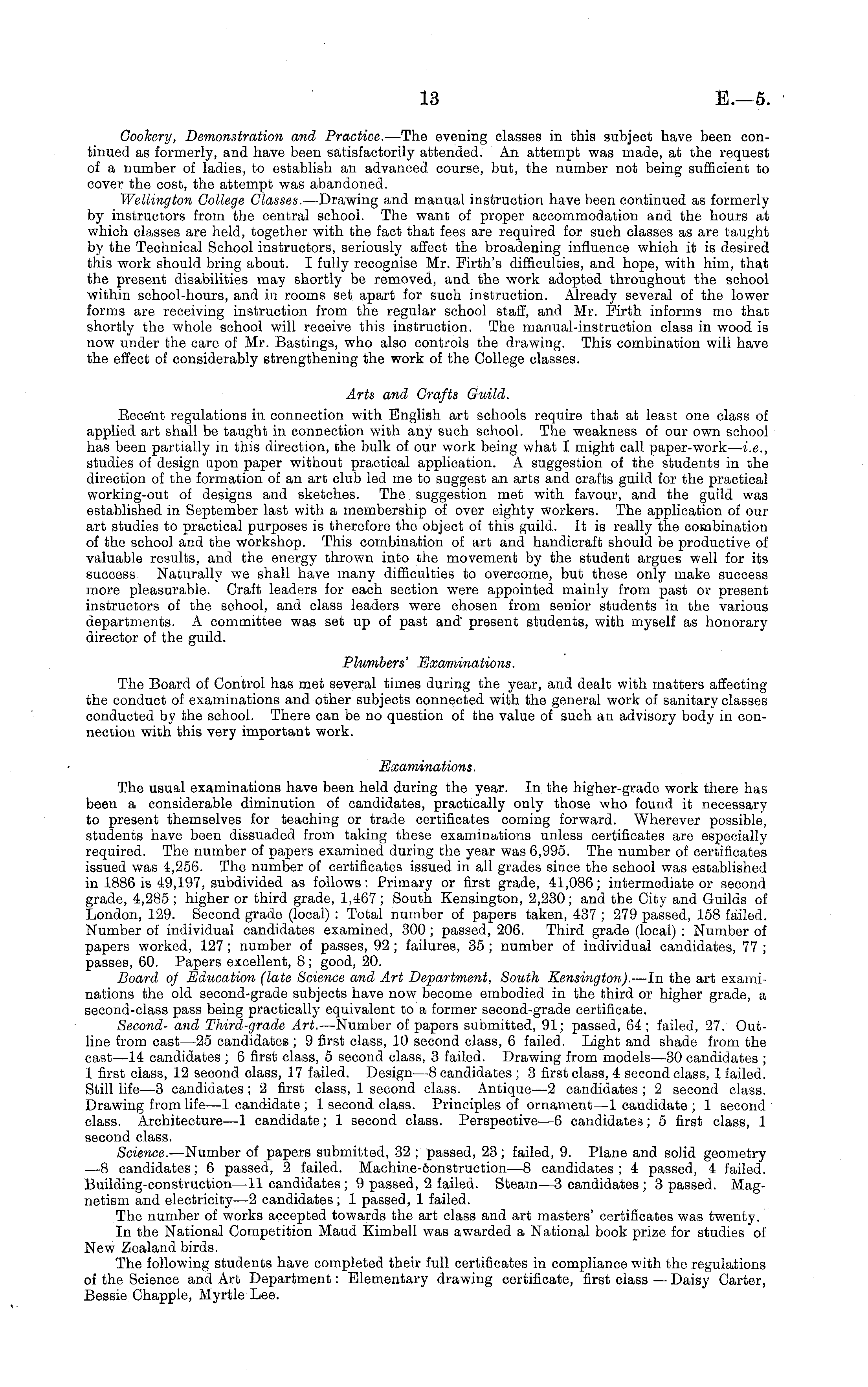 Cookery, Demonstration and Practice. —The evening classes in this subject have been continued as formerly, and have been satisfactorily attended. An attempt was made, at the request of a number of ladies, to establish an advanced course, but, the number not being sufficient to cover the cost, the attempt was abandoned. Wellington College Classes. —Drawing and manual instruction have been continued as formerly by instructors from the central school. The want of proper accommodation and the hours at which classes are held, together with the fact that fees are required for such classes as are taught by the Technical School instructors, seriously affect the broadening influence which it is desired this work should bring about. I fully recognise Mr. Firth's difficulties, and hope, with him, that the present disabilities may shortly be removed, and the work adopted throughout the school within school-hours, and in rooms set apart for such instruction. Already several of the lower forms are receiving instruction from the regular school staff, and Mr. Firth informs me that shortly the whole school will receive this instruction. The manual-instruction class in wood is now under the care of Mr. Bastings, who also controls the drawing. This combination will have the effect of considerably strengthening the work of the College classes. Arts and Grafts Guild. Recetot regulations in connection with English art schools require that at least one class of applied art shall be taught in connection with any such school. The weakness of our own school has been partially in this direction, the bulk of our work being what I might call paper-work— i.e., studies of design upon paper without practical application. A suggestion of the students in the direction of the formation of an art club led me to suggest an arts and crafts guild for the practical working-out of designs and sketches. The suggestion met with favour, and the guild was established in September last with a membership of over eighty workers. The application of our art studies to practical purposes is therefore the object of this guild. It is really the combination of the school and the workshop. This combination of art and handicraft should be productive of valuable results, and the energy thrown into the movement by the student argues well for its success. Naturally we shall have many difficulties to overcome, but these only make success more pleasurable. Craft leaders for each section were appointed mainly from past or present instructors of the school, and class leaders were chosen from senior students in the various departments. A committee was set up of past and' present students, with myself as honorary director of the guild. Plumbers' Examinations. The Board of Control has met several times during the year, and dealt with matters affecting the conduct of examinations and other subjects connected with the general work of sanitary classes conducted by the school. There can be no question of the value of such an advisory body in connection with this very important work. Examinations. The usual examinations have been held during the year. In the higher-grade work there has been a considerable diminution of candidates, practically only those who found it necessary to present themselves for teaching or trade certificates coming forward. Wherever possible, students have been dissuaded from taking these examinations unless certificates are especially required. The number of papers examined during the year was 6,995. The number of certificates issued was 4,256. The number of certificates issued in all grades since the school was established in 1886 is 49,197, subdivided as follows: Primary or first grade, 41,086; intermediate or second grade, 4,285 ; higher or third grade, 1,467; South Kensington, 2,230; and the City and Guilds of London, 129. Second grade (local) : Total number of papers taken, 437 ; 279 passed, 158 failed. Number of individual candidates examined, 300; passed, 206. Third grade (local) : Number of papers worked, 127 ; number of passes, 92 ; failures, 35 ; number of individual candidates, 77 ; passes, 60. Papers excellent, 8; good, 20. Board of Education (late Science and Art Department, South Kensington). —ln the art examinations the old second-grade subjects have now become embodied in the third or higher grade, a second-class pass being practically equivalent to a former second-grade certificate. Second- and Third-grade Art. —Number of papers submitted, 91; passed, 64; failed, 27. Outline from cast —25 candidates ; 9 first class, 10 second class, 6 failed. Light and shade from the cast —14 candidates ; 6 first class, 5 second class, 3 failed. Drawing from models —30 candidates ; 1 first class, 12 second class, 17 failed. Design—B candidates ; 3 first class, 4 second class, 1 failed. Still life—3 candidates; 2 first class, 1 second class. Antique—2 candidates ; 2 second class. Drawing from life—l candidate ; 1 second class. Principles of ornament—l candidate ; 1 second class. Architecture—l candidate; 1 second class. Perspective—6 candidates; 5 first class, 1 second class. Science. —Number of papers submitted, 32 ; passed, 23; failed, 9. Plane and solid geometry —8 candidates; 6 passed, 2 failed. Machine-construction —8 candidates ; 4 passed, 4 failed. Building-construction —11 candidates ; 9 passed, 2 failed. Steam—3 candidates ; 3 passed. Magnetism and electricity—2 candidates; 1 passed, 1 failed. The number of works accepted towards the art class and art masters' certificates was twenty. In the National Competition Maud Kimbell was awarded a National book prize for studies of New Zealand birds. The following students have completed their full certificates in compliance with the regulations of the Science and Art Department: Elementary drawing certificate, first class — Daisy Carter, Bessie Chappie, Myrtle Lee.