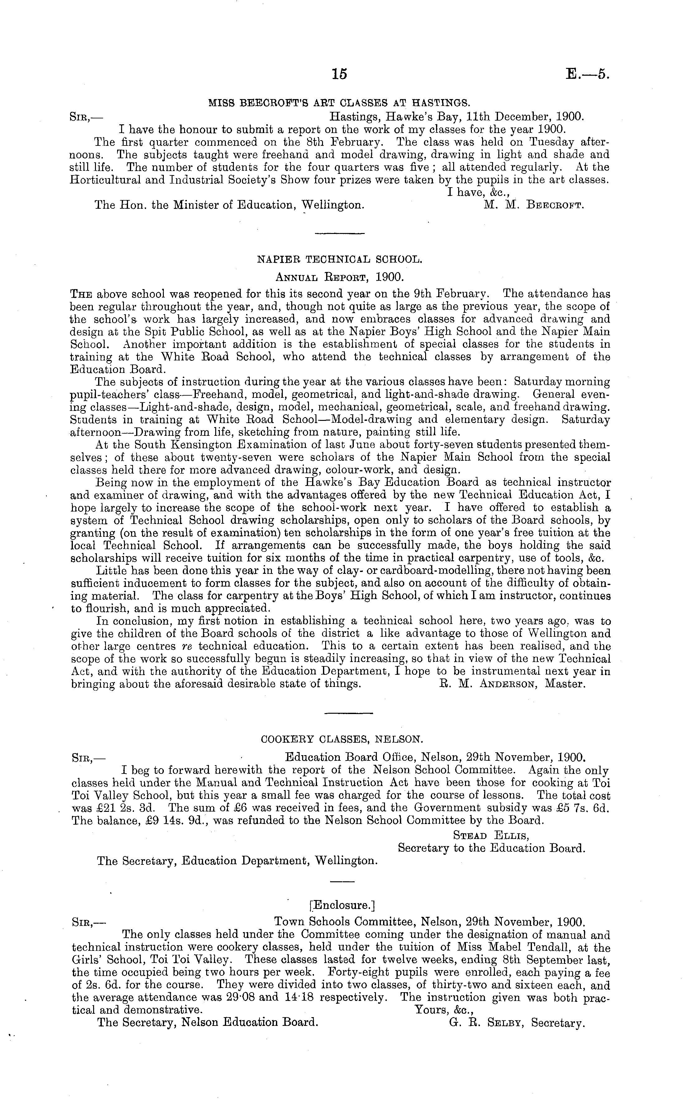 [Enclosure.] Sir, — Town Schools Committee, Nelson, 29th November, 1900. The only classes held under the Committee coming under the designation of manual and technical instruction were cookery classes, held under the tuition of Miss Mabel Tendall, at the Girls' School, Toi Toi Valley. These classes lasted for twelve weeks, ending Bth September last, the time occupied being two hours per week. Forty-eight pupils were enrolled, each paying a fee of 2s. 6d. for the course. They were divided into two classes, of thirty-two and sixteen each, and the average attendance was 29-08 and 14-18 respectively. The instruction given was both practical and demonstrative. Yours, &c, The Secretary, Nelson Education Board. G. R. Selby, Secretary.