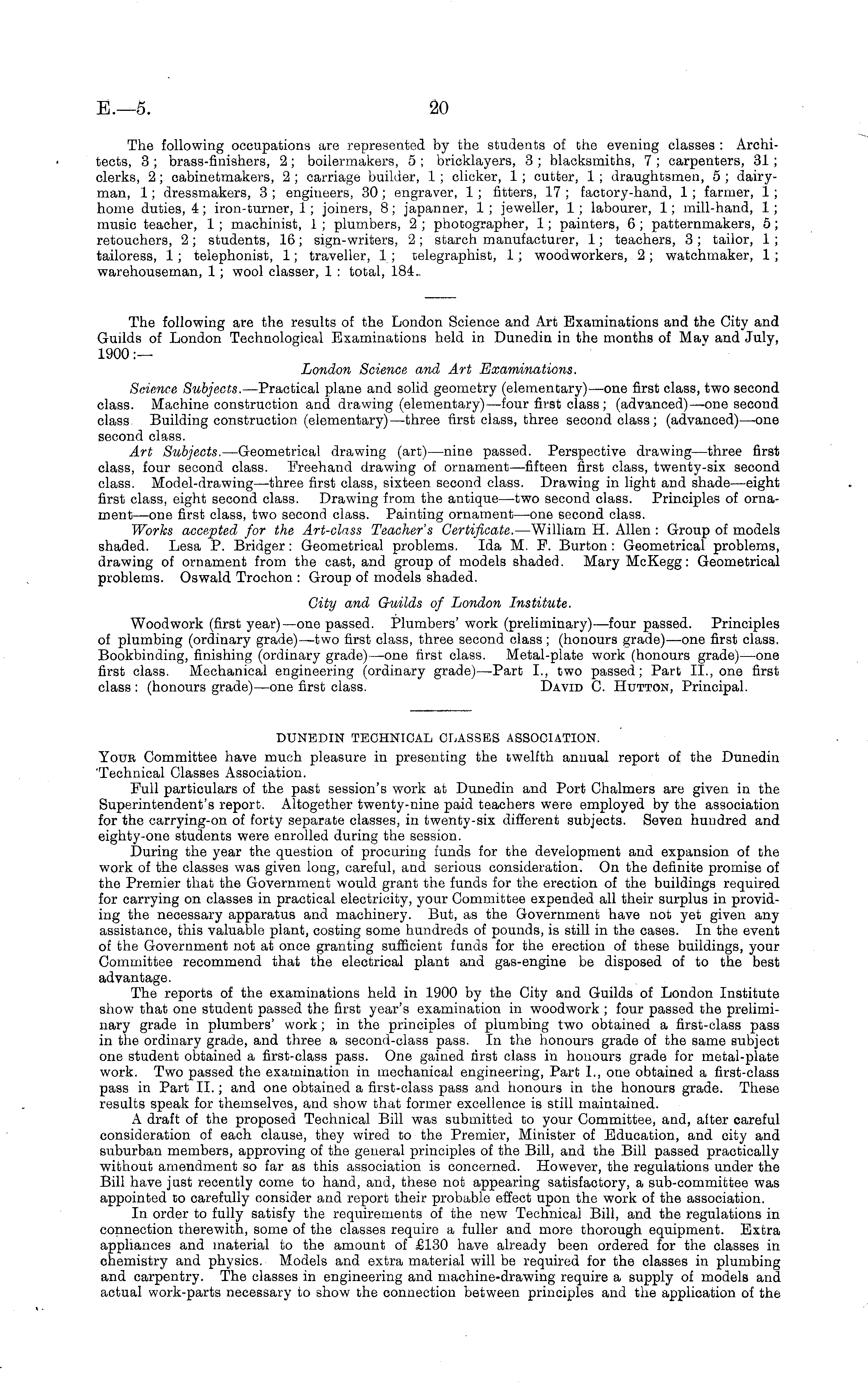 The following are the results of the London Science and Art Examinations and the City and Guilds of London Technological Examinations held in Dunedin in the months of May and July, 1900 :— London Science and Art Examinations. Science Subjects. —Practical plane and solid geometry (elementary)—one first class, two second class. Machine construction and drawing (elementary)—four first class ; (advanced) —-one second class. Building construction (elementary)—three first class, three second class ; (advanced) —one second class. Art Subjects. —Geometrical drawing (art) —nine passed. Perspective drawing —three first class, four second class. Freehand drawing of ornament —fifteen first class, twenty-six second class. Model-drawing—three first class, sixteen second class. Drawing in light and shade—eight first class, eight second class. Drawing from the antique—two second class. Principles of ornament—one first class, two second class. Painting ornament —one second class. Works accepted for the Art-class Teacher's Certificate. —William H. Allen : Group of models shaded. Lesa P. Bridger : Geometrical problems. Ida M. F. Burton : Geometrical problems, drawing of ornament from the cast, and group of models shaded. Mary McKegg: Geometrical problems. Oswald Trochon : Group of models shaded. City and Guilds of London Institute. Woodwork (first year) —one passed. Plumbers' work (preliminary)—four passed. Principles of plumbing (ordinary grade)—two first class, three second class; (honours grade)—one first class. Bookbinding, finishing (ordinary grade)—one first class. Metal-plate work (honours grade)—one first class. Mechanical engineering (ordinary grade)— Part 1., two passed; Part 11., one first class : (honours grade) —one first class. David C. Hutton, Principal. DUNEDIN TECHNICAL CLASSES ASSOCIATION. Your Committee have much pleasure in presenting the twelfth annual report of the Dunedin 'Technical Classes Association. Full particulars of the past session's work at Dunedin and Port Chalmers are given in the Superintendent's report. Altogether twenty-nine paid teachers were employed by the association for the carrying-on of forty separate classes, in twenty-six different subjects. Seven hundred and eighty-one students were enrolled during the session. During the year the question of procuring funds for the development and expansion of the work of the classes was given long, careful, and serious consideration. On the definite promise of the Premier that the Government would grant the funds for the erection of the buildings required for carrying on classes in practical electricity, your Committee expended all their surplus in providing the necessary apparatus and machinery. But, as the Government have not yet given any assistance, this valuable plant, costing some hundreds of pounds, is still in the cases. In the event of the Government not at once granting sufficient funds for the erection of these buildings, your Committee recommend that the electrical plant and gas-engine be disposed of to the best advantage. The reports of the examinations held in 1900 by the City and Guilds of London Institute show that one student passed the first year's examination in woodwork ; four passed the preliminary grade in plumbers' work; in the principles of plumbing two obtained a first-class pass in the ordinary grade, and three a second-class pass. In the honours grade of the same subject one student obtained a first-class pass. One gained first class in honours grade for metal-plate work. Two passed the examination in mechanical engineering, Part 1., one obtained a first-class pass in Part II.; and one obtained a first-class pass and honours in the honours grade. These results speak for themselves, and show that former excellence is still maintained. A draft of the proposed Technical Bill was submitted to your Committee, and, after careful consideration of each clause, they wired to the Premier, Minister of Education, and city and suburban members, approving of the general principles of the Bill, and the Bill passed practically without amendment so far as this association is concerned. However, the regulations under the Bill have just recently come to hand, and, these not appearing satisfactory, a sub-committee was appointed to carefully consider and report their probable effect upon the work of the association. In order to fully satisfy the requirements of the new Technical Bill, and the regulations in connection therewith, some of the classes require a fuller and more thorough equipment. Extra appliances and material to the amount of £130 have already been ordered for the classes in chemistry and physics. Models and extra material will be required for the classes in plumbing and carpentry. The classes in engineering and machine-drawing require a supply of models and actual work-parts necessary to show the connection between principles and the application of the
