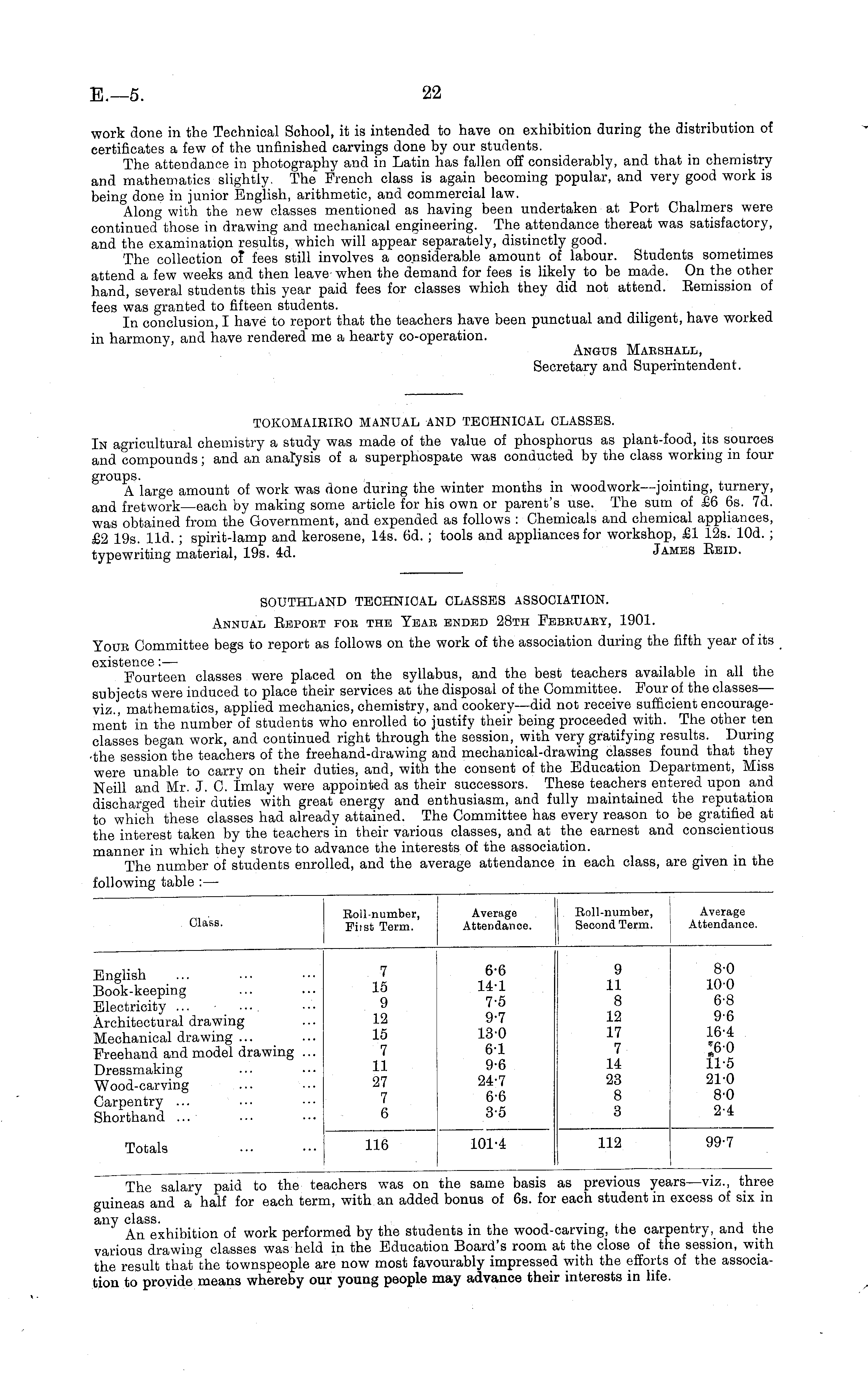 work done in the Technical School, it is intended to have on exhibition during the distribution of certificates a few of the unfinished carvings done by our students. The attendance in photography and in Latin has fallen off considerably, and that in chemistry and mathematics slightly. The French class is again becoming popular, and very good work is being done in junior English, arithmetic, and commercial law. Along with the new classes mentioned as having been undertaken at Port Chalmers were continued those in drawing and mechanical engineering. The attendance thereat was satisfactory, and the examination results, which will appear separately, distinctly good. The collection of fees still involves a considerable amount of labour. Students sometimes attend a few weeks and then leave when the demand for fees is likely to be made. On the other hand, several students this year paid fees for classes which they did not attend. Remission of fees was granted to fifteen students. In conclusion, I have to report that the teachers have been punctual and diligent, have worked in harmony, and have rendered me a hearty co-operation. Angus Marshall, Secretary and Superintendent.