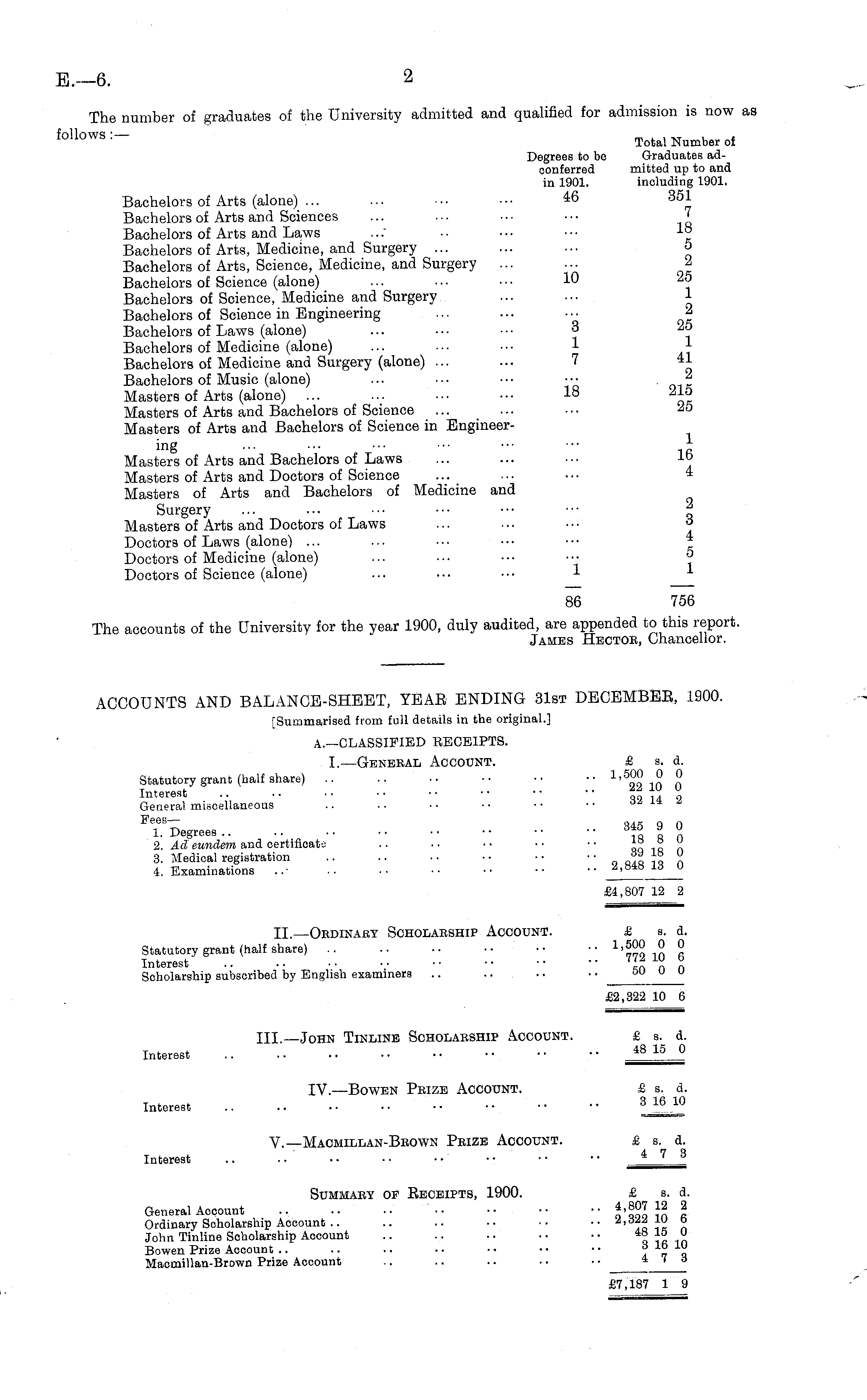 The number of graduates of the University admitted and qualified for admission is now as fOIIOWS : ~ Total Number of Degrees to be Graduates adoonferred mitted up to and in 1901. including 1901. Bachelors of Arts (alone) ... ... ••• •■• 46 351 Bachelors of Arts and Sciences ... ... ••■ ••• ' Bachelors of Arts and Laws ..." • • • • • • • • 1° Bachelors of Arts, Medicine, and Surgery ... Bachelors of Arts, Science, Medicine, and Surgery ... ... Bachelors of Science (alone) ... •■■ ••• 1° 2 ° Bachelors of Science, Medicine and Surgery ... ... 1 Bachelors of Science in Engineering ... ... ••• Bachelors of Laws (alone) ... ■•■ ••• 3 25 Bachelors of Medicine (alone) ... ... • ■ • 1 Bachelors of Medicine and Surgery (alone) ... ... 7 41 Bachelors of Music (alone) ... • • • • • • • • • * Masters of Arts (alone) ... ... ••• •■■ 1° A Y> Masters of Arts and Bachelors of Science ... ... ••• Masters of Arts and Bachelors of Science in Engineerins ... ■ • • *•■ ■ • ■ ■ • • *•* Masters of Arts and Bachelors of Laws ... ... ••■ 16 Masters of Arts and Doctors of Science Masters of Arts and Bachelors of Medicine and Surgery ... ... ••• ■■• ••• ••• <? Masters of Arts and Doctors of Laws ... ■ • ■ • • • ° Doctors of Laws (alone) ... ... • • • • • • ■ • • * Doctors of Medicine (alone) Doctors of Science (alone) ... ••• ••• 1 ■*• 86 756 The accounts of the University for the year 1900, duly audited, are appended to this report. James Hbctoe, Chancellor.