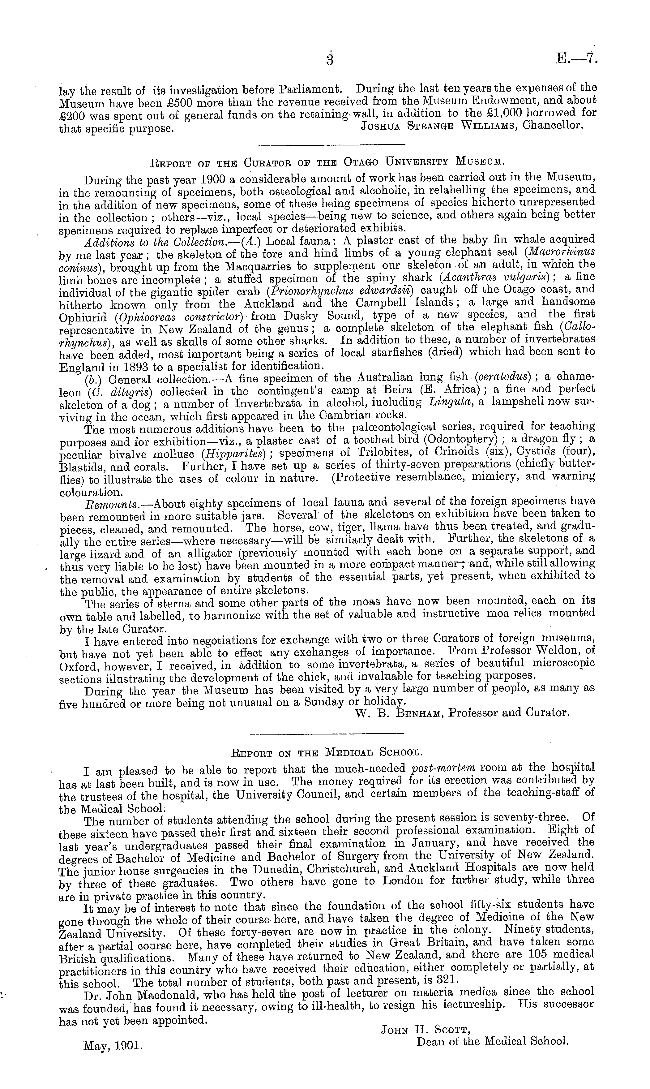 Beport of the Curator of the Otago Univeesity Museum. During the past year 1900 a considerable amount of work has been carried out in the Museum, in the remounting of specimens, both osteological and alcoholic, in relabelling the specimens, and in the addition of new specimens, some of these being specimens of species hitherto unrepresented in the collection ; others—viz., local species—being new to science, and others again being better specimens required to replace imperfect or deteriorated exhibits. Additions to the Collection.—(A.) Local fauna: A plaster cast of the baby fin whale acquired by me last year; the skeleton of the fore and hind limbs of a young elephant seal (Macrorhmus coninus), brought up from the Macquarries to supplement our skeleton of an adult, in which the limb bones are incomplete ; a stuffed specimen of the spiny shark (Acanthras vulgaris) ; a fine individual of the gigantic spider crab (Prionorhynchus edwardsii) caught off the Otago coast, and hitherto known only from the Auckland and the Campbell Islands; a large and handsome Ophiurid (Ophiocreas constrictor) from Dusky Sound, type of a new species, and the first representative in New Zealand of the genus; a complete skeleton of the elephant fish (Gallorhynchus), as well as skulls of some other sharks. In addition to these, a number of invertebrates have been added, most important being a series of local starfishes (dried) which had been sent to England in 1893 to a specialist for identification. (b.) General collection.—A fine specimen of the Australian lung fish (ceratodus) ; a chameleon (G. diligris) collected in the contingent's camp at Beira (E. Africa) ; a fine and perfect skeleton of a dog ; a number of Invertebrata in alcohol, including Lingula, a lampshell now surviving in the ocean, which first appeared in the Cambrian rooks. The most numerous additions have been to the palceontological series, required for teaching purposes and for exhibition—viz., a plaster cast of a toothed bird (Odontoptery) ; a dragon fly ; a peculiar bivalve mollusc (Hipparites) ; specimens of Trilobites, of Crinoids (six), Cystids (four), Blastids, and corals. Further, I have set up a series of thirty-seven preparations (chiefly butterflies) to illustrate the uses of colour in nature. (Protective resemblance, mimicry, and warning colouration. Bemounts— About eighty specimens of local fauna and several of the foreign specimens have been remounted in more suitable jars. Several of the skeletons on exhibition have been taken to pieces, cleaned, and remounted. The horse, cow, tiger, llama have thus been treated, and gradually the entire series—where necessary—will be similarly dealt with. Further, the skeletons of a large lizard and of an alligator (previously mounted with each bone on a separate support, and thus very liable to be lost) have been mounted in a more compact manner; and, while still allowing the removal and examination by students of the essential parts, yet present, when exhibited to the public, the appearance of entire skeletons. The series of sterna and some other parts of the moas have now been mounted, each on its own table and labelled, to harmonize with the set of valuable and instructive moa relics mounted by the late Curator. I have entered into negotiations for exchange with two or three Curators oi foreign museums, but have not yet been able to effect any exchanges of importance. From Professor Weldon, of Oxford, however, I received, in addition to some invertebrata, a series of beautiful microscopic sections illustrating the development of the chick, and invaluable for teaching purposes. During the year the Museum has been visited by a very large number of people, as many as five hundred or more being not unusual on a Sunday or holiday. W. B. Benham, Professor and Curator.