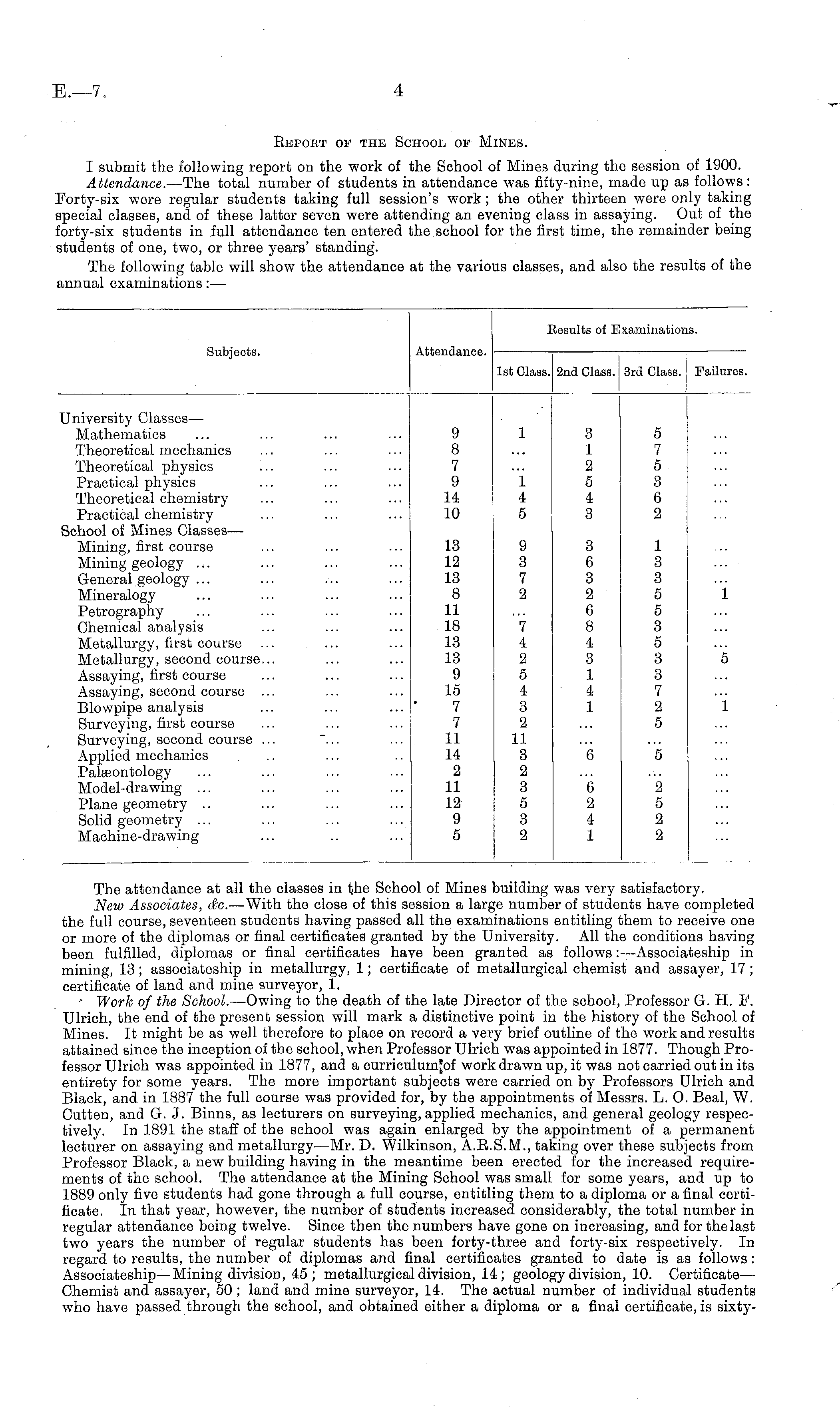 Bepoet of the School of Mines. I submit the following report on the work of the School of Mines during the session of 1900. Attendance. —The total number of students in attendance was fifty-nine, made up as follows: Forty-six were regular students taking full session's work; the other thirteen were only taking special classes, and of these latter seven were attending an evening class in assaying. Out of the forty-six students in full attendance ten entered the school for the first time, the remainder being students of one, two, or three years' standing". The following table will show the attendance at the various classes, and also the results of the annual examinations:—
