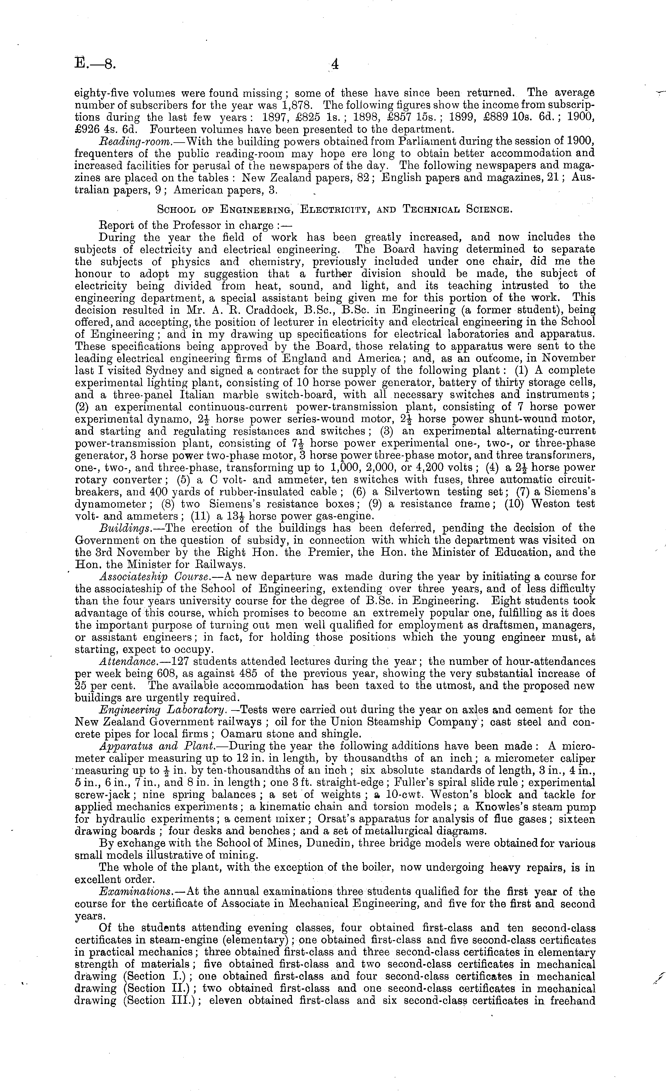 eighty-five volumes were found missing ; some of these have since been returned. The average number of subscribers for the year was 1,878. The following figures show the income from subscriptions during the last few years : 1897, £825 Is. ; 1898, £857 15s. ; 1899, £889 10s. 6d.; 1900, £926 4s. 6d. Fourteen volumes have been presented to the department. Beading-room. —With the building powers obtained from Parliament during the session of 1900, frequenters of the public reading-room may hope ere long to obtain better accommodation and increased facilities for perusal of the newspapers of the day. The following newspapers and magazines are placed on the tables : New Zealand papers, 82 ; English papers and magazines, 21; Australian papers, 9 ; American papers, 3. School op Engineering, Electricity, and Technical Science. Report of the Professor in charge : — During the year the field of work has been greatly increased, and now includes the subjects of electricity and electrical engineering. The Board having determined to separate the subjects of physics and chemistry, previously included under one chair, did me the honour to adopt my suggestion that a further division should be made, the subject of electricity being divided from heat, sound, and light, and its teaching intrusted to the engineering department, a special assistant being given me for this portion of the work. This decision resulted in Mr. A. R. Craddock, B.Sc, B.Sc. in Engineering (a former student), being offered, and accepting, the position of lecturer in electricity and electrical engineering in the School of Engineering ; and in my drawing up specifications for electrical laboratories and apparatus. These specifications being approved by the Board, those relating to apparatus were sent to the leading electrical engineering firms of England and America; and, as an outcome, in November last I visited Sydney and signed a contract for the supply of the following plant : (1) A complete experimental lighting plant, consisting of 10 horse power generator, battery of thirty storage cells, and a three-panel Italian marble switch-board, with all necessary switches and instruments ; (2) an experimental continuous-current power-transmission plant, consisting of 7 horse power experimental dynamo, 2£ horse power series-wound motor, 2-J horse power shunt-wound motor, and starting and regulating resistances and switches ; (3) an experimental alternating-current power-transmission plant, consisting of 7-j horse power experimental one-, two-, or three-phase generator, 3 horse power two-phase motor, 3 horse power three-phase motor, and three transformers, one-, two-, and three-phase, transforming up to 1,000, 2,000, or 4,200 volts ; (4) a 2J horse power rotary converter; (5) a C volt- and ammeter, ten switches with fuses, three automatic circuitbreakers, and 400 yards of rubber-insulated cable; (6) a Silvertown testing set; (7) a Siemens's dynamometer; (8) two Siemens's resistance boxes; (9) a resistance frame; (10) Weston test volt- and ammeters ; (11) a 13J horse power gas-engine. Buildings. —The erection of the buildings has been deferred, pending the decision of the Government on the question of subsidy, in connection with which the department was visited on the 3rd November by the Right Hon. the Premier, the Hon. the Minister of Education, and the Hon. the Minister for Railways. Associateship Course. —A new departure was made during the year by initiating a course for the associateship of the School of Engineering, extending over three years, and of less difficulty than the four years university course for the degree of B.Sc. in Engineering. Eight students took advantage of this course, which promises to become an extremely popular one, fulfilling as it does the important purpose of turning out men well qualified for employment as draftsmen, managers, or assistant engineers; in fact, for holding those positions which the young engineer must, at starting, expect to occupy. Attendance. —l 27 students attended lectures during the year; the number of hour-attendances per week being 608, as against 485 of the previous year, showing the very substantial increase of 25 per cent. The available accommodation has been taxed to the utmost, and the proposed new buildings are urgently required. Engineering Laboratory. —Tests were carried out during the year on axles and cement for the New Zealand Government railways ; oil for the Union Steamship Company ; cast steel and concrete pipes for local firms ; Oamaru stone and shingle. Apparatus and Plant. —During the year the following additions have been made : A micrometer caliper measuring up to 12 in. in length, by thousandths of an inch; a micrometer caliper measuring up to -J- in. by ten-thousandths of an inch ; six absolute standards of length, 3 in., 4 in., 5 in., 6 in., 7 in., and 8 in. in length; one 3 ft. straight-edge ; Fuller's spiral slide rule ; experimental screw-jack; nine spring balances; a set of weights; a 10-cwt. Weston's block and tackle for applied mechanics experiments ; a kinematic chain and torsion models; a Knowies's steam pump for hydraulic experiments; a cement mixer; Orsat's apparatus for analysis of flue gases; sixteen drawing boards ; four desks and benches ; and a set of metallurgical diagrams. By exchange with the School of Mines, Dunedin, three bridge models were obtained for various small models illustrative of mining. The whole of the plant, with the exception of the boiler, now undergoing heavy repairs, is in excellent order. Examinations. —At the annual examinations three students qualified for the first year of the course for the certificate of Associate in Mechanical Engineering, and five for the first and second years. Of the students attending evening classes, four obtained first-class and ten second-class certificates in steam-engine (elementary); one obtained first-class and five second-class certificates in practical mechanics; three obtain