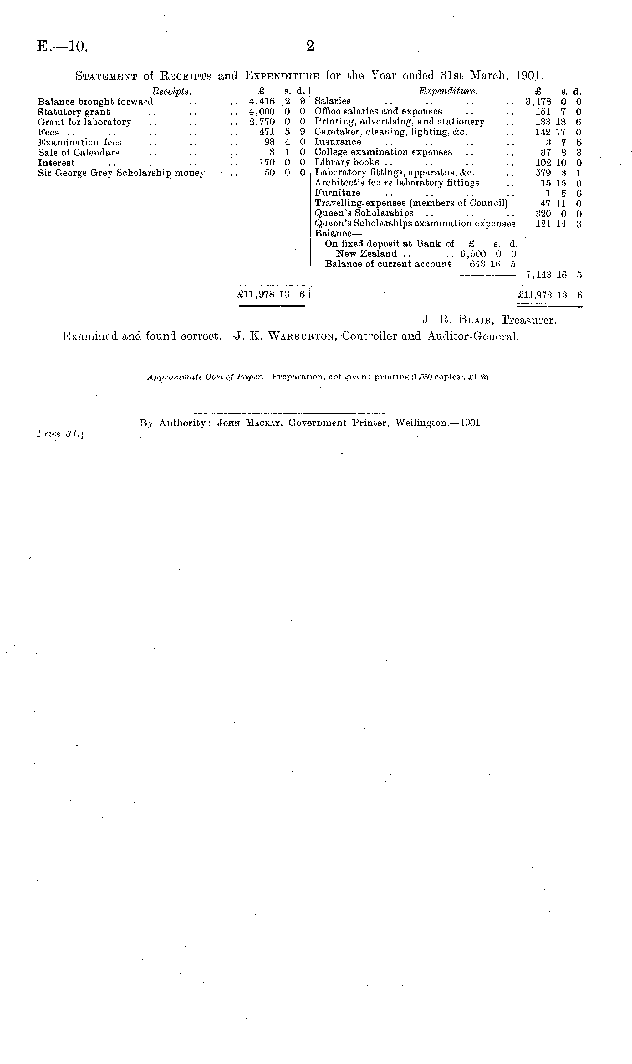 Statement of Beceipts and Expendituee for the Year ended 31st March, 1901. Receipts. £ s. d. Expenditure. £ s. d. Balanoe brought forward .. .. 4,416 2 9 Salaries .. .. .. .. 3,178 0 0 Statutory grant .. .. .. 4,000 0 0 Office salaries and expenses .. .. 151 7 0 Grant for laboratory .. .. .. 2,770 0 0 Printing, advertising, and stationery .. 133 18 6 Fees .. .. .. .. .. 471 5 9 Caretaker, cleaning, lighting, &c. .. 142 17 0 Examination fees .. .. .. 98 4 0 Insurance .. .. .. .. 376 Sale of Calendars .. .. ' .. 3 10 College examination expenses .. .. 37 8 3 Interest .. .. .. '.. 170 0 0 Library books .. .. .. .. 102 10 0 Sir George Grey Scholarship money • .. 50 0 0 Laboratory fitting*, apparatus, &c. .. 579 3 1 Architect's fee re laboratory fittings .. 15 15 0 Furniture .. .. .. .. 15 6 Travelling-expenses (members of Council) 47 11 0 Queen's Scholarships .. .. .. 320 0 0 Queen's Scholarships examination expenses 121 14 3 Balanoe — On fixed deposit at Bank of £ s. d. New Zealand .. .. 6,500 0 0 Balance of current account 643 16 5 7,143 16 5 £11,978 13 6 I £11,978 13 6 J. B. Blair, Treasurer. Examined and found correct.—J. K. Waebueton, Controller and Auditor-General. Approximate Cost of Paper. —Preparation, not given ; printing (1,550 copies), i'l 2s.