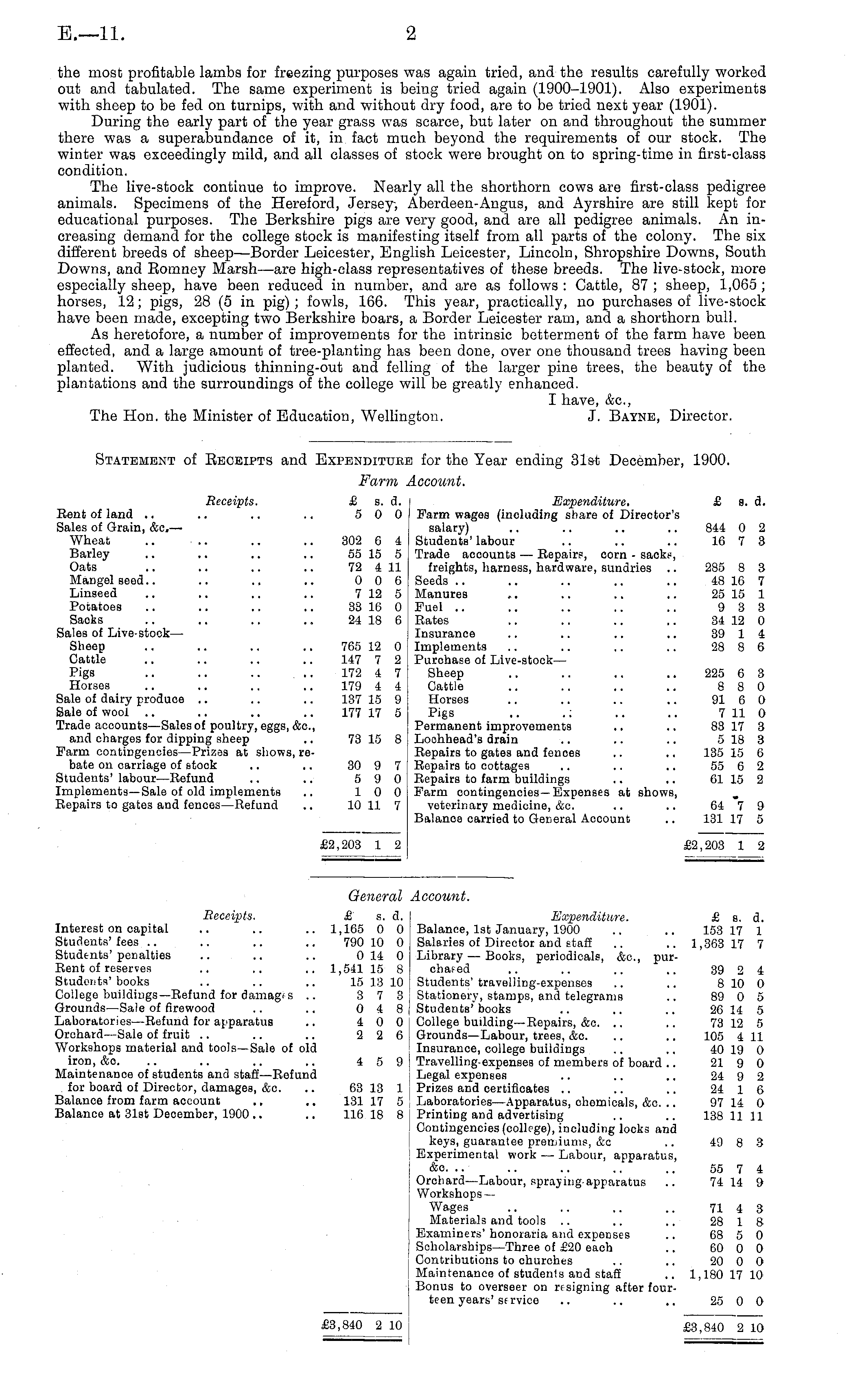 the most profitable lambs for freezing purposes was again tried, and the results carefully worked out and tabulated. The same experiment is being tried again (1900-1901). Also experiments with sheep to be fed on turnips, with and without dry food, are to be tried next year (1901). During the early part of the year grass was scarce, but later on and throughout the summer there was a superabundance of it, in fact much beyond the requirements of our stock. The winter was exceedingly mild, and all classes of stock were brought on to spring-time in first-class condition. The live-stock continue to improve. Nearly all the shorthorn cows are first-class pedigree animals. Specimens of the Hereford, Jersey-, Aberdeen-Angus, and Ayrshire are still kept for educational purposes. The Berkshire pigs are very good, and are all pedigree animals. An increasing demand for the college stock is manifesting itself from all parts of the colony. The six different breeds of sheep—Border Leicester, English Leicester, Lincoln, Shropshire Downs, South Downs, and Bomney Marsh—are high-class representatives of these breeds. The live-stock, more especially sheep, have been reduced in number, and are as follows : Cattle, 87 ; sheep, 1,065; horses, 12; pigs, 28 (5 in pig); fowls, 166. This year, practically, no purchases of live-stock have been made, excepting two Berkshire boars, a Border Leicester ram, and a shorthorn bull. As heretofore, a number of improvements for the intrinsic betterment of the farm have been effected, and a large amount of tree-planting has been done, over one thousand trees having been planted. With judicious thinning-out and felling of the larger pine trees, the beauty of the plantations and the surroundings of the college will be greatly enhanced. I have, &c, The Hon. the Minister of Education, Wellington. J. Bayne, Director.