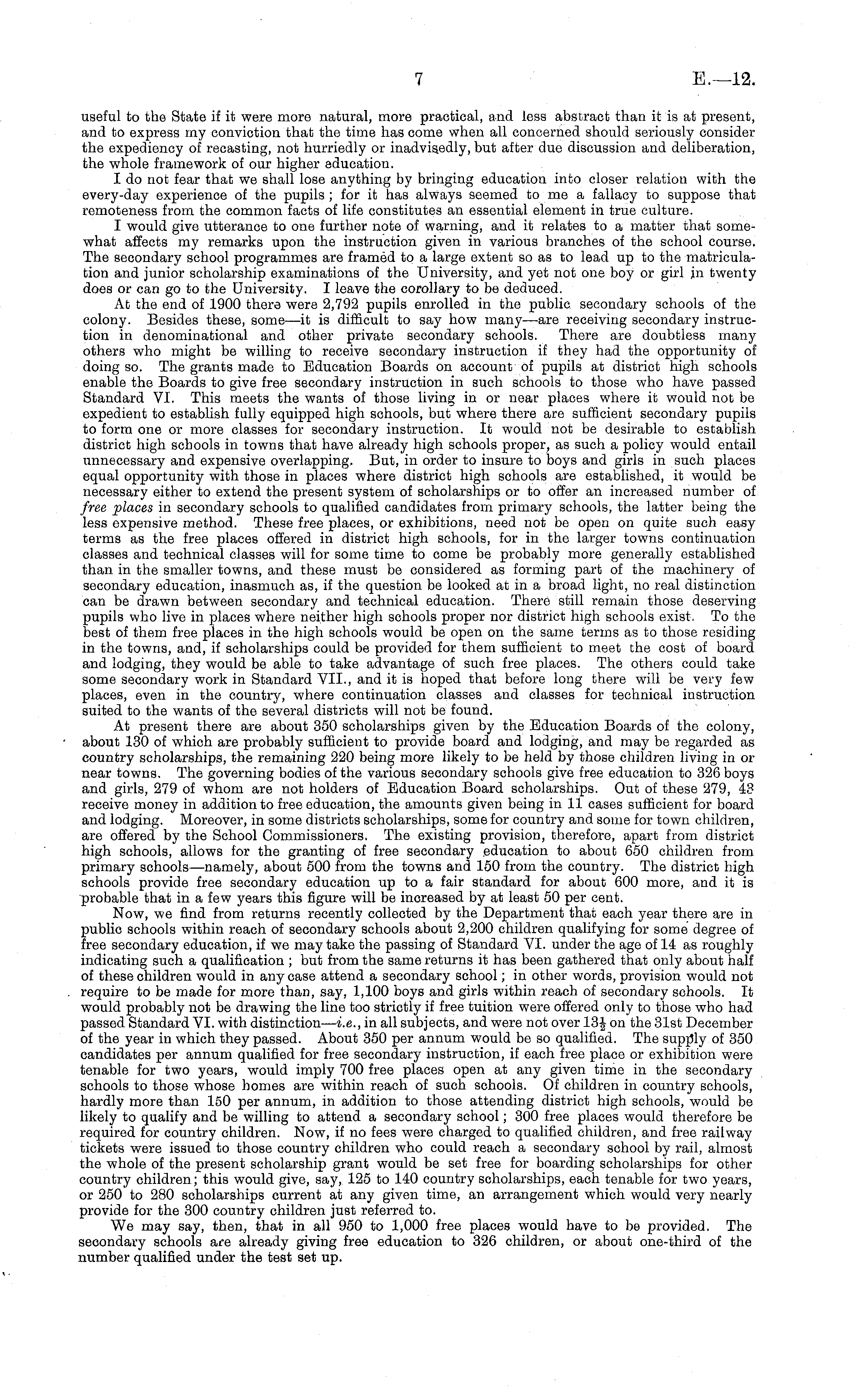 useful to the State if it were more natural, more practical, and less abstract than it is at present, and to express ray conviction that the time has come when all concerned should seriously consider the expediency of recasting, not hurriedly or inadvisedly, but after due discussion and deliberation, the whole framework of our higher education. I do not fear that we shall lose anything by bringing education into closer relation with the every-day experience of the pupils ; for it has always seemed to me a fallacy to suppose that remoteness from the common facts of life constitutes an essential element in true culture. I would give utterance to one further note of warning, and it relates to a matter chat somewhat affects my remarks upon the instruction given in various branches of the school course. The secondary school programmes are framed to a large extent so as to lead up to the matriculation and junior scholarship examinations of the University, and yet not one boy or girl in twenty does or can go to the University. I leave the corollary to be deduced. At the end of 1900 there were 2,792 pupils enrolled in the public secondary schools of the colony. Besides these, some—it is difficult to say how many —are receiving secondary instruction in denominational and other private secondary schools. There are doubtless many others who might be willing to receive secondary instruction if they had the opportunity of doing so. The grants made to Education Boards on account of pupils at district high schools enable the Boards to give free secondary instruction in such schools to those who have passed Standard VI. This meets the wants of those living in or near places where it would not be expedient to establish fully equipped high schools, but where there are sufficient secondary pupils to form one or more classes for secondary instruction. It would not be desirable to establish district high schools in towns that have already high schools proper, as such a policy would entail unnecessary and expensive overlapping. But, in order to insure to boys and girls in such places equal opportunity with those in places where district high schools are established, it would be necessary either to extend the present system of scholarships or to offer an increased number of free places in secondary schools to qualified candidates from primary schools, the latter being the less expensive method. These free places, or exhibitions, need not be open on quite such easy terms as the free places offered in district high schools, for in the larger towns continuation classes and technical classes will for some time to come be probably more generally established than in the smaller towns, and these must be considered as forming part of the machinery of secondary education, inasmuch as, if the question be looked at in a broad light, no real distinction can be drawn between secondary and technical education. There still remain those deserving pupils who live in places where neither high schools proper nor district high schools exist. To the best of them free places in the high schools would be open on the same terms as to those residing in the towns, and, if scholarships could be provided for them sufficient to meet the cost of board and lodging, they would be able to take advantage of such free places. The others could take some secondary work in Standard VII., and it is hoped that before long there will be very few places, even in the country, where continuation classes and classes for technical instruction suited to the wants of the several districts will not be found. At present there are about 350 scholarships given by the Education Boards of the colony, about 130 of which are probably sufficient to provide board and lodging, and may be regarded as country scholarships, the remaining 220 being more likely to be held by those children living in or near towns. The governing bodies of the various secondary schools give free education to 326 boys and girls, 279 of whom are not holders of Education Board scholarships. Out of these 279, 43 receive money in addition to free education, the amounts given being in 11 cases sufficient for board and lodging. Moreover, in some districts scholarships, some for country and some for town children, are offered by the School Commissioners. The existing provision, therefore, apart from district high schools, allows for the granting of free secondary education to about 650 children from primary schools—namely, about 500 from the towns and 150 from the country. The district high schools provide free secondary education up to a fair standard for about 600 more, and it is probable that in a few years this figure will be increased by at least 50 per cent. Now, we find from returns recently collected by the Department that each year there are in public schools within reach of secondary schools about 2,200 children qualifying for some degree of free secondary education, if we may take the passing of Standard VI. under the age of 14 as roughly indicating such a qualification ; but from the same returns it has been gathered that only about half of these children would in any case attend a secondary school; in other words, provision would not require to be made for more than, say, 1,100 boys and girls within reach of secondary schools. It would probably not be drawing the line too strictly if free tuition were offered only to those who had passed Standard VI. with distinction— i.e., in all subjects, and were not over 13| on the 31st December of the year in which they passed. About 350 per annum would be so qualified. The supply of 350 candidates per annum qualified for free secondary instruction, if each free place or exhibition were tenable for two years, would imply 700 free places open at any given time in the secondary schools to those whose homes are within reach of such schools. Of children in country schools, hardly more than 150 per annum, in addition to those attending district 