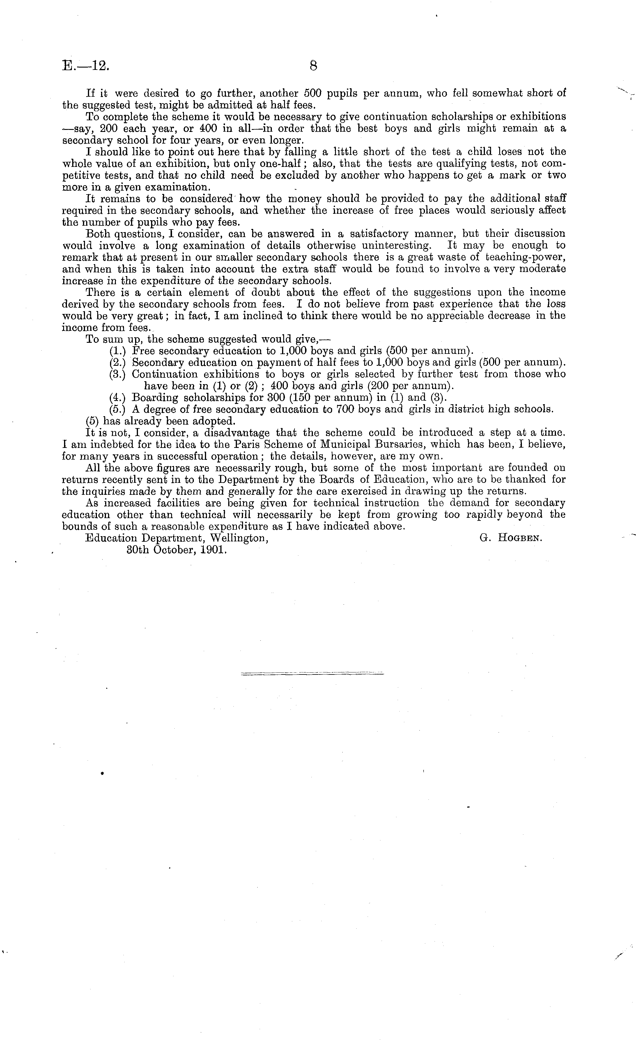 If it were desired to go further, another 500 pupils per annum, who fell somewhat short of the suggested test, might be admitted at half fees. To complete the scheme it would be necessary to give continuation scholarships or exhibitions -—say, 200 each year, or 400 in all—in order that the best boys and girls might remain at a secondary school for four years, or even longer. I should like to point out here that by falling a little short of the test a child loses not the whole value of an exhibition, but only one-half ; also, that the tests are qualifying tests, not competitive tests, and that no child need be excluded by another who happens to get a mark or two more in a given examination. It remains to be considered how the money should be provided to pay the additional staff required in the secondary schools, and whether the increase of free places would seriously affect the number of pupils who pay fees. Both questions, I consider, can be answered in a satisfactory manner, but their discussion would involve a long examination of details otherwise uninteresting. It may be enough to remark that at present in our smaller secondary schools there is a great waste of teaching-power, and when this is taken into account the extra staff would be found to involve a very moderate increase in the expenditure of the secondary schools. There is a certain element of doubt about the effect of the suggestions upon the income derived by the secondary schools from fees. I do not believe from past experience that the loss would be very great; in fact, lam inclined to think there would be no appreciable decrease in the income from fees. To sum up, the scheme suggested would give,— (1.) Free secondary education to 1,000 boys and girls (500 per annum). (2.) Secondary education on payment of half fees to 1,000 boys and girls (500 per annum). (3.) Continuation exhibitions to boys or girls selected by further test from those who have been in (1) or (2) ; 400 boys and girls (200 per annum). (4.) Boarding scholarships for 300 (150 per annum) in (1) and (3). (5.) A degree of free secondary education to 700 boys and girls in district high schools. (5) has already been adopted. It is not, I consider, a disadvantage that the scheme could be introduced a step at a time. I am indebted for the idea to the Paris Scheme of Municipal Bursaries, which has been, I believe, for many years in successful operation; the details, however, are my own. All the above figures are necessarily rough, but some of the most important are founded on returns recently sent in to the Department by the Boards of Education, who are to be thanked for the inquiries made by them and generally for the care exercised in drawing up the returns. As increased facilities are being given for technical instruction the demand for secondary education other than technical will necessarily be kept from growing too rapidly beyond the bounds of such a reasonable expenditure as I have indicated above. Education Department, Wellington, G. Hogbbn. 30th October, 1901.