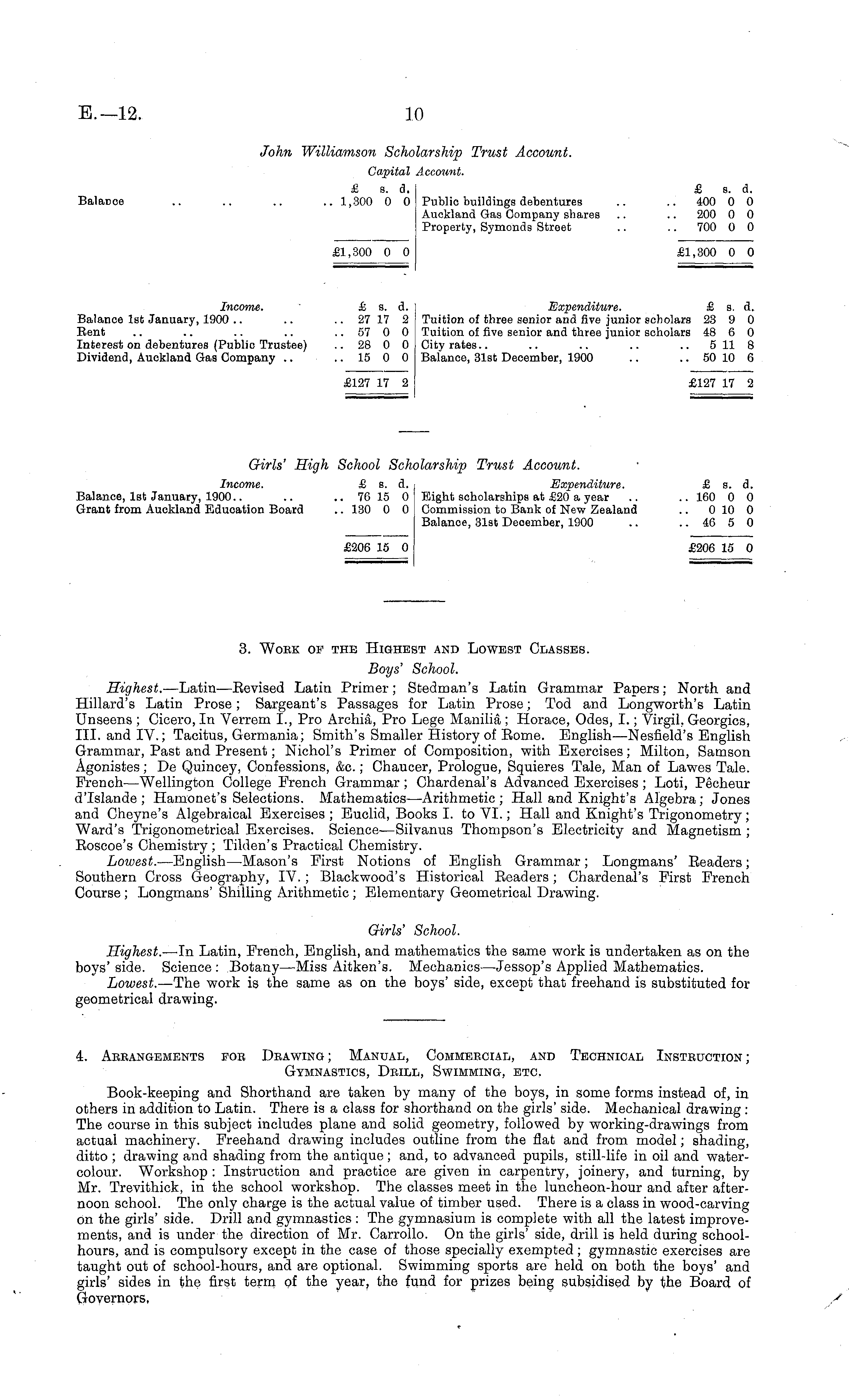 John Williamson Scholarship Tmst Account. Capital Account. £ s. d. £ s. a. Balance .. .. .. .. 1,300 0 0 Public buildings debentures .. .. 400 0 0 Auckland Gas Company shares .. .. 200 0 0 Property, Symonds Street .. .. 700 0 0 £1,300 0 0 £1,300 0 0 Income. " £ a. d. Expenditure. £ s. d. Balance Ist January, 1900 .. .. .. 27 17 2 Tuition of three senior and five junior scholars 23 9 0 Bent .. .. .. .. 57 0 0 Tuition of five senior and three junior scholars 48 6 0 Interest on debentures (Public Trustee) .. 28 0 0 City rates.. .. .. .. 511 8 Dividend, Auckland Gas Company .. .. 15 0 0 Balance, 31st December, 1900 .. .. 50 10 6 £127 17 2 £127 17 2