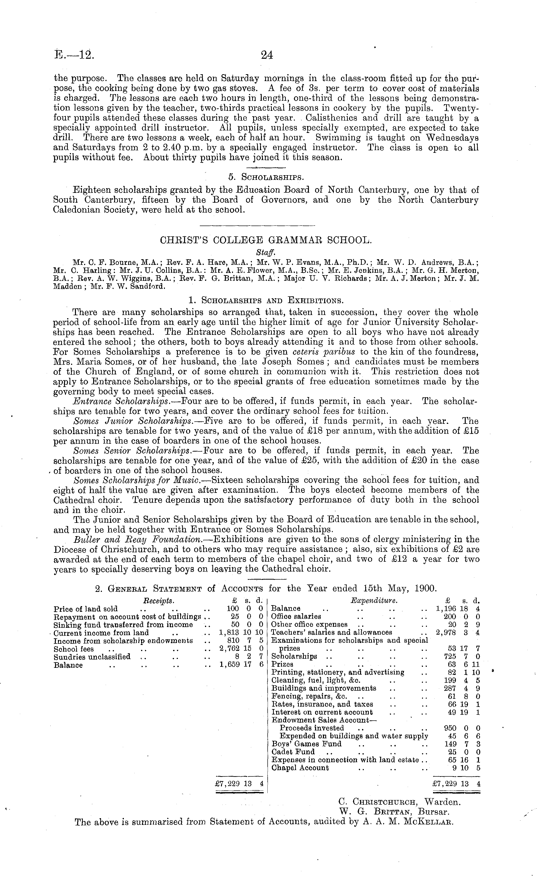 CHEIST'S COLLEGE GEAMMAE SCHOOL. Staff. Mr. C. F. Bourne, M.A.; Rev. F. A. Hare, M.A.; Mr. W. P. Evans, M.A., Ph.D.; Mr. W. D. Andrews, 8.A.; Mr. C. Harling : Mr. J. U. Collins, 8.A.: Mr. A. E. Flower, M.A., B.Sc.; Mr. E. Jenkins, B.A. ; Mr. G. H. Merton, 8.A.; Rev. A. W. Wiggins, 8.A.; Rev. F. G. Brittan, M.A. ; Major U. V. Richards; Mr. A. J. Merton; Mr. J. M. Madden ; Mr. F. W. Sandford. 1. SCHOLAESHIPS AND EXHIBITIONS. There are many scholarships so arranged that, taken in succession, they cover the whole period of school-life from an early age until the higher limit of age for Junior University Scholarships has been reached. The Entrance Scholarships are open to all boys who have not already entered the school; the others, both to boys already attending it and to those from other schools. For Somes Scholarships a preference is to be given ceteris paribus to the kin of the foundress, Mrs. Maria Somes, or of her husband, the late Joseph Somes ; and candidates must be members of the Church of England, or of some church in communion with it. This restriction does not apply to Entrance Scholarships, or to the special grants of free education sometimes made by the governing body to meet special cases. Entrance Scholarships. —Four are to be offered, if funds permit, in each year. The scholarships are tenable for two years, and cover the ordinary school fees for tuition. Somes Junior Scholarships. —Five are to be offered, if funds permit, in each year. The scholarships are tenable for two years, and of the value of £18 per annum, with the addition of £15 per annum in the case of boarders in one of the school houses. Somes Senior Scholarships. —Four are to be offered, if funds permit, in each year. The scholarships are tenable for one year, and of the value of £25, with the addition of £20 in the case of boarders in one of the school houses. Somes Scholarships for Music. —Sixteen scholarships covering the school fees for tuition, and eight of half the value are given after examination. The boys elected become members of the Cathedral choir. Tenure depends upon the satisfactory performance of duty both in the school and in the choir. The Junior and Senior Scholarships given by the Board of Education are tenable in the school, and may be held together with Entrance or Somes Scholarships. Buller and Beay Foundation. —Exhibitions are given to the sons of clergy ministering in the Diocese of Christchurch, and to others who may require assistance ; also, six exhibitions of £2 are awarded at the end of each term to members of the chapel choir, and two of £12 a year for two years to specially deserving boys on leaving the Cathedral choir.