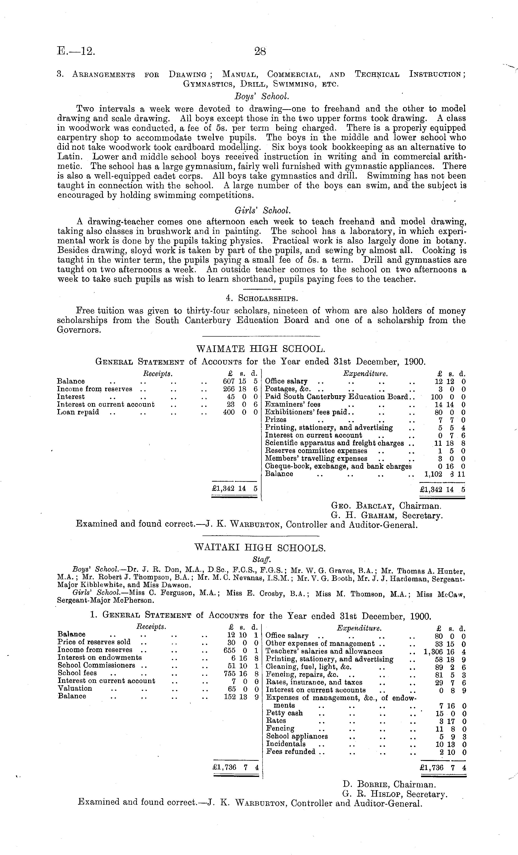 WAITAKI HIGH SCHOOLS. Staff. Boys , School—Tit. J. R. Don, M.A., D.Sc, F.C.S., F.G.S.; Mr. W. G. Graves, 8.A.; Mr. Thomas A. Hunter, M.A. ; Mr. Robert J. Thompson, 8.A.; Mr. M. C. Nevanas, 1.5.M.; Mr. V. G. Booth, Mr. J. J. Hardeman, SergeantMajor Kibblewhite, and Miss Dawson. Girls' School.— -Miss 0. Ferguson, M.A.; Miss E. Crosby, B.A. ; Misa M. Thomson, M.A.; Miss MeCaw, Sergeant-Major McPherson. 1. General Statement of Accounts for the Year ended 31st December, 1900. Receipts. £ s. d. Expenditure. £ a. d. Balance .. .. .. .. 12 10 1 Office salary .. .. .. .. 80 0 0 Price of reserves sold .. .. .. 30 0 0 Other expenses of management .. .. 33 15 0 Income from reserves .. .. .. 655 0 1 Teachers'salaries and allowances .. 1,306 16 4 Interest on endowments .. .. 616 8 Printing, stationery, and advertising .. 58 18 9 School Commissioners .. .. .. 51 10 1 Cleaning, fuel, light, &c. .. .. 89 2 6 School fees .. .. .. .. 755 16 8 Fenoing, repairs, &c. .. .. .. 81 5 3 Interest on current account .. .. 7 0 0 Rates, insurance, and taxes .. .. 29 7 6 Valuation .. .. .. .. 65 0 0 Interest on current accounts .. .. 0 8 9 Balance .. .. .. .. 152 13 9 Expenses of management, &c, of endowments .. .. .. .. 7 16 0 Petty cash .. .. .. .. ' 15 0 0 Rates .. .. .. .. 3 17 0 Fencing .. .. .. .. 11 8 0 Sohool appliances .. .. .. 5 9 3 Incidentals .. .. .. .. 10 13 0 Fees refunded .. .. .. .. 2 10 0 £1,736 7 4 £1,736 7 4 D. Borrie, Chairman. G. E. Hislop, Secretary. Examined and found correct.— J. K. Waeburton, Controller and Auditor-General.