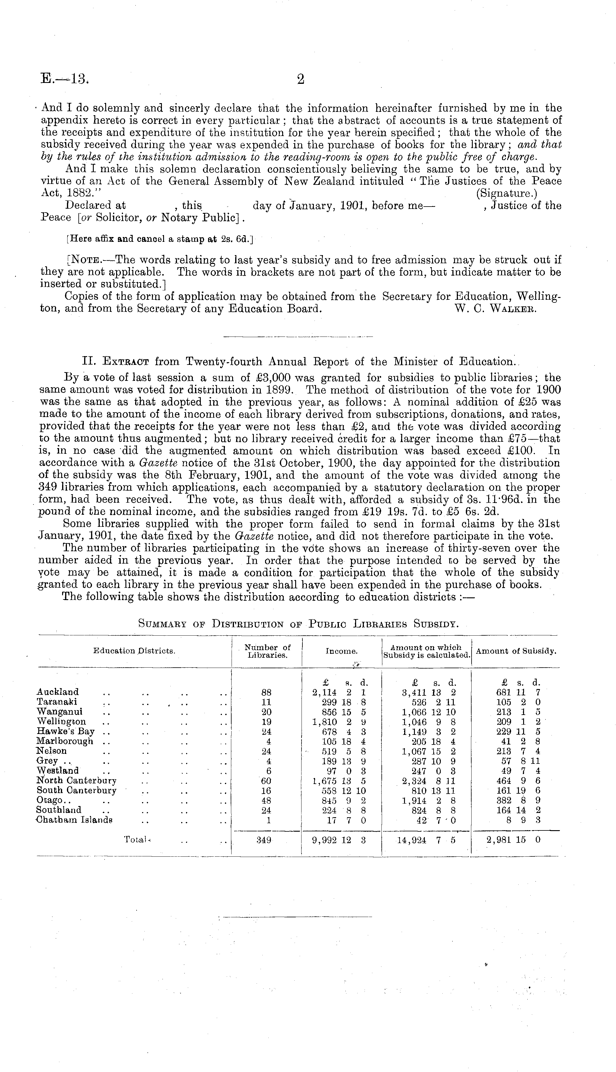 And I do solemnly and sincerly declare that the information hereinafter furnished by me in the appendix hereto is correct in every particular ; that the abstract of accounts is a true statement of the receipts and expenditure of the institution for the year herein specified; that the whole of the subsidy received during the year was expended in the purchase of books for the library ; and that by the rules of the institution admission to the reading-room is open to the public free of charge. And I make this solemn declaration conscientiously believing the same to be true, and by virtue of an Act of the General Assembly of New Zealand intituled " The Justices of the Peace Act, 1882." (Signature.) Declared at , this day of January, 1901, before me — , Justice of the Peace [or Solicitor, or Notary Public]. [Here affix and cancel a stamp at 2s. 6d.] [Note. —The words relating to last year's subsidy and to free admission may be struck out if they are not applicable. The words in brackets are not part of the form, but indicate matter to be inserted or substituted.] Copies of the form of application may be obtained from the Secretary for Education, Wellington, and from the Secretary of any Education Board. W. C. Walkeb.