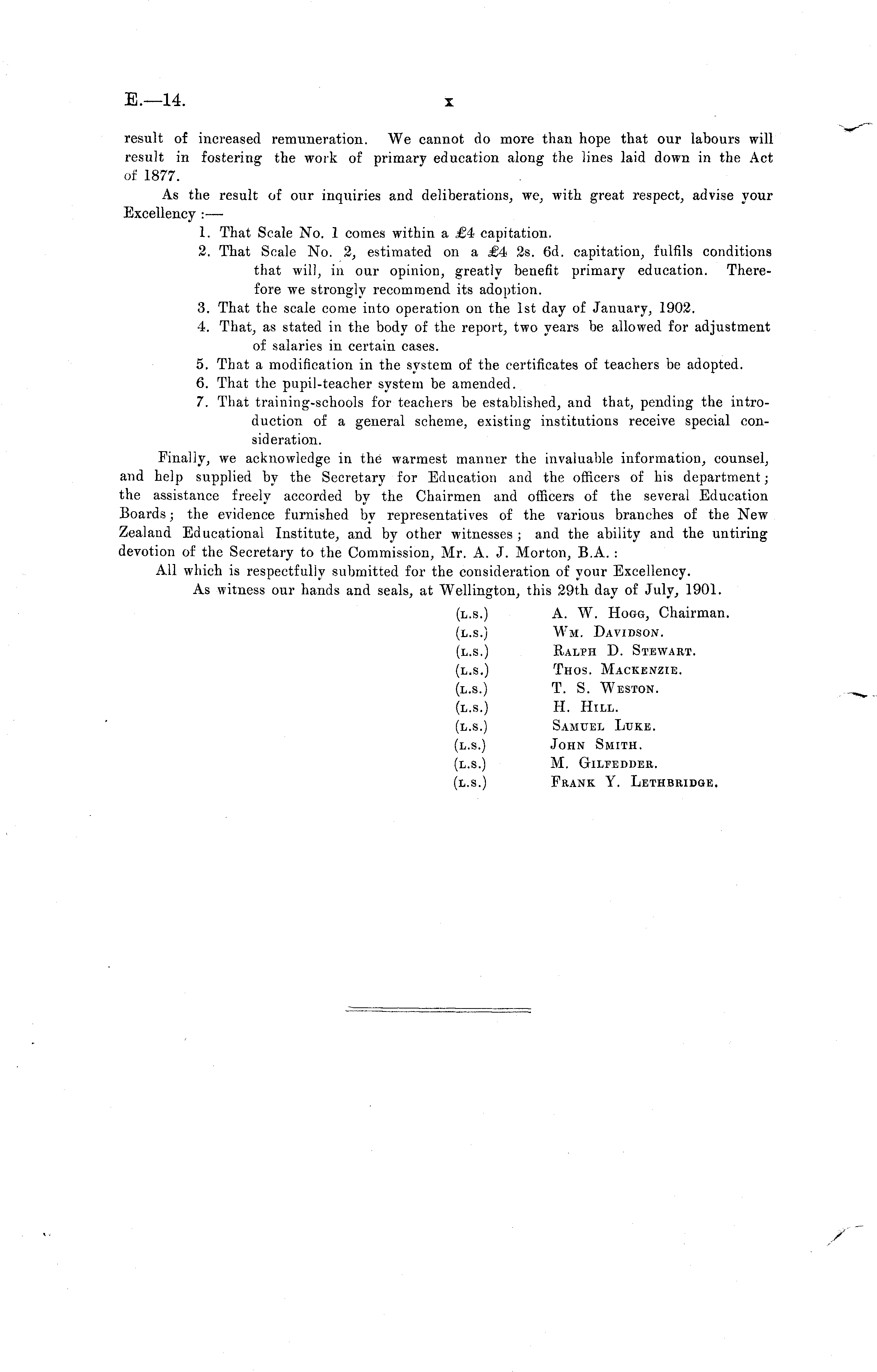 result of increased remuneration. We cannot do more than hope that our labours will result in fostering the work of primary education along the lines laid down in the Act of 1877. As the result of our inquiries and deliberations, we, with great respect, advise your Excellency : — 1. That Scale No. 1 comes within a £4 capitation. 2. That Scale No. 2, estimated on a £4 2s. 6d. capitation, fulfils conditions that will, in our opinion, greatly benefit primary education. Therefore we strongly recommend its adoption. 3. That the scale come into operation on the Ist day of January, 1902. 4. That, as stated in the body of the report, two years be allowed for adjustment of salaries in certain cases. 5. That a modification in the system of the certificates of teachers be adopted. 6. That the pupil-teacher system be amended. 7. That training-schools for teachers be established, and that, pending the introduction of a general scheme, existing institutions receive special consideration. Finally, we acknowledge in the warmest manner the invaluable information, counsel, and help supplied by the Secretary for Education and the officers of his department; the assistance freely accorded by the Chairmen and officers of the several Education Boards; the evidence furnished by representatives of the various branches of the New Zealand Educational Institute, and by other witnesses ; and the ability and the untiring devotion of the Secretary to the Commission, Mr. A. J. Morton, B.A. : All which is respectfully submitted for the consideration of your Excellency. As witness our hands and seals, at Wellington, this 29th day of July, 1901. (1.5.) A. W. Hogg, Chairman. (1.5.) Wm. Davidson. (1.5.) Ralph D. Stewart. (1.5.) Thos. Mackenzie. (1.5.) T. S. Weston. (1.5.) H. Hill. (1.5.) Samuel Luke. (1.5.) John Smith. (1.5.) M. Gilfedder. (1.5.) Frank Y. Lethbridge.