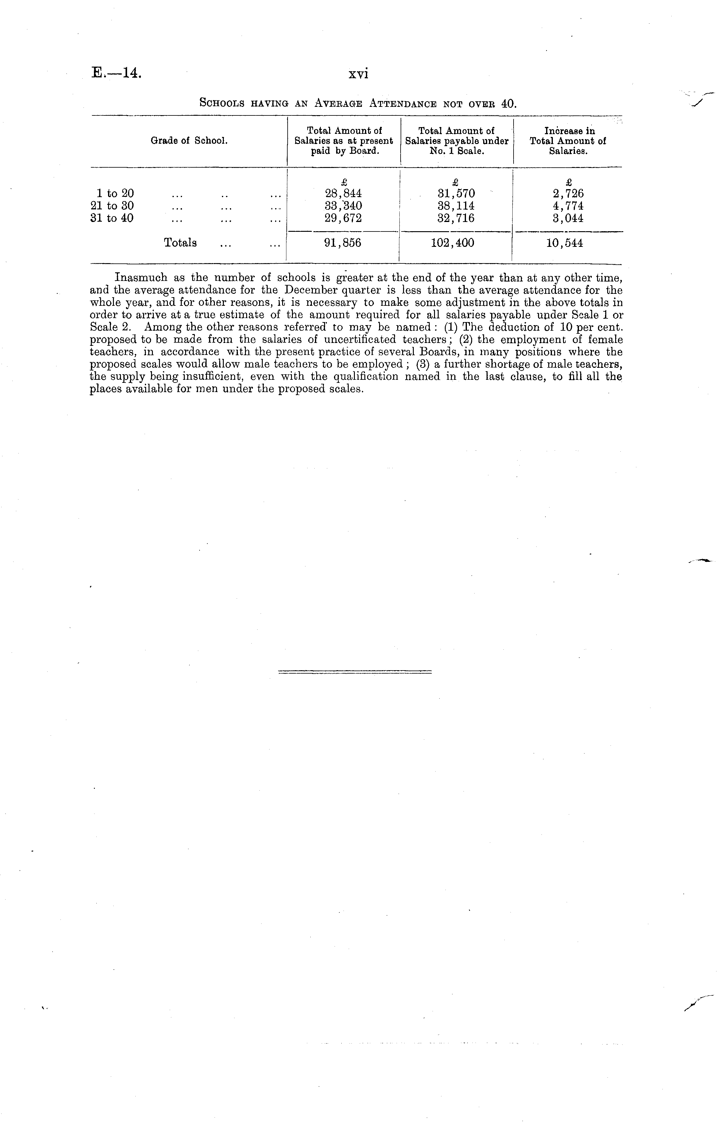 Inasmuch as the number of schools is greater at the end of the year than at any other time, and the average attendance for the December quarter is less than the average attendance for the whole year, and for other reasons, it is necessary to make some adjustment in the above totals in order to arrive at a true estimate of the amount required for all salaries payable under Scale 1 or Scale 2. Among the other reasons referred to may be named : (1) The deduction of 10 per cent, proposed to be made from the salaries of uncertificated teachers; (2) the employment of female teachers, in accordance with the present practice of several Boards, in many positions where the proposed scales would allow male teachers to be employed ; (3) a further shortage of male teachers, the supply being insufficient, even with the qualification named in the last clause, to fill all the places available for men under the proposed scales.