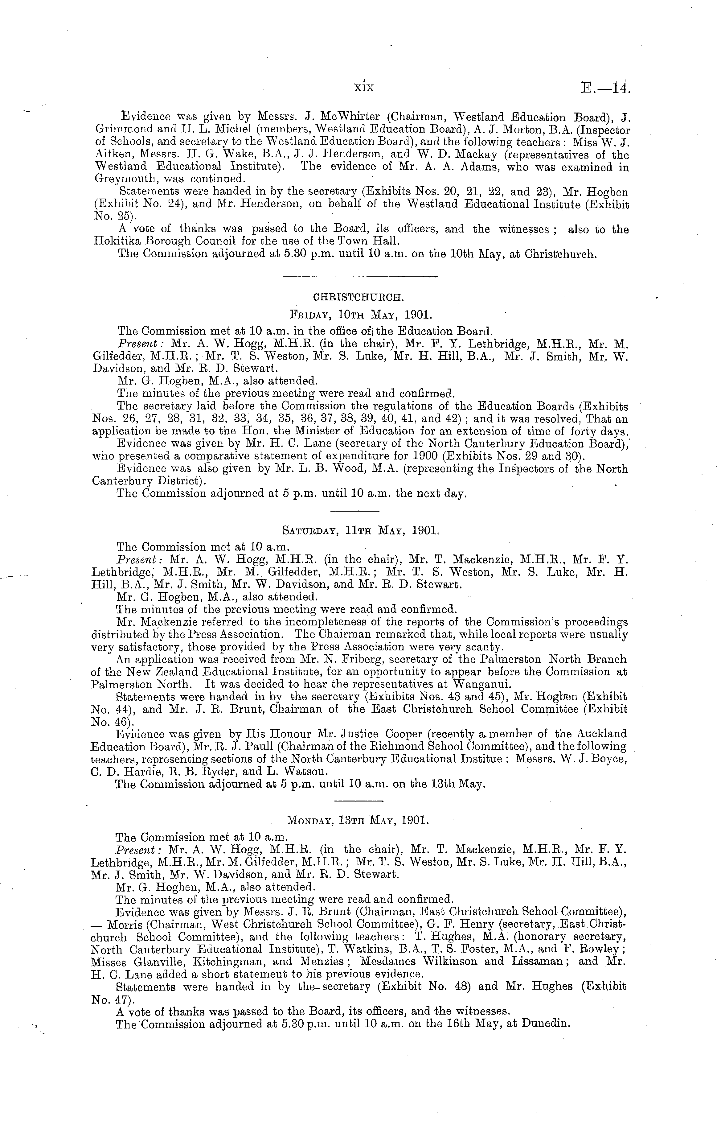Saturday, 11th May, 1901. The Commission met at 10 a.m. Present: Mr. A. W. Hogg, M.H.B. (in the chair), Mr. T. Mackenzie, M.H.8., Mr. P. Y. Lethbridge, M.H.E., Mr. M. Gilfedder, M.H.8.; Mr. T. S. Weston, Mr. S. Luke, Mr. H. Hill, 8.A., Mr. J. Smith, Mr. W. Davidson, and Mr. B. D. Stewart. Mr. G. Hogben, M.A., also attended. The minutes of the previous meeting were read and confirmed. Mr. Mackenzie referred to the incompleteness of the reports of the Commission's proceedings distributed by the Press Association. The Chairman remarked that, while local reports were usually very satisfactory, those provided by the Press Association were very scanty. An application was received from Mr. N. Priberg, secretary of the Palmerston North Branch of the New Zealand Educational Institute, for an opportunity to appear before the Commission at Palmerston North. It was decided to hear the representatives at Wanganui. Statements were handed in by the secretary (Exhibits Nos. 43 and 45), Mr. Hogben (Exhibit No. 44), and Mr. J. B. Brunt, Chairman of the East Christchurch School Committee (Exhibit No. 46). Evidence was given by His Honour Mr. Justice Cooper (recently a. member of the Auckland Education Board), Mr. B. J. Paull (Chairman of the Bichmond School Committee), and the following teachers, representing sections of the North Canterbury Educational Institue : Messrs. W. J. Boyce, C. D. Hardie, B. B. Byder, and L. Watson. The Commission adjourned at 5 p.m. until 10 a.m. on the 13th May.