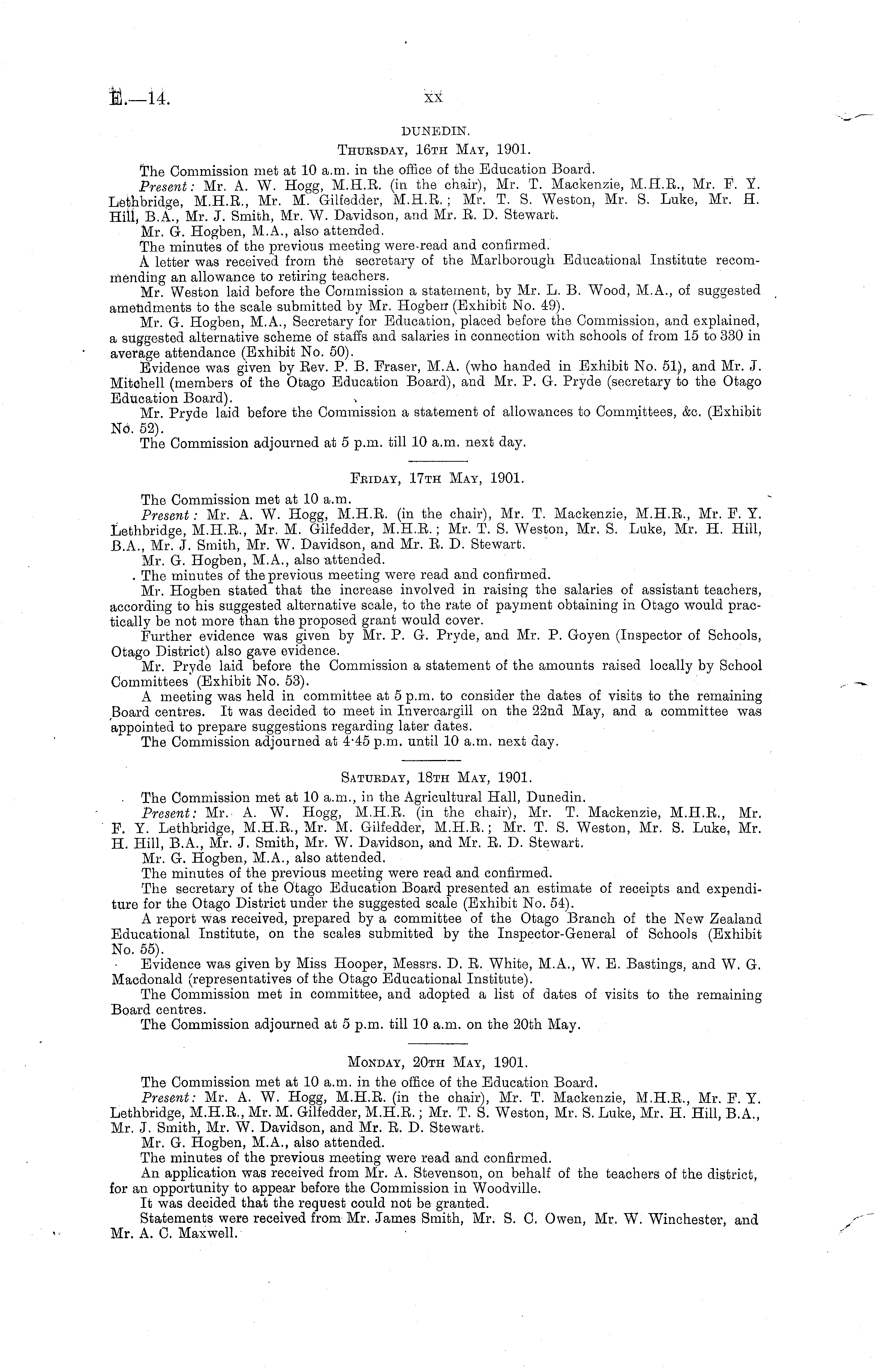 Monday, 20th May, 1901. The Commission met at 10 a.m. in the office of the Education Board. Present: Mr. A. W. Hogg, M.H.B. (in the chair), Mr. T. Mackenzie, M.H.8., Mr. P. Y. Lethbridge, M.H.8., Mr. M. Gilfedder, M.H.8.; Mr. T. S. Weston, Mr. S. Luke, Mr. H. Hill, 8.A., Mr. J. Smith, Mr. W. Davidson, and Mr. B. D. Stewart. Mr. G. Hogben, M.A., also attended. The minutes of the previous meeting were read and confirmed. An application was received from Mr. A. Stevenson, on behalf of the teachers of the district, for an opportunity to appear before the Commission in Woodville. It was decided that the request could not be granted. Statements were received from Mr. James Smith, Mr. S. C. Owen, Mr. W. Winchester, and Mr. A. 0. Maxwell.