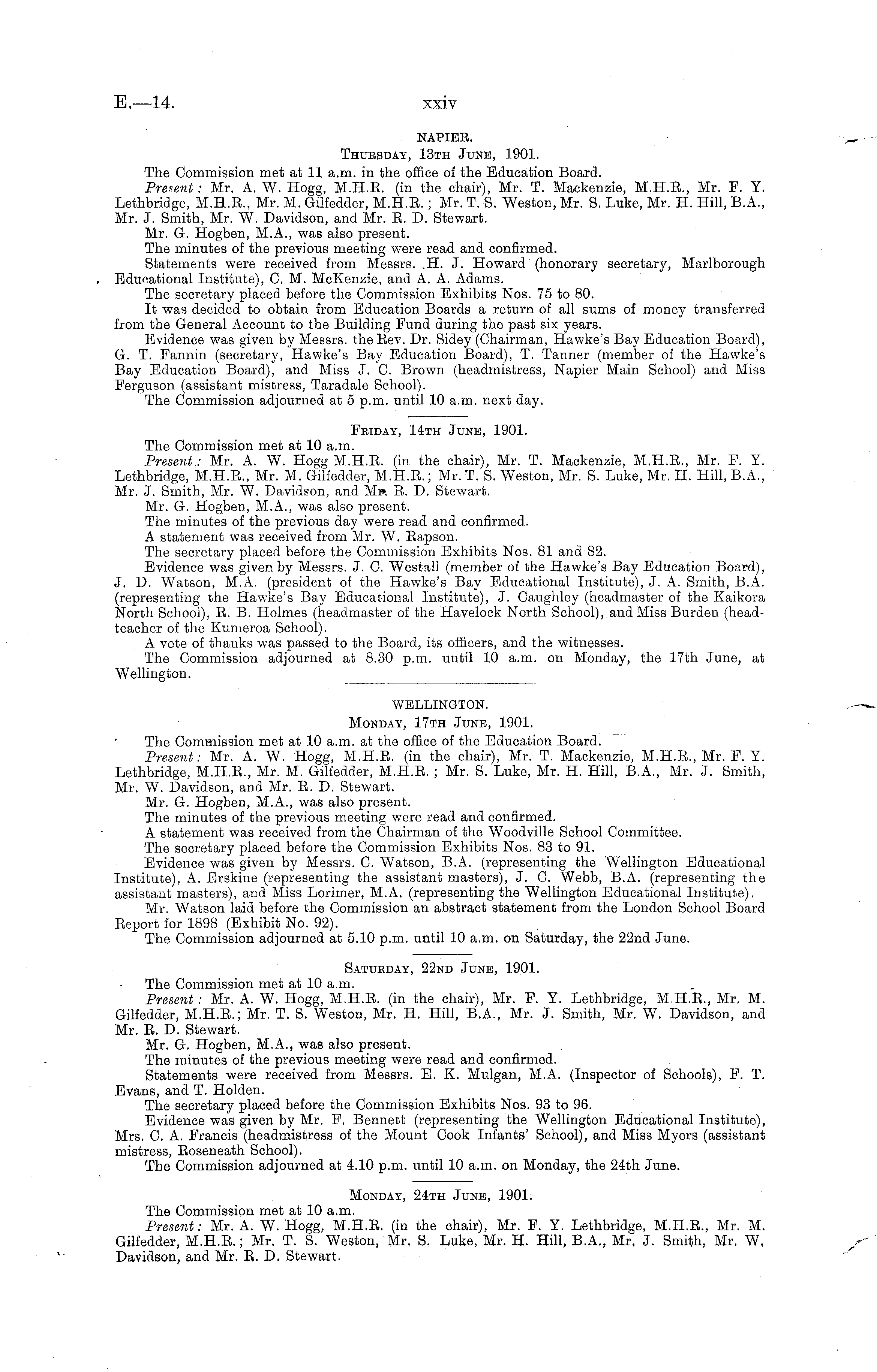 Friday, 14th June, 1901. The Commission met at 10 a.m. Present: Mr. A. W. Hogg M.H.B. (in the chair), Mr. T. Mackenzie, M.H.8., Mr. F. Y. Lethbridge, M.H.8., Mr. M. Gilfedder, M.H.8.; Mr. T. S. Weston, Mr. S. Luke, Mr. H. Hill, 8.A., Mr. J. Smith, Mr. W. Davidson, and Mr». B. D. Stewart. Mr. G. Hogben, M.A., was also present. The minutes of the previous day were read and confirmed. A statement was received from Mr. W. Bapson. The secretary placed before the Commission Exhibits Nos. 81 and 82. Evidence was given by Messrs. J. C. Westall (member of the Hawke's Bay Education Board), J. D. Watson, M.A. (president of the Hawke's Bay Educational Institute), J. A. Smith, B.A. (representing the Hawke's Bay Educational Institute), J. Caughley (headmaster of the Kaikora North School), B. B. Holmes (headmaster of the Havelock North School), and Miss Burden (headteacher of the Kumeroa School). A vote of thanks was passed to the Board, its officers, and the witnesses. The Commission adjourned at 8.30 p.m. until 10 a.m. on Monday, the 17th June, at Wellington.