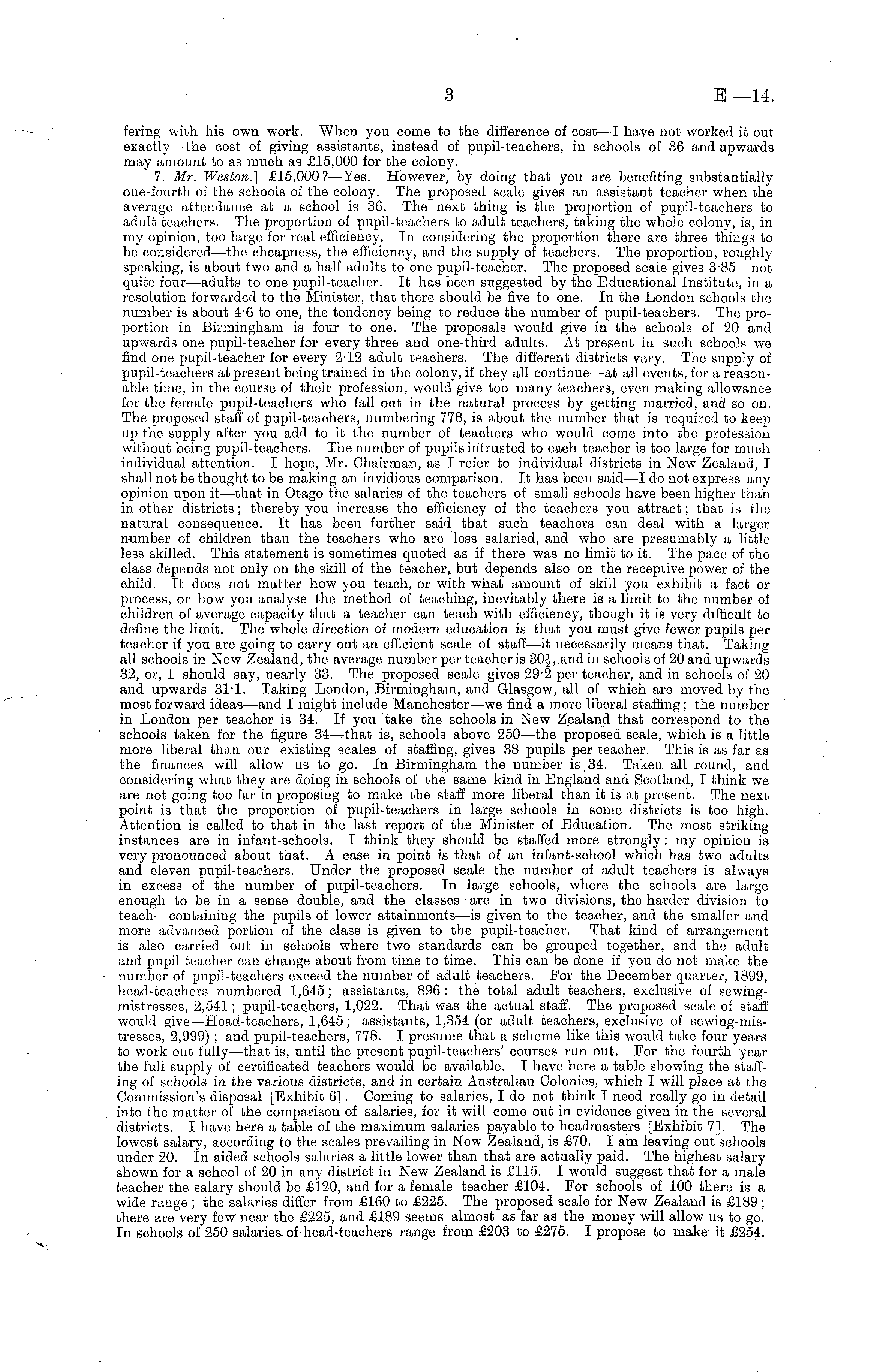fering with his own work. When you come to the difference of cost—l have not worked it out exactly—the cost of giving assistants, instead of pupil-teachers, in schools of 36 and upwards may amount to as much as £15,000 for the colony. 7. Mr. Western.] £15,000? —Yes. However, by doing that you are benefiting substantially one-fourth of the schools of the colony. The proposed scale gives an assistant teacher when the average attendance at a school is 36. The next thing is the proportion of pupil-teachers to adult teachers. The proportion of pupil-teachers to adult teachers, taking the whole colony, is, in my opinion, too large for real efficiency. In considering the proportion there are three things to be considered —the cheapness, the efficiency, and the supply of teachers. The proportion, roughly speaking, is about two and a half adults to one pupil-teacher. The proposed scale gives 3'Bs—not quite four—adults to one pupil-teacher. It has been suggested by the Educational Institute, in a resolution forwarded to the Minister, that there should be five to one. In the London schools the number is about 46 to one, the tendency being to reduce the number of pupil-teachers. The proportion in Birmingham is four to one. The proposals would give in the schools of 20 and upwards one pupil-teacher for every three and one-third adults. At present in such schools we find one pupil-teacher for every 2-12 adult teachers. The different districts vary. The supply of pupil-teachers at present being trained in the colony, if they all continue —at all events, for a reasonable time, in the course of their profession, would give too many teachers, even making allowance for the female pupil-teachers who fall out in the natural process by getting married, and so on. The proposed staff of pupil-teachers, numbering 778, is about the number that is required to keep up the supply after you add to it the number of teachers who would come into the profession without being pupil-teachers. The number of pupils intrusted to each teacher is too large for much individual attention. I hope, Mr. Chairman, as I refer to individual districts in New Zealand, I shall not be thought to be making an invidious comparison. It has been said—l do not express any opinion upon it—that in Otago the salaries of the teachers of small schools have been higher than in other districts; thereby you increase the efficiency of the teachers you attract; that is the natural consequence. It has been further said that such teachers can deal with a larger n-umber of children than the teachers who are less salaried, and who are presumably a little less skilled. This statement is sometimes quoted as if there was no limit to it. The pace of the class depends not only on the skill of the teacher, but depends also on the receptive power of the child. It does not matter how you teach, or with what amount of skill you exhibit a fact or process, or how you analyse the method of teaching, inevitably there is a limit to the number of children of average capacity that a teacher can teach with efficiency, though it is very difficult to define the limit. The whole direction of modern education is that you must give fewer pupils per teacher if you are going to carry out an efficient scale of staff —it necessarily means that. Taking all schools in New Zealand, the average number per teacher is 30£, and in schools of 20 and upwards 32, or, I should say, nearly 33. The proposed scale gives 292 per teacher, and in schools of 20 and upwards 311. Taking London, Birmingham, and Glasgow, all of which are moved by the most forward ideas—-and I might include Manchester—we find a more liberal staffing; the number in London per teacher is 34. If you take the schools in New Zealand that correspond to the schools taken for the figure 34—that is, schools above 250 —the proposed scale, which is a little more liberal than our existing scales of staffing, gives 38 pupils per teacher. This is as far as the finances will allow us to go. In Birmingham the number is 34. Taken all round, and considering what they are doing in schools of the same kind in England and Scotland, I think we are not going too far in proposing to make the staff more liberal than it is at present. The next point is that the proportion of pupil-teachers in large schools in some districts is too high. Attention is called to that in the last report of the Minister of Education. The most striking instances are in infant-schools. I think they should be staffed more strongly : my opinion is very pronounced about that. A case in point is that of an infant-school which has two adults and eleven pupil-teachers. Under the proposed scale the number of adult teachers is always in excess of the number of pupil-teachers. In large schools, where the schools are large enough to be in a sense double, and the classes are in two divisions, the harder division to teach—containing the pupils of lower attainments —is given to the teacher, and the smaller and more advanced portion of the class is given to the pupil-teacher. That kind of arrangement is also carried out in schools where two standards can be grouped together, and the adult and pupil teacher can change about from time to time. This can be done if you do not make the number of pupil-teachers exceed the number of adult teachers. For the December quarter, 1899, head-teachers numbered 1,645; assistants, 896: the total adult teachers, exclusive of sewingmistresses, 2,541; pupil-teachers, 1,022. That was the actual staff. The proposed scale of staff would give—Head-teachers, 1,645; assistants, 1,354 (or adult teachers, exclusive of sewing-mis-tresses, 2,999) ; and pupil-teachers, 778. I presume that a scheme like this would take four years to work out fully—that is, until the present pupil-teachers' courses run out. For the fourth year the full supply of certificated teachers would be available. I have here a table showing the staffing of