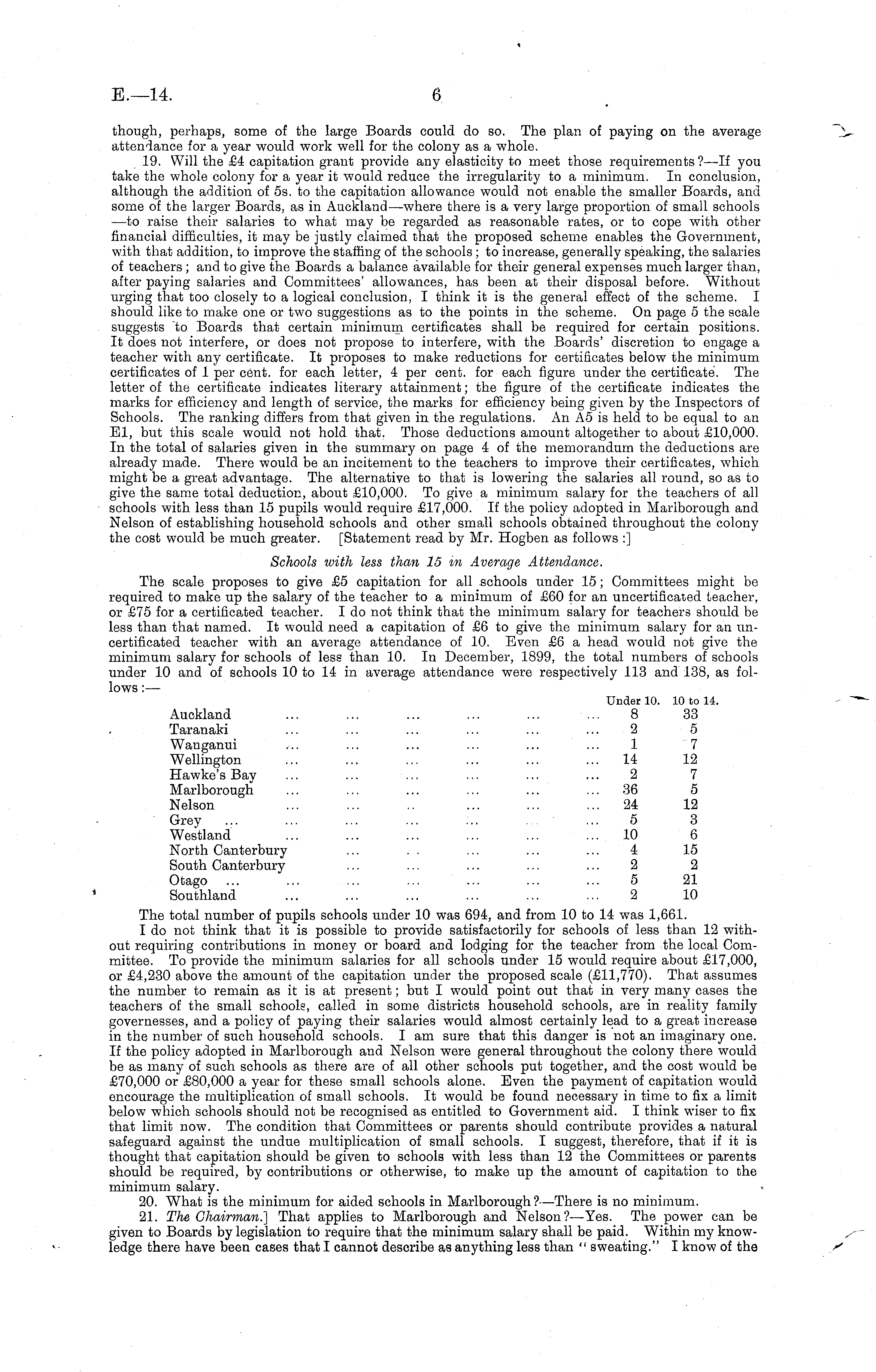 though, perhaps, some of the large Boards could do so. The plan of paying on the average attendance for a year would work well for the colony as a whole. 19. Will the £4 capitation grant provide any elasticity to meet those requirements? —If you take the whole colony for a year it would reduce the irregularity to a minimum. In conclusion, although the addition of ss. to the capitation allowance would not enable the smaller Boards, and some of the larger Boards, as in Auckland—where there is a very large proportion of small schools —to raise their salaries to what may be regarded as reasonable rates, or to cope with other financial difficulties, it may be justly claimed that the proposed scheme enables the Government, with that addition, to improve the staffing of the schools ; to increase, generally speaking, the salaries of teachers ; and to give the Boards a balance available for their general expenses much larger than, after paying salaries and Committees' allowances, has been at their disposal before. Without urging that too closely to a logical conclusion, I think it is the general effect of the scheme. I should like to make one or two suggestions as to the points in the scheme. On page 5 the scale suggests to Boards that certain minimum certificates shall be required for certain positions. It does not interfere, or does not propose to interfere, with the Boards' discretion to engage a teacher with any certificate. It proposes to make reductions for certificates below the minimum certificates of 1 per cent, for each letter, 4 per cent, for each figure under the certificate. The letter of the certificate indicates literary attainment; the figure of the certificate indicates the marks for efficiency and length of service, the marks for efficiency being given by the Inspectors of Schools. The ranking differs from that given in. the regulations. An A 5 is held to be equal to an El, but this scale would not hold that. Those deductions amount altogether to about £10,000. In the total of salaries given in the summary on page 4 of the memorandum the deductions are already made. There would be an incitement to the teachers to improve their certificates, which might be a great advantage. The alternative to that is lowering the salaries all round, so as to give the same total deduction, about £10,000. To give a minimum salary for the teachers of all schools with less than 15 pupils would require £17,000. If the policy adopted in Marlborough and Nelson of establishing household schools and other small schools obtained throughout the colony the cost would be much greater. [Statement read by Mr. Hogben as follows :] Schools with less than IS in Average Attendance. The scale proposes to give £5 capitation for all schools under 15; Committees might be required to make up the salary of the teacher to a minimum of £60 for an uncertificated teacher, or £75 for a certificated teacher. Ido not think that the minimum salary for teachers should be less than that named. It would need a capitation of £6 to give the minimum salary for an uncertificated teacher with an average attendance of 10. Even £6 a head would not give the minimum salary for schools of less than 10. In December, 1899, the total numbers of schools under 10 and of schools 10 to 14 in average attendance were respectively 113 and 138, as follows :— Under 10. 10 to 14. Auckland ... ... ... ... ... ... 8 33 Taranaki ... ... ... ... ... ... 2 5 Wanganui ... ... ... ... ... ... 1 7 Wellington ... ... ... ... ... ... 14 12 Hawke's Bay ... ... -.- ... ... ... 2 7 Marlborough ... ... ... ... ... ... 36 5 Nelson ... ... .. ... ... ... 24 12 Grey ... ... ... ... ... ... ... 5 3 Westland ... ... ... ... ... ... 10 6 North Canterbury ... . . ... ... ... 4 15 South Canterbury ... ... ... ... ... 2 2 Otago ... ... ... ... ... ... ... 5 21 Southland ... ... ... ... ... ... 2 10 The total number of pupils schools under 10 was 694, and from 10 to 14 was 1,661. I do not think that it is possible to provide satisfactorily for schools of less than 12 without requiring contributions in money or board and lodging for the teacher from the local Committee. To provide the minimum salaries for all schools under 15 would require about £17,000, or £4,230 above the amount of the capitation under the proposed scale (£11,770). That assumes the number to remain as it is at present; but I w-ould point out that in very many cases the teachers of the small schools, called in some districts household schools, are in reality family governesses, and a policy of paying their salaries would almost certainly lead to a great increase in the number of such household schools. I am sure that this danger is not an imaginary one. If the policy adopted in Marlborough and Nelson were general throughout the colony there would be as many of such schools as there are of all other schools put together, and the cost would be £70,000 or £80,000 a year for these small schools alone. Even the payment of capitation would encourage the multiplication of small schools. It would be found necessary in time to fix a limit below which schools should not be recognised as entitled to Government aid. I think wiser to fix that limit now. The condition that Committees or parents should contribute provides a natural safeguard against the undue multiplication of small schools. I suggest, therefore, that if it is thought that capitation should be given to schools with less than 12 the Committees or parents should be required, by contributions or otherwise, to make up the amount of capitation to the minimum salary. 20. What is the minimum for aided schools in Marlborough?—There is no minimum. 21. The That applies to Marlborough and Nelson?— Yes. The power can be given to Boards by legislation to require that the minimum salary shall be paid. Within my knowledge there have been cases that I cannot describe as anything less than " sweating." I know of the