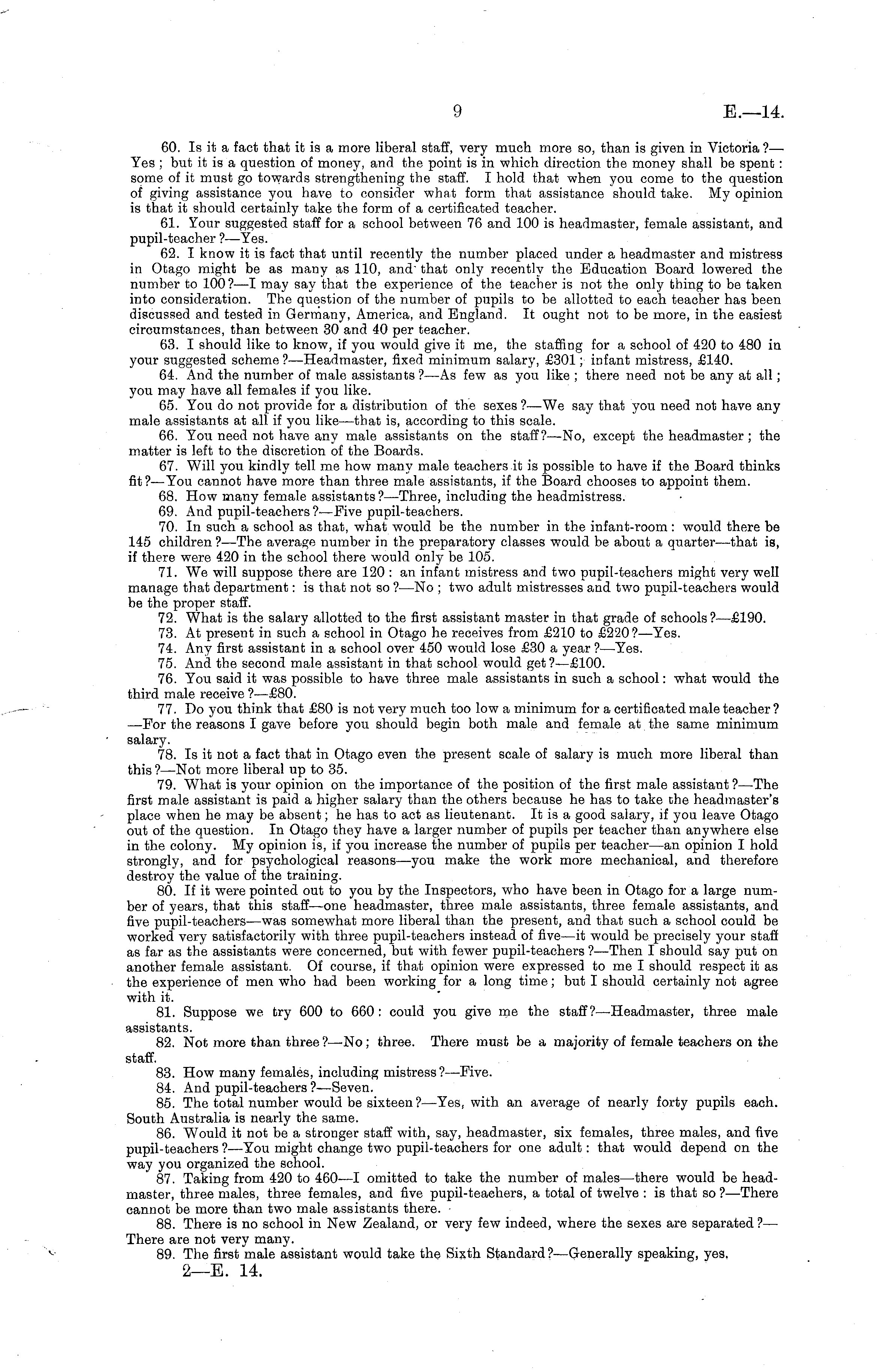 60. Is it a fact that it is a more liberal staff, very much more so, than is given in Victoria ?— Yes ; but it is a question of money, and the point is in which direction the money shall be spent: some of it must go towards strengthening the staff. I hold that when you come to the question of giving assistance you have to consider what form that assistance should take. My opinion is that it should certainly take the form of a certificated teacher. 61. Your suggested staff for a school between 76 and 100 is headmaster, female assistant, and pupil-teacher ? —Yes. 62. I know it is fact that until recently the number placed under a headmaster and mistress in Otago might be as many as 110, and' that only recently the Education Board lowered the number to 100?— I may say that the experience of the teacher is not the only thing to be taken into consideration. The question of the number of pupils to be allotted to each teacher has been discussed and tested in Germany, America, and England. It ought not to be more, in the easiest circumstances, than between 30 and 40 per teacher. 63. I should like to know, if you would give it me, the staffing for a school of 420 to 480 in your suggested scheme ?—Headmaster, fixed minimum salary, £301; infant mistress, £140. 64. And the number of male assistants ?—As few as you like ; there need not be any at all; you may have all females if you like. 65. You do not provide for a distribution of the sexes ?—We say that you need not have any male assistants at all if you like—that is, according to this scale. 66. You need not have any male assistants on the staff?—No, except the headmaster; the matter is left to the discretion of the Boards. 67. Will you kindly tell me how many male teachers it is possible to have if the Board thinks fit?— You cannot have more than three male assistants, if the Board chooses to appoint them. 68. How many female assistants?— Three, including the headmistress. 69. And pupil-teachers ?—Five pupil-teachers. 70. In such a school as that, what would be the number in the infant-room : would there be 145 children ?—The average number in the preparatory classes would be about a quarter—that is, if there were 420 in the school there would only be 105. 71. We will suppose there are 120 : an infant mistress and two pupil-teachers might very well manage that department: is that not so ?—No ; two adult mistresses and two pupil-teachers would be the proper staff. 72. What is the salary allotted to the first assistant master in that grade of schools ?—£l9o. 73. At present in such a school in Otago he receives from £210 to £220?— Yes. 74. Any first assistant in a school over 450 would lose £30 a year ?—Yes. 75. And the second male assistant in that school would get ?—£loo. 76. You said it was possible to have three male assistants in such a school: what would the third male receive ?—£Bo. 77. Do you think that £80 is not very much too low a minimum for a certificated male teacher ? —For the reasons I gave before you should begin both male and female at the same minimum salary. 78. Is it not a fact that in Otago even the present scale of salary is much more liberal than this ? —Not more liberal up to 35. 79. What is your opinion on the importance of the position of the first male assistant ?—The first male assistant is paid a higher salary than the others because he has to take the headmaster's place when he may be absent; he has to act as lieutenant. It is a good salary, if you leave Otago out of the question. In Otago they have a larger number of pupils per teacher than anywhere else in the colony. My opinion is, if you increase the number of pupils per teacher —an opinion I hold strongly, and for psychological reasons—you make the work more mechanical, and therefore destroy the value of the training. 80. If it were pointed out to you by the Inspectors, who have been in Otago for a large number of years, that this staff —one headmaster, three male assistants, three female assistants, and five pupil-teachers —was somewhat more liberal than the present, and that such a school could be worked very satisfactorily with three pupil-teachers instead of five—it would be precisely your staff as far as the assistants were concerned, but with fewer pupil-teachers ?—Then I should say put on another female assistant. Of course, if that opinion were expressed to me I should respect it as the experience of men who had been working for a long time; but I should certainly not agree with it. 81. Suppose we try 600 to 660: could you give me the staff?— Headmaster, three male assistants. 82. Not more than three?—No; three. There must be a majority of female teachers on the staff. 83. How many females, including mistress? —Five. 84. And pupil-teachers ? —Seven. 85. The total number would be sixteen ? —Yes, with an average of nearly forty pupils each. South Australia is nearly the same. 86. Would it not be a stronger staff with, say, headmaster, six females, three males, and five pupil-teachers ?—You might change two pupil-teachers for one adult: that would depend on the way you organized the school. 87. Taking from 420 to 460 —I omitted to take the number of males—there would be headmaster, three males, three females, and five pupil-teachers, a total of twelve : is that so ?—There cannot be more than two male assistants there. 88. There is no school in New Zealand, or very few indeed, where the sexes are separated ?— There are not very many. 89. The first male assistant would take the Sixth Standard? —Generally speaking, yes. 2—E. 14.