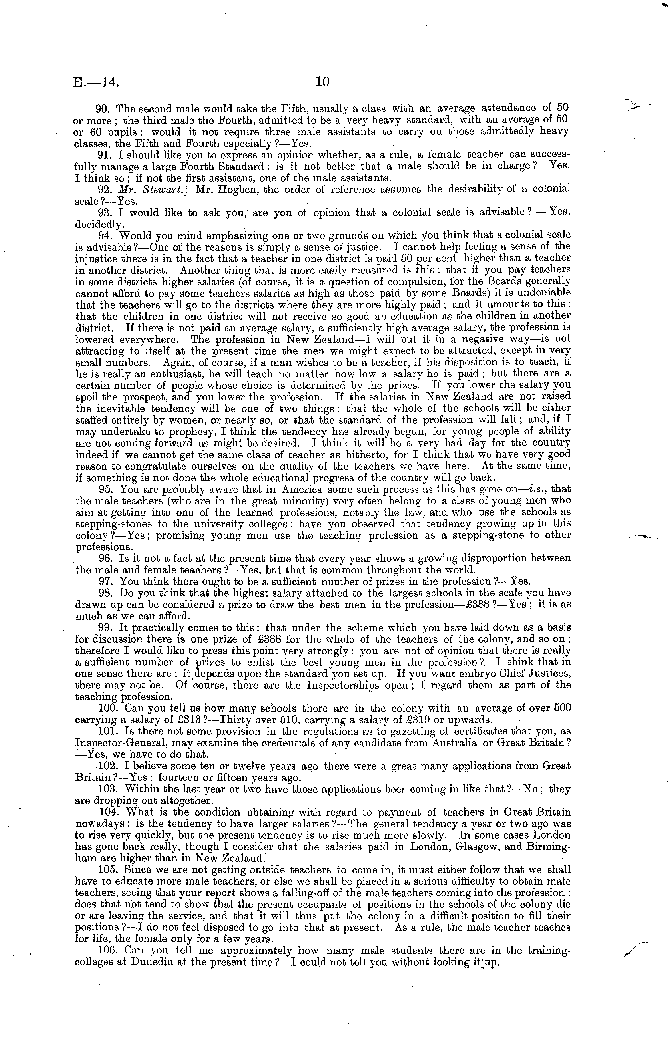 90. The second male would take the Fifth, usually a class with an average attendance of 50 or more ; the third male the Fourth, admitted to be a very heavy standard, with an average of 50 or 60 pupils : would it not require three male assistants to carry on those admittedly heavy classes, the Fifth and Fourth especially ? —Yes. 91. I should like you to express an opinion whether, as a rule, a female teacher can successfully manage a large Fourth Standard : is it not better that a male should be in charge ? —Yes, I think so; if not the first assistant, one of the male assistants. 92. Mr. Stewart.] Mr. Hogben, the order of reference assumes the desirability of a colonial scale ?—Yes. 93. I would like to ask you, are you of opinion that a colonial scale is advisable? — Yes, decidedly. 94. Would you mind emphasizing one or two grounds on which you think that a colonial scale is advisable?— One of the reasons is simply a sense of justice. I cannot help feeling a sense of the injustice there is in the fact that a teacher in one district is paid 50 per cent, higher than a teacher in another district. Another thing that is more easily measured is this : that if you pay teachers in some districts higher salaries (of course, it is a question of compulsion, for the Boards generally cannot afford to pay some teachers salaries as high as those paid by some Boards) it is undeniable that the teachers will go to the districts where they are more highly paid ; and it amounts to this : that the children in one district will not receive so good an education as the children in another district. If there is not paid an average salary, a sufficiently high average salary, the profession is lowered everywhere. The profession in New Zealand—l will put it in a negative way —is not attracting to itself at the present time the men we might expect to be attracted, except in very small numbers. Again, of course, if a man wishes to be a teacher, if his disposition is to teach, if he is really an enthusiast, he will teach no matter how low a salary he is paid ; but there are a certain number of people whose choice is determined by the prizes. If you lower the salary you spoil the prospect, and you lower the profession. If the salaries in New Zealand are not raised the inevitable tendency will be one of two things : that the whole of the schools will be either staffed entirely by women, or nearly so, or that the standard of the profession will fall; and, if I may undertake to prophesy, I think the tendency has already begun, for young people of ability are not coming forward as might be desired. I think it will be a very bad day for the country indeed if we cannot get the same class of teacher as hitherto, for I think that we have very good reason to congratulate ourselves on the quality of the teachers we have here. At the same time, if something is not done the whole educational progress of the country will go back. 95. You are probably aware that in America some such process as this has gone on— i.e., that the male teachers (who are in the great minority) very often belong to a class of young men who aim at getting into one of the learned professions, notably the law, and who use the schools as stepping-stones to the university colleges: have you observed that tendency growing up in this colony ?—Yes; promising young men use the teaching profession as a stepping-stone to other professions. 96. Is it not a fact at the present time that every year shows a growing disproportion between the male and female teachers ?—Yes, but that is common throughout the world. 97. You think there ought to be a sufficient number of prizes in the profession ?—Yes. 98. Do you think that the highest salary attached to the largest schools in the scale you have drawn up can be considered a prize to draw the best men in the profession —£388 ?—Yes ; it is as much as we can afford. 99. It practically comes to this : that under the scheme which you have laid down as a basis for discussion there is one prize of £388 for the whole of the teachers of the colony, and so on ; therefore I would like to press this point very strongly : you are not of opinion that there is really a sufficient number of prizes to enlist the best young men in the profession ?—I think that in one sense there are ; it depends upon the standard you set up. If you want embryo Chief Justices, there may not be. Of course, there are the Inspectorships open; I regard them as part of the teaching profession. 100. Can you tell us how many schools there are in the colony with an average of over 500 carrying a salary of £313 ? —Thirty over 510, carrying a salary of £319 or upwards. 101. Is there not some provision in the regulations as to gazetting of certificates that you, as Inspector-General, may examine the credentials of any candidate from Australia or Great Britain ? —Yes, we have to do that. 102. I believe some ten or twelve years ago there were a great many applications from Great Britain? —Yes; fourteen or fifteen years ago. 103. Within the last year or two have those applications been coming in like that ?—No; they are dropping out altogether. 104. What is the condition obtaining with regard to payment of teachers in Great Britain nowadays : is the tendency to have larger salaries ?—The general tendency a year or two ago was to rise very quickly, but the present tendency is to rise much more slowly. In some cases London has gone back really, though I consider that the salaries paid in London, Glasgow, and Birmingham are higher than in New Zealand. 105. Since we are not getting outside teachers to come in, it must either follow that we shall have to educate more male teachers, or else we shall be placed in a serious difficulty to obtain male teachers, seeing that your report shows a falling-off of the male teachers coming into the profession : does that not tend to show that the present occupants of positions in the schools of the co