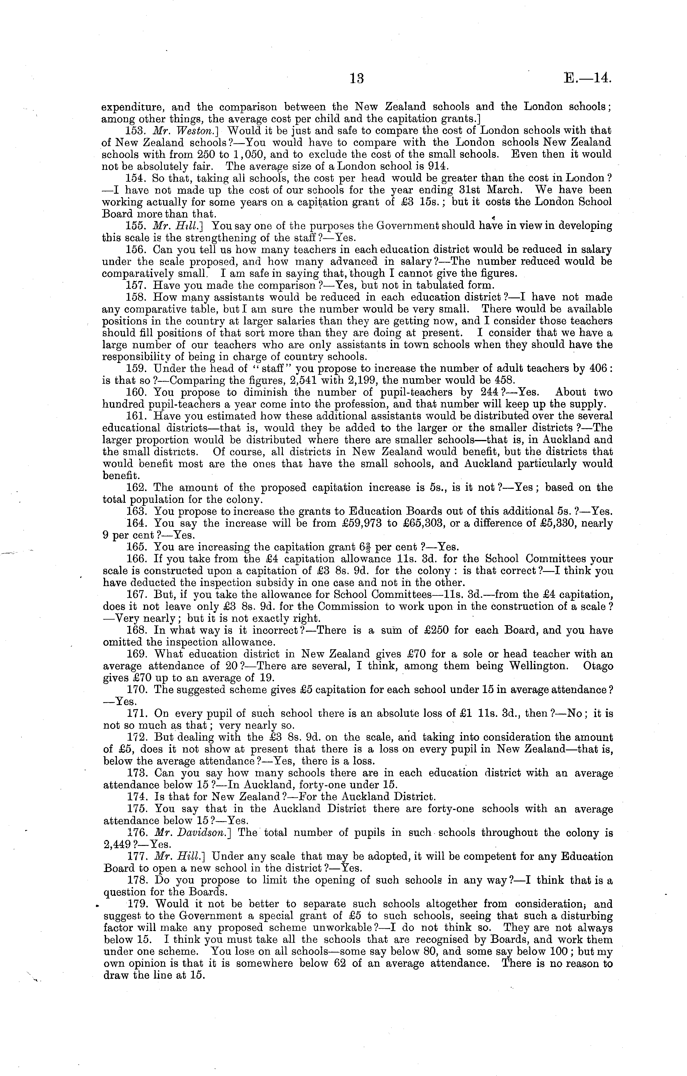 expenditure, and the comparison between the New Zealand schools and the London schools; among other things, the average cost per child and the capitation grants.] 153. Mr. Weston.] Would it be just and safe to compare the cost of London schools with that of New Zealand schools ?—You would have to compare with the London schools New Zealand schools with from 250 to 1,050, and to exclude the cost of the small schools. Even then it would not be absolutely fair. The average size of a London school is 914. 154. So that, taking all schools, the cost per head would be greater than the cost in London ? —I have not made up the cost of our schools for the year ending 31st March. We have been working actually for some years on a capitation grant of £3 155.; but it costs the London School Board more than that. , 155. Mr. Hill.] You say one of the purposes the Government should have in view in developing this scale is the strengthening of the staff?— Yes. 156. Can you tell us how many teachers in each education district would be reduced in salary under the scale proposed, and how many advanced in salary?— The number reduced would be comparatively small. lam safe in saying that, though I cannot give the figures. 157. Have you made the comparison ? —Yes, but not in tabulated form. 158. How many assistants would be reduced in each education district ?—I have not made any comparative table, but lam sure the number would be very small. There would be available positions in the country at larger salaries than they are getting now, and I consider those teachers should fill positions of that sort more than they are doing at present. I consider that we have a large number of our teachers who are only assistants in town schools when they should have the responsibility of being in charge of country schools. 159. Under the head of " staff" you propose to increase the number of adult teachers by 406 : is that so? —Comparing the figures, 2,541 with 2,199, the number would be 458. 160. You propose to diminish the number of pupil-teachers by 244 ? —-Yes. About two hundred pupil-teachers a year come into the profession, and that number will keep up the supply. 161. Have you estimated how these additional assistants would be distributed over the several educational districts—that is, would they be added to the larger or the smaller districts ?—The larger proportion would be distributed where there are smaller schools—that is, in Auckland and the small districts. Of course, all districts in New Zealand would benefit, but the districts that would benefit most are the ones that have the small schools, and Auckland particularly would benefit. 162. The amount of the proposed capitation increase is 55., is it not ?—Yes; based on the total population for the colony. 163. You propose to increase the grants to Education Boards out of this additional ss. ?—Yes. 164. You say the increase will be from £59,973 to £65,303, or a difference of £5,330, nearly 9 per cent ?—Yes. 165. You are increasing the capitation grant 6f per cent ?—Yes. 166. If you take from the £4 capitation allowance lis. 3d. for the School Committees your scale is constructed upon a capitation of £3 Bs. 9d. for the colony :is that correct ?—I think you have deducted the inspection subsidy in one case and not in the other. 167. But, if you take the allowance for School Committees—lis. 3d.—from the £4 capitation, does it not leave only £3 Bs. 9d. for the Commission to work upon in the construction of a scale ? —Very nearly; but it is not exactly right. 168. In what way is it incorrect ?—There is a sum of £250 for each Board, and you have omitted the inspection allowance. 169. What education district in New Zealand gives £70 for a sole or head teacher with an average attendance of 20 ?—There are several, I think, among them being Wellington. Otago gives £70 up to an average of 19. 170. The suggested scheme gives £5 capitation for each school under 15 in average attendance ? —Yes. 171. On every pupil of such school there is an absolute loss of £1 lis. 3d., then? —No; it is not so much as that; very nearly so. 172. But dealing with the £3 Bs. 9d. on the scale, and taking into consideration the amount of £5, does it not show at present that there is a loss on every pupil in New Zealand—that is, below the average attendance?— Yes, there is a loss. 173. Can you say how many schools there are in each education district with an average attendance below 15 ?—ln Auckland, forty-one under 15. 174. Is that for New Zealand? —For the Auckland District. 175. You say that in the Auckland District there are forty-one schools with an average attendance below 15?— Yes. 176. Mr. Davidson.] The total number of pupils in such schools throughout the colony is 2,449 ?—Yes. 177. Mr. Hill.] Under any scale that may be adopted, it will be competent for any Education Board to open a new school in the district ? —Yes. 178. Do you propose to limit the opening of such schools in any way?—l think that is a question for the Boards. 179. Would it not be better to separate such schools altogether from consideration; and suggest to the Government a special grant of £5 to such schools, seeing that such a disturbing factor will make any proposed scheme unworkable ?—I do not think so. They are not always below 15. I think you must take all the schools that are recognised by Boards, and work them under one scheme. You lose on all schools—some say below 80, and some say below 100; but my own opinion is that it is somewhere below 62 of an average attendance. There is no reason to draw the line at 15.