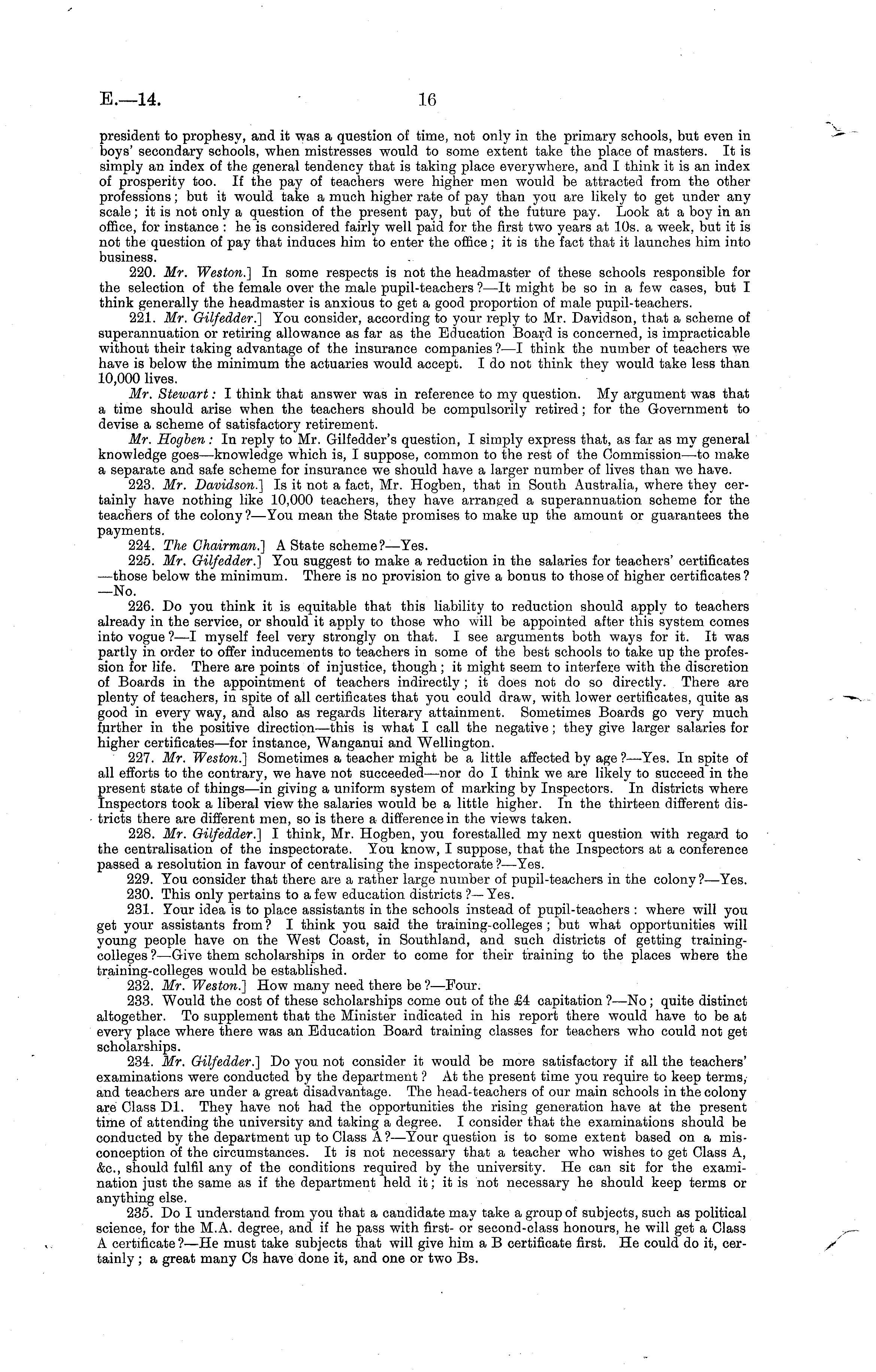president to prophesy, and it was a question of time, not only in the primary schools, but even in boys' secondary schools, when mistresses would to some extent take the place of masters. It is simply an index of the general tendency that is taking place everywhere, and I think it is an index of prosperity too. If the pay of teachers were higher men would be attracted from the other professions; but it would take a much higher rate of pay than you are likely to get under any scale; it is not only a question of the present pay, but of the future pay. Look at a boy in an office, for instance : he is considered fairly well paid for the first two years at 10s. a week, but it is not the question of pay that induces him to enter the office; it is the fact that it launches him into business. 220. Mr. Weston.] In some respects is not the headmaster of these schools responsible for the selection of the female over the male pupil-teachers ?—lt might be so in a few cases, but I think generally the headmaster is anxious to get a good proportion of male pupil-teachers. 221. Mr. Gilfedder.] You consider, according to your reply to Mr. Davidson, that a scheme of superannuation or retiring allowance as far as the Education Board is concerned, is impracticable without their taking advantage of the insurance companies ?—I think the number of teachers we have is below the minimum the actuaries would accept. Ido not think they would take less than 10,000 lives. Mr. Stewart: I think that answer was in reference to my question. My argument was that a time should arise when the teachers should be compulsorily retired; for the Government to devise a scheme of satisfactory retirement. Mr. Hogben: In reply to Mr. Gilfedder's question, I simply express that, as far as my general knowledge goes—knowledge which is, I suppose, common to the rest of the Commission—to make a separate and safe scheme for insurance we should have a larger number of lives than we have. 223. Mr. Davidson.] Is it not a fact, Mr. Hogben, that in South Australia, where they certainly have nothing like 10,000 teachers, they have arranged a superannuation scheme for the teachers of the colony ?—You mean the State promises to make up the amount or guarantees the payments. 224. The Chairman.] A State scheme?— Yes. 225. Mr. Gilfedder.] You suggest to make a reduction in the salaries for teachers' certificates —those below the minimum. There is no provision to give a bonus to those of higher certificates ? —No. 226. Do you think it is equitable that this liability to reduction should apply to teachers already in the service, or should it apply to those who will be appointed after this system comes into vogue ?—I myself feel very strongly on that. I see arguments both ways for it. It was partly in order to offer inducements to teachers in some of the best schools to take up the profession for life. There are points of injustice, though ; it might seem to interfere with the discretion of Boards in the appointment of teachers indirectly ; it does not do so directly. There are plenty of teachers, in spite of all certificates that you could draw, with lower certificates, quite as good in every way, and also as regards literary attainment. Sometimes Boards go very much further in the positive direction—this is what I call the negative; they give larger salaries for higher certificates—for instance, Wanganui and Wellington. 227. Mr. Weston.] Sometimes a teacher might be a little affected by age ?—-Yes. In spite of all efforts to the contrary, we have not succeeded—nor do I think we are likely to succeed in the present state of things—in giving a uniform system of marking by Inspectors. In districts where Inspectors took a liberal view the salaries would be a little higher. In the thirteen different districts there are different men, so is there a difference in the views taken. 228. Mr. Gilfedder.] I think, Mr. Hogben, you forestalled my next question with regard to the centralisation of the inspectorate. You know, I suppose, that the Inspectors at a conference passed a resolution in favour of centralising the inspectorate ?—Yes. 229. You consider that there are a rather large number of pupil-teachers in the colony?— Yes. 230. This only pertains to a few education districts ?— Yes. 231. Your idea is to place assistants in the schools instead of pupil-teachers : where will you get your assistants from ? I think you said the training-colleges ; but what opportunities will young people have on the West Coast, in Southland, and such districts of getting trainingcolleges ?—Give them scholarships in order to come for their training to the places where the training-colleges would be established. 232. Mr. Weston.] How many need there be ?—Four. 233. Would the cost of these scholarships come out of the £4 capitation ?—No; quite distinct altogether. To supplement that the Minister indicated in his report there would have to be at every place where there was an Education Board training classes for teachers who could not get scholarships. 234. Mr. Gilfedder.] Do you not consider it would be more satisfactory if all the teachers' examinations were conducted by the department ? At the present time you require to keep terms,and teachers are under a great disadvantage. The head-teachers of our main schools in the colony are Class Dl. They have not had the opportunities the rising generation have at the present time of attending the university and taking a degree. I consider that the examinations should be conducted by the department up to Class A?— Your question is to some extent based on a misconception of the circumstances. It is not necessary that a teacher who wishes to get Class A, &c, should fulfil any of the conditions required by the university. He can sit for the examination just the same as if the department held it; it is not necessary he should keep terms or anything else. 235. Do I understand from you that a candidat