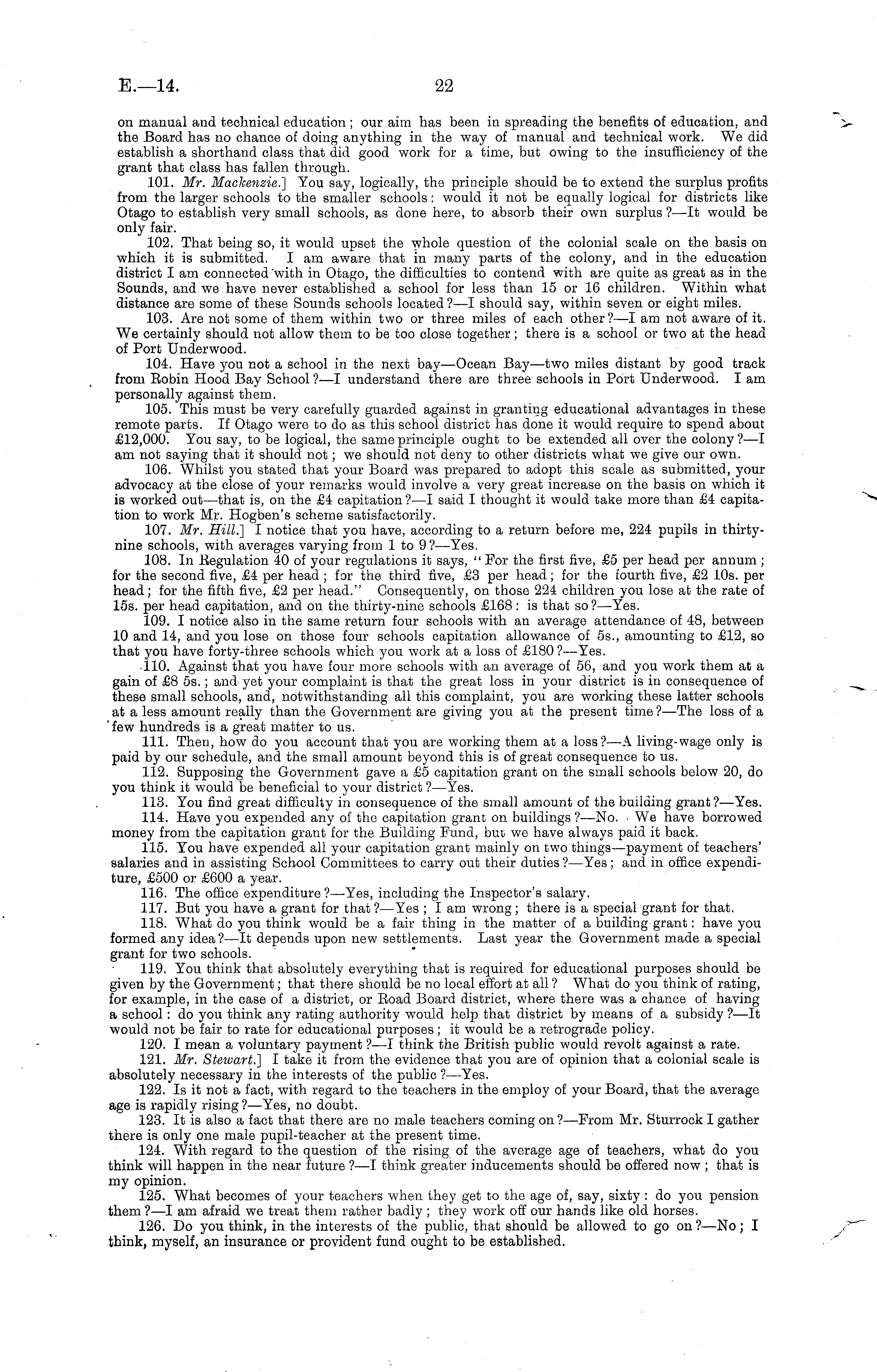 on manual and technical education ; our aim has been in spreading the benefits of education, and the Board has no chance of doing anything in the way of manual and technical work. We did establish a shorthand class that did good work for a time, but owing to the insufficiency of the grant that class has fallen through. 101. Mr. Mackenzie.] You say, logically, the principle should be to extend the surplus profits from the larger schools to the smaller schools: would it not be equally logical for districts like Otago to establish very small schools, as done here, to absorb their own surplus ? —lt would be only fair. 102. That being so, it would upset the whole question of the colonial scale on the basis on which it is submitted. I am aware that in many parts of the colony, and in the education district I am connected "with in Otago, the difficulties to contend with are quite as great as in the Sounds, and we have never established a school for less than 15 or 16 children. Within what distance are some of these Sounds schools located ? —I should say, within seven or eight miles. 103. Are not some of them within two or three miles of each other?—l am not aware of it. We certainly should not allow them to be too close together; there is a school or two at the head of Port Underwood. 104. Have you not a school in the next bay—Ocean Bay —two miles distant by good track from Bobin Hood Bay School ?—I understand there are three schools in Port Underwood. lam personally against them. 105. This must be very carefully guarded against in granting educational advantages in these remote parts. If Otago were to do as this school district has done it would require to spend about £12,000. You say, to be logical, the same principle ought to be extended all over the colony ?—I am not saying that it should not; we should not deny to other districts what we give our own. 106. Whilst you stated that your Board was prepared to adopt this scale as submitted, your advocacy at the close of your remarks would involve a very great increase on the basis on which it is worked out—that is, on the £4 capitation ?—I said I thought it would take more than £4 capitation to work Mr. Hogben's scheme satisfactorily. 107. Mr. Hill.] I notice that you have, according to a return before me, 224 pupils in thirtynine schools, with averages varying from 1 to 9? —Yes. 108. In Begulation 40 of your regulations it says, " For the first five, £5 per head per annum ; for the second five, £4 per head; for the third five, £3 per head; for the fourth five, £2 10s. per head; for the fifth five, £2 per head." Consequently, on those 224 children you lose at the rate of 15s. per head capitation, and on the thirty-nine schools £168 : is that so ? —Yes. 109. I notice also in the same return four schools with an average attendance of 48, between 10 and 14, and you lose on those four schools capitation allowance of 55., amounting to £12, so that you have forty-three schools which you work at a loss of £180?— Yes. ■ 110. Against that you have four more schools with an average of 56, and you work them at a gain of £8 55.; and yet your complaint is that the great loss in your district is in consequence of these small schools, and, notwithstanding all this complaint, you are working these latter schools at a less amount really than the Government are giving you at the present time ? —The loss of a 'few hundreds is a great matter to us. 111. Then, how do you account that you are working them at a loss?—A living-wage only is paid by our schedule, and the small amount beyond this is of great consequence to us. 112. Supposing the Government gave a £5 capitation grant on the small schools below 20, do you think it would be beneficial to your district ? —Yes. 113. You find great difficulty in consequence of the small amount of the building grant?— Yes. 114. Have you expended any of the capitation grant on buildings? —No. ■ We have borrowed money from the capitation grant for the Building Fund, but we have always paid it back. 115. You have expended all your capitation grant mainly on two things —payment of teachers' salaries and in assisting School Committees to carry out their duties ? —Yes ; and in office expenditure, £500 or £600 a year. 116. The office expenditure ?—Yes, including the Inspector's salary. 117. But you have a grant for that ?—Yes ; I am wrong ; there is a special grant for that. 118. What do you think would be a fair thing in the matter of a building grant: have you formed any idea?—lt depends upon new settlements. Last year the Government made a special grant for two schools. 119. You think that absolutely everything that is required for educational purposes should be given by the Government; that there should be no local effort at all ? What do you think of rating, for example, in the case of a district, or Boad Board district, where there was a chance of having a school: do you think any rating authority would help that district by means of a subsidy ?—lt would not be fair to rate for educational purposes; it would be a retrograde policy. 120. I mean a voluntary payment ?—I think the British public would revolt against a rate. 121. Mr. Steiuart.] I take it from the evidence that you are of opinion that a colonial scale is absolutely necessary in the interests of the public ? —Yes. 122. Is it not a fact, with regard to the teachers in the employ of your Board, that the average age is rapidly rising?— Yes, no doubt. 123. It is also a fact that there are no male teachers coming on ?—From Mr. Sturrock I gather there is only one male pupil-teacher at the present time. 124. With regard to the question of the rising of the average age of teachers, what do you think will happen in the near future ?—I think greater inducements should be offered now ; that is my opinion. 125. What becomes of your teachers when they get to the age of, say, sixty : do you pension them ?—I