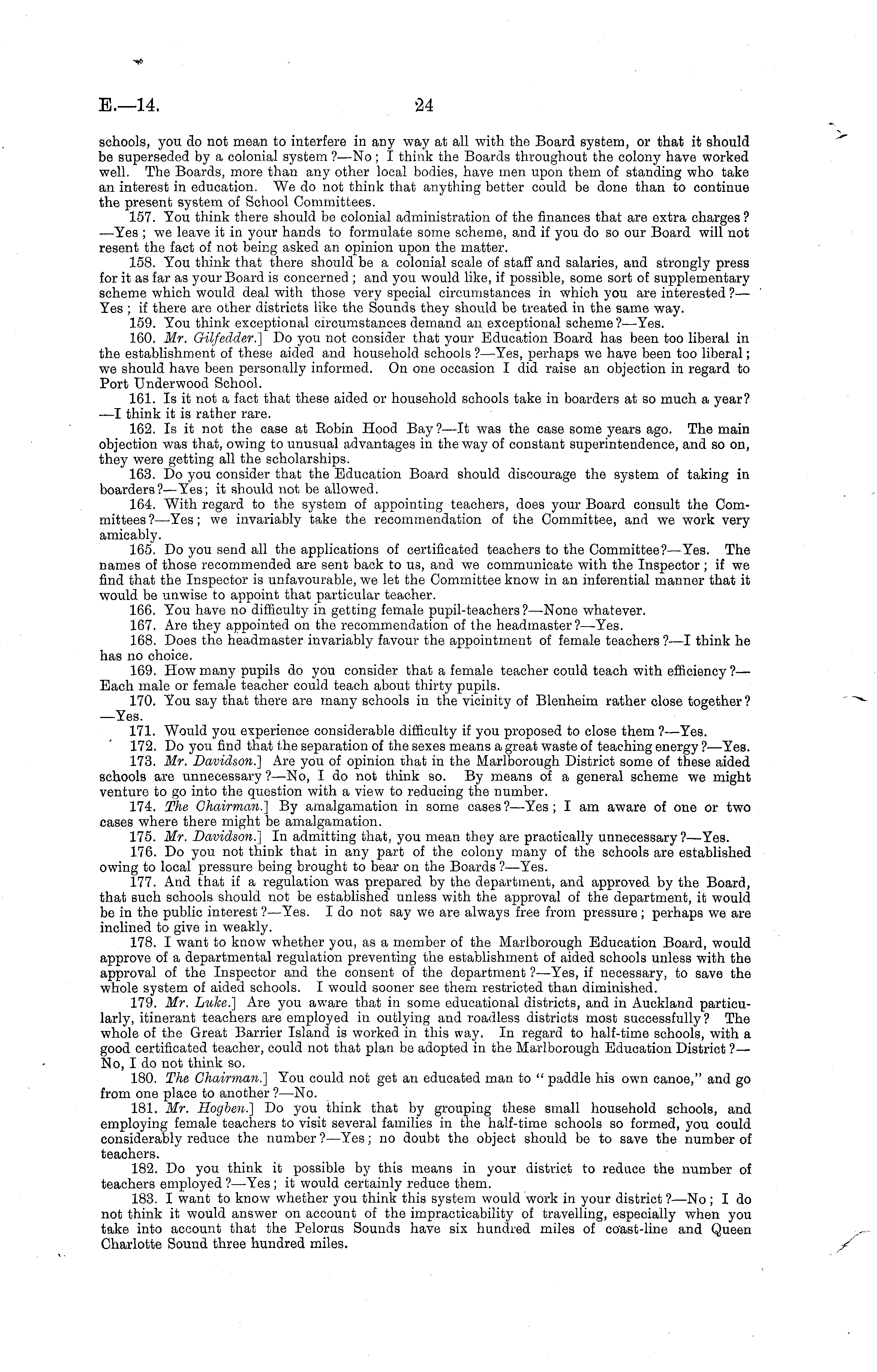 schools, you do not mean to interfere in any way at all with the Board system, or that it should be superseded by a colonial system ?—No; I think the Boards throughout the colony have worked well. The Boards, more than any other local bodies, have men upon them of standing who take an interest in education. We do not think that anything better could be done than to continue the present system of School Committees. 157. You think there should be colonial administration of the finances that are extra charges ? —Yes ;we leave it in your hands to formulate some scheme, and if you do so our Board will not resent the fact of not being asked an opinion upon the matter. 158. You think that there should be a colonial scale of staff and salaries, and strongly press for it as far as your Board is concerned ; and you would like, if possible, some sort of supplementary scheme which would deal with those very special circumstances in which you are interested ? — Yes ; if there are other districts like the Sounds they should be treated in the same way. 159. You think exceptional circumstances demand an exceptional scheme ?—Yes. 160. Mr. Gilfedder.] Do you not consider that your Education Board has been too liberal in the establishment of these aided and household schools ?—Yes, perhaps we have been too liberal; we should have been personally informed. On one occasion I did raise an objection in regard to Port Underwood School. 161. Is it not a fact that these aided or household schools take in boarders at so much a year? —I think it is rather rare. 162. Is it not the case at Bobin Hood Bay?—lt was the case some years ago. The main objection was that, owing to unusual advantages in the way of constant superintendence, and so on, they were getting all the scholarships. 163. Do you consider that the Education Board should discourage the system of taking in boarders?— Yes; it should not be allowed. 164. With regard to the system of appointing teachers, does your Board consult the Committees ?—Yes; we invariably take the recommendation of the Committee, and we work very amicably. 165. Do you send all the applications of certificated teachers to the Committee?— Yes. The names of those recommended are sent back to us, and we communicate with the Inspector; if we find that the Inspector is unfavourable, we let the Committee know in an inferential manner that it would be unwise to appoint that particular teacher. 166. You have no difficulty in getting female pupil-teachers ?—None whatever. 167. Are they appointed on the recommendation of the headmaster?— Yes. 168. Does the headmaster invariably favour the appointment of female teachers ?—I think he has no choice. 169. How many pupils do you consider that a female teacher could teach with efficiency ?— Each male or female teacher could teach about thirty pupils. 170. You say that there are many schools in the vicinity of Blenheim rather close together? —Yes. 171. Would you experience considerable difficulty if you proposed to close them ? —Yes. 172. Do you find that the separation of the sexes means a great waste of teaching energy ?—Yes. 173. Mr. Davidson.] Are you of opinion that in the Marlborough District some of these aided schools are unnecessary ? —No, Ido not think so. By means of a general scheme we might venture to go into the question with a view to reducing the number. 174. The Chairman.] By amalgamation in some cases? —Yes; I am aware of one or two cases where there might be amalgamation. 175. Mr. Davidson.] In admitting that, you mean they are practically unnecessary ?—Yes. 176. Do you not think that in any part of the colony many of the schools are established owing to local pressure being brought to bear on the Boards ?—Yes. 177. And that if a regulation was prepared by the department, and approved by the Board, that such schools should not be established unless with the approval of the department, it would be in the public interest ?—Yes. I do not say we are always free from pressure; perhaps we are inclined to give in weakly. 178. I want to know whether you, as a member of the Marlborough Education Board, would approve of a departmental regulation preventing the establishment of aided schools unless with the approval of the Inspector and the consent of the department ?—Yes, if necessary, to save the whole system of aided schools. I would sooner see them restricted than diminished. 179. Mr. Luke.] Are you aware that in some educational districts, and in Auckland particularly, itinerant teachers are employed in outlying and roadless districts most successfully? The whole of the Great Barrier Island is worked in this way. In regard to half-time schools, with a good certificated teacher, could not that plan be adopted in the Marlborough Education District ?— No, I do not think so. 180. The Chairman.] You could not get an educated man to " paddle his own canoe," and go from one place to another ?—No. 181. Mr. Hogben.] Do you think that by grouping these small household schools, and employing female teachers to visit several families in the half-time schools so formed, you could considerably reduce the number ?—Yes; no doubt the object should be to save the number of teachers. 182. Do you think it possible by this means in your district to reduce the number of teachers employed ?—Yes; it would certainly reduce them. 183. I want to know whether you think this system would work in your district ?—No ; I do not think it would answer on account of the impracticability of travelling, especially when you take into account that the Pelorus Sounds have six hundred miles of coast-line and Queen Charlotte Sound three hundred miles.