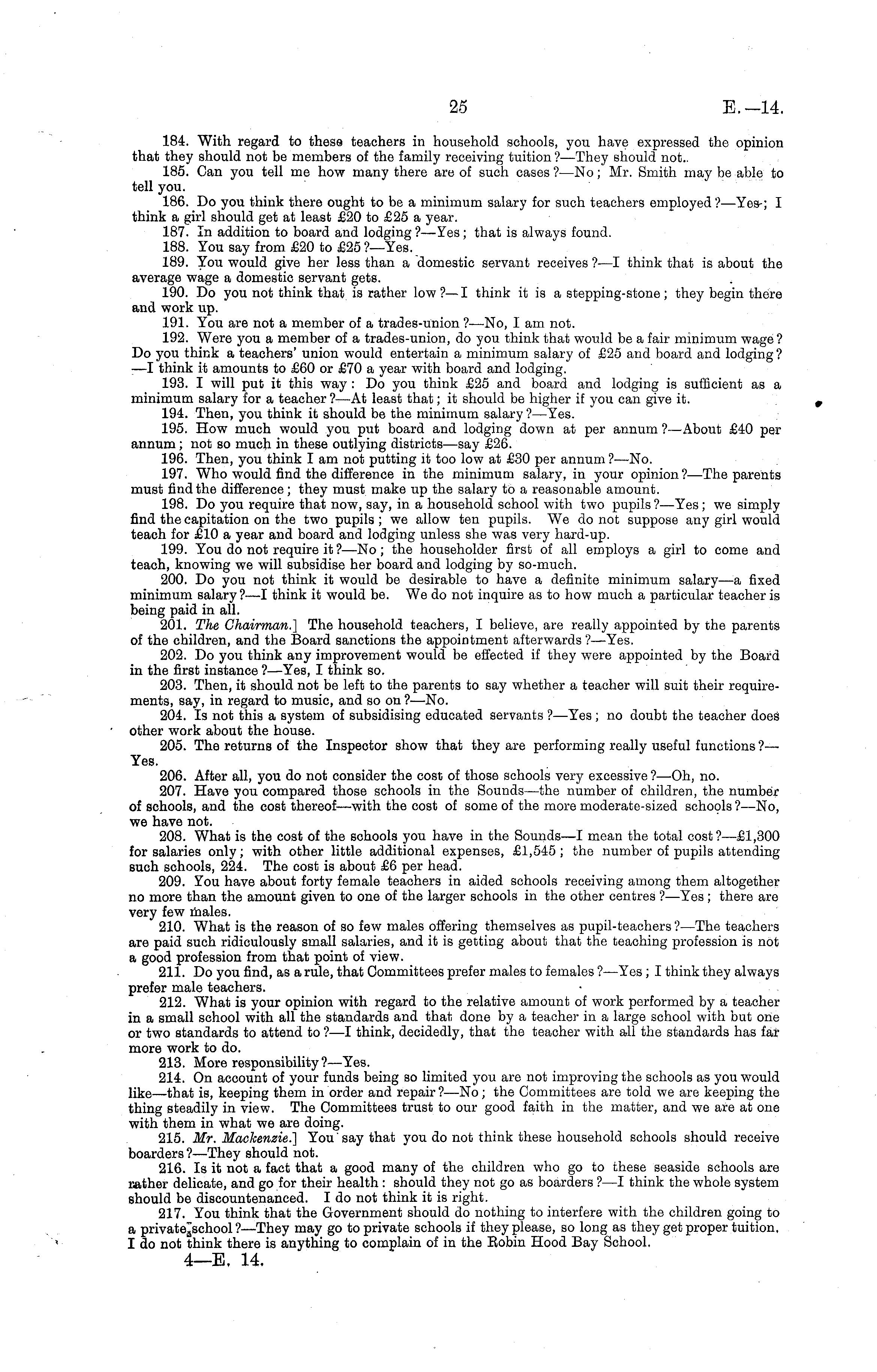 184. With regard to these teachers in household schools, you have expressed the opinion that they should not be members of the family receiving tuition ? —They should not.. 185. Can you tell me how many there are of such cases ?—No; Mr. Smith may be able to tell you. 186. Do you think there ought to be a minimum salary for such teachers employed ? —Yes-; I think a girl should get at least £20 to £25 a year. 187. In addition to board and lodging ?—-Yes; that is always found. 188. You say from £20 to £25 ?—Yes. 189. You would give her less than a domestic servant receives ?—I think that is about the average wage a domestic servant gets. 190. Do you not think that is rather low?—I think it is a stepping-stone; they begin there and work up. 191. You are not a member of a trades-union ? —No, I am not. 192. Were you a member of a trades-union, do you think that would be a fair minimum wage ? Do you think a teachers' union would entertain a minimum salary of £25 and board and lodging ? —I think it amounts to £60 or £70 a year with board and lodging. 193. I will put it this way : Do you think £25 and board and lodging is sufficient as a minimum salary for a teacher ? —At least that; it should be higher if you can give it. 194. Then, you think it should be the minimum salary ? —Yes. 195. How much would you put board and lodging down at per annum ?—About £40 per annum; not so much in these outlying districts —say £26. 196. Then, you think I am not putting it too low at £30 per annum ?—No. 197. Who would find the difference in the minimum salary, in your opinion?— The parents must find the difference; they must make up the salary to a reasonable amount. 198. Do you require that now, say, in a household school with two pupils ?—Yes; we simply find the capitation on the two pupils; we allow ten pupils. We do not suppose any girl would teach for £10 a year and board and lodging unless she was very hard-up. 199. You do not require it ?—No; the householder first of all employs a girl to come and teach, knowing we will subsidise her board and lodging by so-much. 200. Do you not think it would be desirable to have a definite minimum salary—a fixed minimum salary ?—I think it would be. We do not inquire as to how much a particular teacher is being paid in all. 201. The Chairman.] The household teachers, I believe, are really appointed by the parents of the children, and the Board sanctions the appointment afterwards ?—Yes. 202. Do you think any improvement would be effected if they were appointed by the Board in the first instance ?—Yes, I think so. 203. Then, it should not be left to the parents to say whether a teacher will suit their requirements, say, in regard to music, and so on ?—No. 204. Is not this a system of subsidising educated servants ? —Yes ; no doubt the teacher does other work about the house. 205. The returns of the Inspector show that they are performing really useful functions ?— Yes. 206. After all, you do not consider the cost of those schools very excessive ?—Oh, no. 207. Have you compared those schools in the Sounds—the number of children, the number of schools, and the cost thereof—-with the cost of some of the more moderate-sized schools ?—No, we have not. 208. What is the cost of the schools you have in the Sounds—l mean the total cost? —£1,300 for salaries only; with other little additional expenses, £1,545 ; the number of pupils attending such schools, 224. The cost is about £6 per head. 209. You have about forty female teachers in aided schools receiving among them altogether no more than the amount given to one of the larger schools in the other centres ?—Yes ; there are very few males. 210. What is the reason of so few males offering themselves as pupil-teachers ? —The teachers are paid such ridiculously small salaries, and it is getting about that the teaching profession is not a good profession from that point of view. 211. Do you find, as a rule, that Committees prefer males to females ?—Yes; I think they always prefer male teachers. 212. What is your opinion with regard to the relative amount of work performed by a teacher in a small school with all the standards and that done by a teacher in a large school with but one or two standards to attend to ?—I think, decidedly, that the teacher with all the standards has far more work to do. 213. More responsibility ?—Yes. 214. On account of your funds being so limited you are not improving the schools as you would like—that is, keeping them in order and repair?—No; the Committees are told we are keeping the thing steadily in view. The Committees trust to our good faith in the matter, and we are at one with them in what we are doing. 215. Mr. Mackenzie.] You say that you do not think these household schools should receive boarders ?—They should not. 216. Is it not a fact that a good many of the children who go to these seaside schools are Bather delicate, and go for their health : should they not go as boarders ? —I think the whole system should be discountenanced. Ido not think it is right. 217. You think that the Government should do nothing to interfere with the children going to a ?—They may go to private schools if they please, so long as they get proper tuition, I do not think there is anything to complain of in the Bobin Hood Bay School. 4—E, 14.
