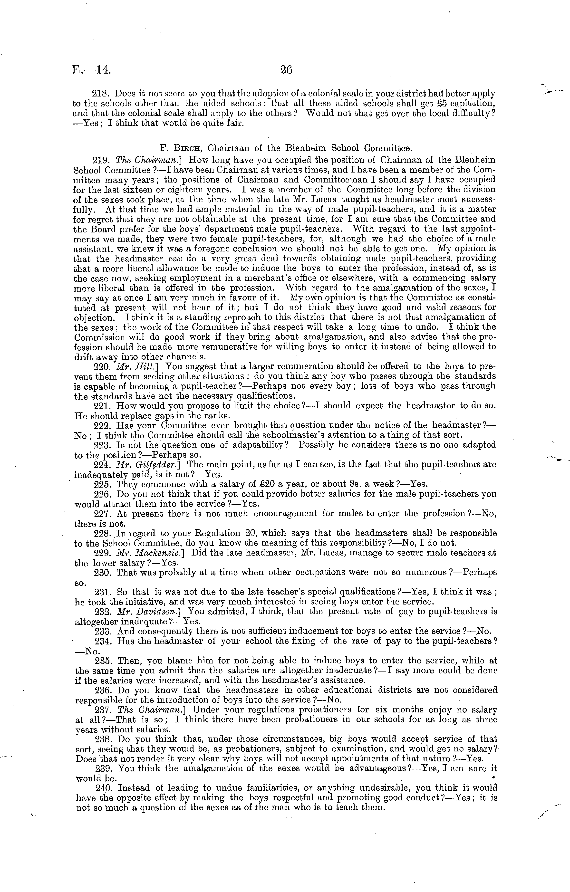 218. Does it not seem to you that the adoption of a colonial scale in your district had better apply to the schools other than the aided schools: that all these aided schools shall get £5 capitation, and that the colonial scale shall apply to the others ? Would not that get over the local difficulty ? —Yes; I think that would be quite fair. F. Birch, Chairman of the Blenheim School Committee. 219. The Chairman.] How long have you occupied the position of Chairman of the Blenheim School Committee ? —I have been Chairman at various times, and I have been a member of the Committee many years; the positions of Chairman and Committeeman I should say I have occupied for the last sixteen or eighteen years. I was a member of the Committee long before the division of the sexes took place, at the time when the late Mr. Lucas taught as headmaster most successfully. At that time we had ample material in the way of male pupil-teachers, and it is a matter for regret that they are not obtainable at the present time, for I am sure that the Committee and the Board prefer for the boys' department male pupil-teachers. With regard to the last appointments we made, they were two female pupil-teachers, for, although we had the choice of a male assistant, we knew it was a foregone conclusion we should not be able to get one. My opinion is that the headmaster can do a very great deal towards obtaining male pupil-teachers, providing that a more liberal allowance be made to induce the boys to enter the profession, instead of, as is the case now, seeking employment in a merchant's office or elsewhere, with a commencing salary more liberal than is offered in the profession. With regard to the amalgamation of the sexes, I may say at once lam very much in favour of it. My own opinion is that the Committee as constituted at present will not hear of it; but I do not think they have good and valid reasons for objection. I think it is a standing reproach to this district that there is not that amalgamation of the sexes; the work of the Committee in that respect will take a long time to undo. I think the Commission will do good work if they bring about amalgamation, and also advise that the profession should be made more remunerative for willing boys to enter it instead of being allowed to drift away into other channels. 220. Mr. Hill.] You suggest that a larger remuneration should be offered to the boys to prevent them from seeking other situations : do you think any boy who passes through the standards is capable of becoming a pupil-teacher ?—Perhaps not every boy ; lots of boys who pass through the standards have not the necessary qualifications. 221. How would you propose to limit the choice?—l should expect the headmaster to do so. He should replace gaps in the ranks. 222. Has your Committee ever brought that question under the notice of the headmaster?— No ; I think the Committee should call the schoolmaster's attention to a thing of that sort. 223. Is not the question one of adaptability? Possibly he considers there is no one adapted to the position ?—Perhaps so. 224. Mr. Gilfedder.] The main point, as far as I can see, is the fact that the pupil-teachers are inadequately paid, is it not ?—Yes. 225. They commence with a salary of £20 a year, or about Bs. a week ?—Yes. 226. Do you not think that if you could provide better salaries for the male pupil-teachers you would attract them into the service ?—Yes. 227. At present there is not much encouragement for males to enter the profession?—No, there is not. 228. In regard to your Begulation 20, which says that the headmasters shall be responsible to the School Committee, do you know the meaning of this responsibility?—No, I do not. 229. Mr. Mackenzie.] Did the late headmaster, Mr. Lucas, manage to secure male teachers at the lower salary ? —Yes. 230. That was probably at a time when other occupations were not so numerous ? —Perhaps so. 231. So that it was not due to the late teacher's special qualifications?— Yes, I think it was ; he took the initiative, and was very much interested in seeing boys enter the service. 232. Mr. Davidson.] You admitted, I think, that the present rate of pay to pupil-teachers is altogether inadequate ?—Yes. 233. And consequently there is not sufficient inducement for boys to enter the service ?—No. 234. Has the headmaster of your school the fixing of the rate of pay to the pupil-teachers ? —No. 235. Then, you blame him for not being able to induce boys to enter the service, while at the same time you admit that the salaries are altogether inadequate ?—I say more could be done if the salaries were increased, and with the headmaster's assistance, 236. Do you know that the headmasters in other educational districts are not considered responsible for the introduction of boys into the service ? —No. 237. The Chairman.] Under your regulations probationers for six months enjoy no salary at all ? —That is so; I think there have been probationers in our schools for as long as three years without salaries. 238. Do you think that, under those circumstances, big boys would accept service of that sort, seeing that they would be, as probationers, subject to examination, and would get no salary? Does that not render it very clear why boys will not accept appointments of that nature ?—Yes. 239. You think the amalgamation of the sexes would be advantageous ?—Yes, I am sure it would be. * 240. Instead of leading to undue familiarities, or anything undesirable, you think it would have the opposite effect by making the boys respectful and promoting good conduct ? —Yes; it is not so much a question of the sexes as of the man who is to teach them.