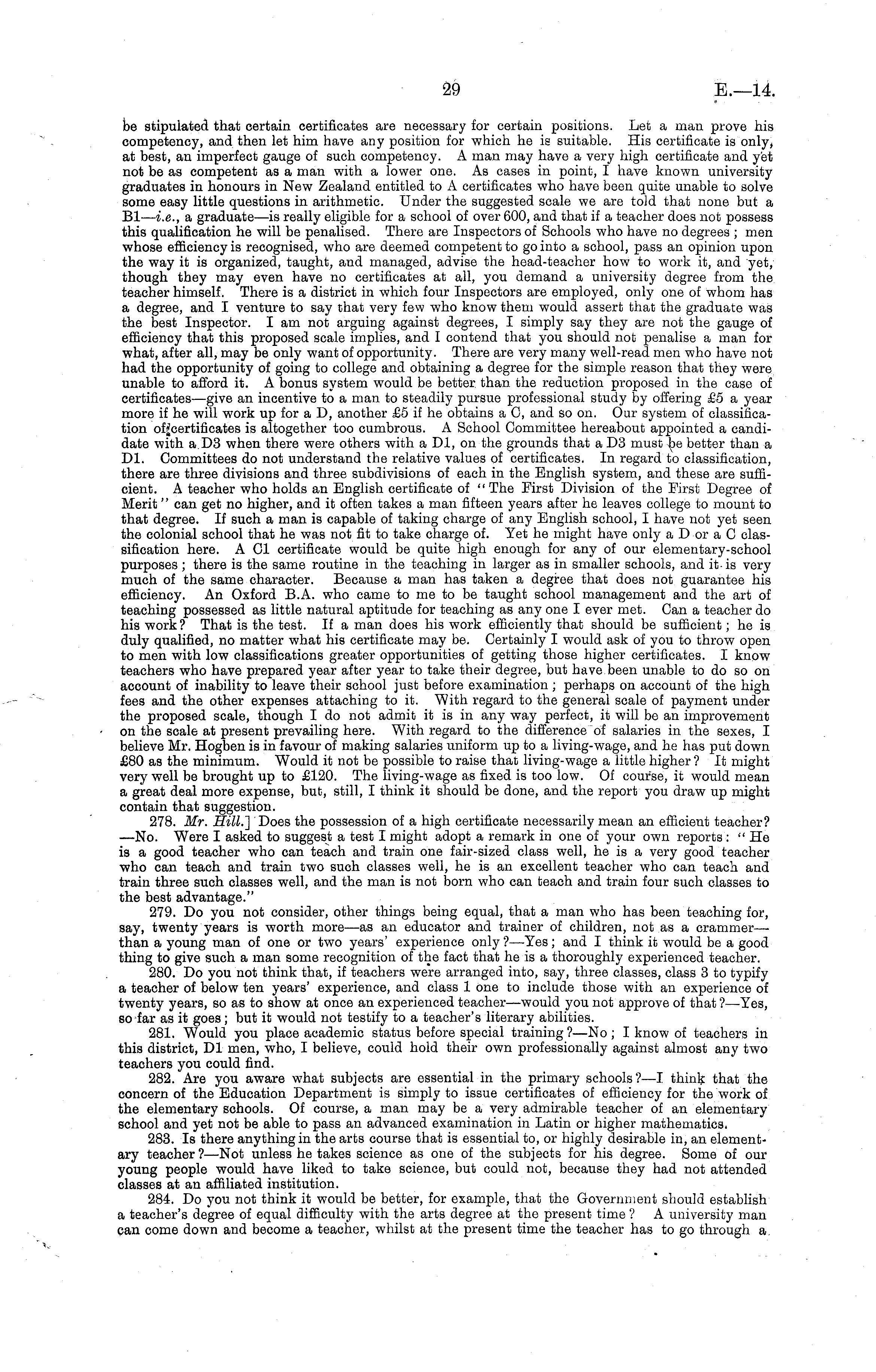 be stipulated that certain certificates are necessary for certain positions. Let a man prove his competency, and then let him have any position for which he is suitable. His certificate is only, at best, an imperfect gauge of such competency. A man may have a very high certificate and yet not be as competent as a man with a lower one. As cases in point, I have known university graduates in honours in New Zealand entitled to A certificates who have been quite unable to solve some easy little questions in arithmetic. Under the suggested scale we are told that none but a Bl — i.e., a graduate —is really eligible for a school of over 600, and that if a teacher does not possess this qualification he will be penalised. There are Inspectors of Schools who have no degrees ; men whose efficiency is recognised, who are deemed competent to go into a school, pass an opinion upon the way it is organized, taught, and managed, advise the head-teacher how to work it, and yet, though they may even have no certificates at all, you demand a university degree from the teacher himself. There is a district in which four Inspectors are employed, only one of whom has a degree, and I venture to say that very few who know them would assert that the graduate was the best Inspector. I am not arguing against degrees, I simply say they are not the gauge of efficiency that this proposed scale implies, and I contend that you should not penalise a man for what, after all, may be only want of opportunity. There are very many well-read men who have not had the opportunity of going to college and obtaining a degree for the simple reason that they were unable to afford it. A bonus system would be better than the reduction proposed in the case of certificates —give an incentive to a man to steadily pursue professional study by offering £5 a year more if he will work up for aD, another £5 if he obtains aC, and so on. Our system of classification offcertificates is altogether too cumbrous. A School Committee hereabout appointed a candidate with a D 3 when there were others with a Dl, on the grounds that a D 3 must be better than a Dl. Committees do not understand the relative values of certificates. In regard to classification, there are three divisions and three subdivisions of each in the English system, and these are sufficient. A teacher who holds an English certificate of "The First Division of the First Degree of Merit" can get no higher, and it often takes a man fifteen years after he leaves college to mount to that degree. If such a man is capable of taking charge of any English school, I have not yet seen the colonial school that he was not fit to take charge of. Yet he might have only aDor a C classification here. ACI certificate would be quite high enough for any of our elementary-school purposes; there is the same routine in the teaching in larger as in smaller schools, and it is very much of the same character. Because a man has taken a degree that does not guarantee his efficiency. An Oxford B.A. who came to me to be taught school management and the art of teaching possessed as little natural aptitude for teaching as any one I ever met. Can a teacher do his work? That is the test. If a man does his work efficiently that should be sufficient; he is duly qualified, no matter what his certificate may be. Certainly I would ask of you to throw open to men with low classifications greater opportunities of getting those higher certificates. I know teachers who have prepared year after year to take their degree, but have been unable to do so on account of inability to leave their school just before examination ; perhaps on account of the high fees and the other expenses attaching to it. With regard to the general scale of payment under the proposed scale, though I do not admit it is in any way perfect, it will be an improvement on the scale at present prevailing here. With regard to the difference of salaries in the sexes, I believe Mr. Hogben is in favour of making salaries uniform up to a living-wage, and he has put down £80 as the minimum. Would it not be possible to raise that living-wage a little higher ? It might very well be brought up to £120. The living-wage as fixed is too low. Of course, it would mean a great deal more expense, but, still, I think it should be done, and the report you draw up might contain that suggestion. 278. Mr. Hill.] Does the possession of a high certificate necessarily mean an efficient teacher? —No. Were I asked to suggest a test I might adopt a remark in one of your own reports : " He is a good teacher who can teach and train one fair-sized class well, he is a very good teacher who can teach and train two such classes well, he is an excellent teacher who can teach and train three such classes well, and the man is not born who can teach and train four such classes to the best advantage." 279. Do you not consider, other things being equal, that a man who has been teaching for, say, twenty years is worth more—as an educator and trainer of children, not as a crammer—■ than a young man of one or two years' experience only ?—Yes; and I think it would be a good thing to give such a man some recognition of the fact that he is a thoroughly experienced teacher. 280. Do you not think that, if teachers were arranged into, say, three classes, class 3 to typify a teacher of below ten years' experience, and class 1 one to include those with an experience of twenty years, so as to show at once an experienced teacher—-would you not approve of that ?—Yes, so far as it goes; but it would not testify to a teacher's literary abilities. 281. Would you place academic status before special training ?—No ; I know of teachers in this district, Dl men, who, I believe, could hold their own professionally against almost any two teachers you could find. 282. Are you aware what subjects are essential in the primary schools?—l think that the concern of the Education Department is simply to