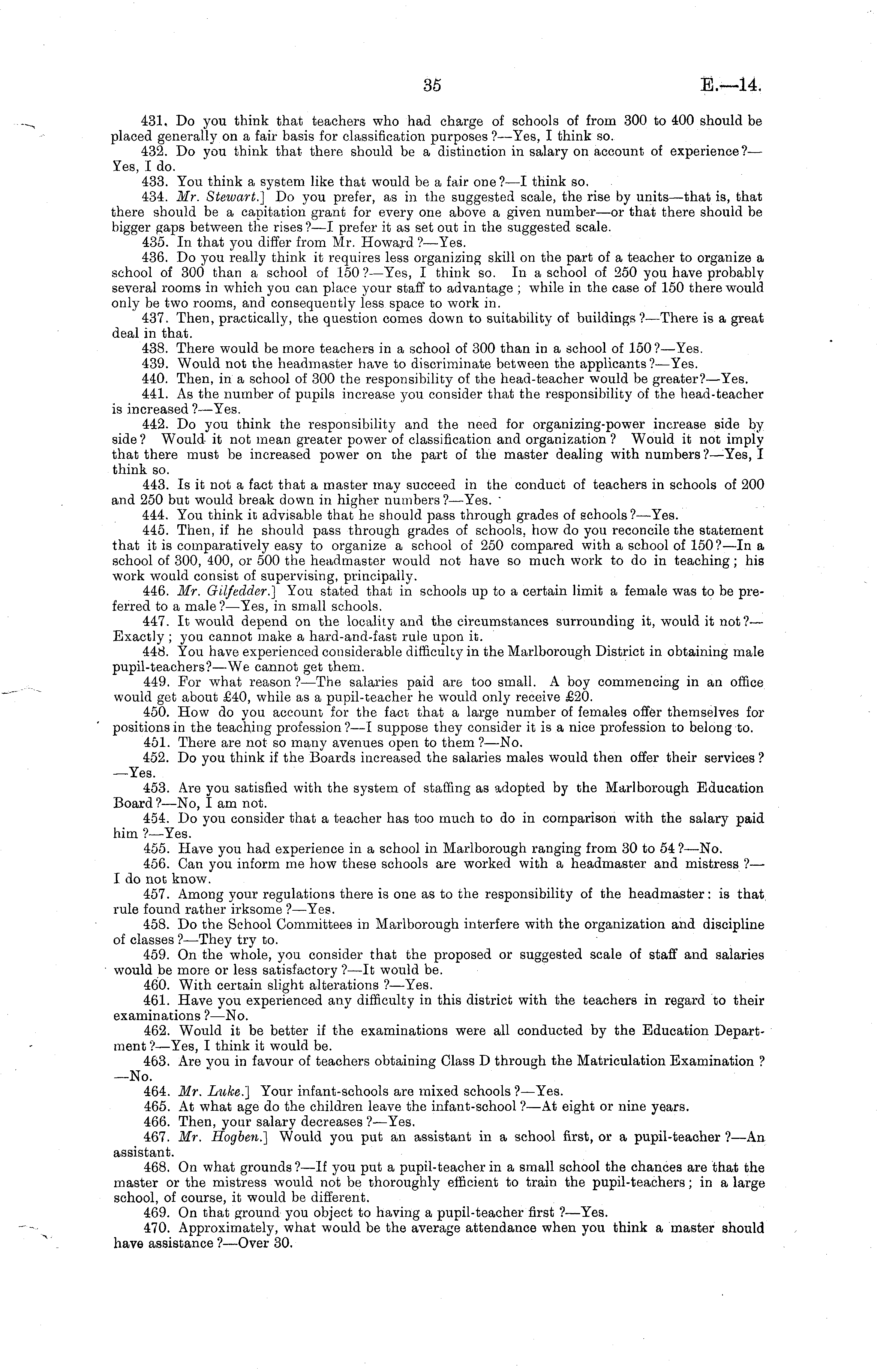 431. Do you think that teachers who had charge of schools of from 300 to 400 should be placed generally on a fair basis for classification purposes ? —Yes, I think so. 432. Do you think that there should be a distinction in salary on account of experience?— Yes, I do. 433. You think a system like that would be a fair one? —I think so. 434. Mr. Stewart.] Do you prefer, as in the suggested scale, the rise by units—that is, that there should be a capitation grant for every one above a given number—or that there should be bigger gaps between the rises?—l prefer it as set out in the suggested scale. 435. In that you differ from Mr. Howard ? —Yes. 436. Do you really think it requires less organizing skill on the part of a teacher to organize a school of 300 than a school of 150 ? —Yes, I think so. In a school of 250 you have probably several rooms in which you can place your staff to advantage ; while in the case of 150 there would only be two rooms, and consequently less space to work in. 437. Then, practically, the question comes down to suitability of buildings ?—There is a great deal in that. 438. There would be more teachers in a school of 300 than in a school of 150?— Yes. 439. Would not the headmaster have to discriminate between the applicants ?—Yes. 440. Then, in a school of 300 the responsibility of the head-teacher would be greater?— Yes. 441. As the number of pupils increase you consider that the responsibility of the head-teacher is increased ? —Yes. 442. Do you think the responsibility and the need for organizing-power increase side by side ? Would- it not mean greater power of classification and organization ? Would it not imply that there must be increased power on the part of the master dealing with numbers ?—Yes, I think so. 443. Is it not a fact that a master may succeed in the conduct of teachers in schools of 200 and 250 but would break down in higher numbers ?—Yes. ' 444. You think it advisable that he should pass through grades of schools ?—Yes. 445. Then, if he should pass through grades of schools, how do you reconcile the statement that it is comparatively easy to organize a school of 250 compared with a school of 150 ?—ln a school of 300, 400, or 500 the headmaster would not have so much work to do in teaching; his work would consist of supervising, principally. 446. Mr. Gilfedder.] You stated that in schools up to a certain limit a female was to be preferred to a male ?—Yes, in small schools. 447. It would depend on the locality and the circumstances surrounding it, would it not?— Exactly ; you cannot make a hard-and-fast rule upon it. 448. You have experienced considerable difficulty in the Marlborough District in obtaining male pupil-teachers?—We cannot get them. 449. For what reason?— The salaries paid are too small. A boy commencing in an office would get about £40, while as a pupil-teacher he would only receive £20. 450. How do you account for the fact that a large number of females offer themselves for positions in the teaching profession ?—I suppose they consider it is a nice profession to belong to. 451. There are not so many avenues open to them? —No. 452. Do you think if the Boards increased the salaries males would then offer their services ? —Yes. 453. Are you satisfied with the system of staffing as adopted by the Marlborough Education Board?—No, I am not. 454. Do you consider that a teacher has too much to do in comparison with the salary paid him ?—Yes. 455. Have you had experience in a school in Marlborough ranging from 30 to 54 ?—No. 456. Can you inform me how these schools are worked with a headmaster and mistress ?— I do not know. 457. Among your regulations there is one as to the responsibility of the headmaster: is that rule found rather irksome ?—Yes. 458. Do the School Committees in Marlborough interfere with the organization and discipline of classes ?—They try to. 459. On the whole, you consider that the proposed or suggested scale of staff and salaries would be more or less satisfactory ?—lt would be. 460. With certain slight alterations ?—Yes. 461. Have you experienced any difficulty in this district with the teachers in regard to their examinations ?—No. 462. Would it be better if the examinations were all conducted by the Education Department?— Yes, I think it would be. 463. Are you in favour of teachers obtaining Class D through the Matriculation Examination ? —No. 464. Mr. Luke.] Your infant-schools are mixed schools ? —Yes. 465. At what age do the children leave the infant-school ?—At eight or nine years. 466. Then, your salary decreases ?—Yes. 467. Mr. Hogben.] Would you put an assistant in a school first, or a pupil-teacher ? —An assistant. 468. On what grounds ?—lf you put a pupil-teacher in a small school the chances are that the master or the mistress would not be thoroughly efficient to train the pupil-teachers; in a large school, of course, it would be different. 469. On that ground you object to having a pupil-teacher first ?-—Yes. 470. Approximately, what would be the average attendance when you think a master should have assistance ?—Over 30.