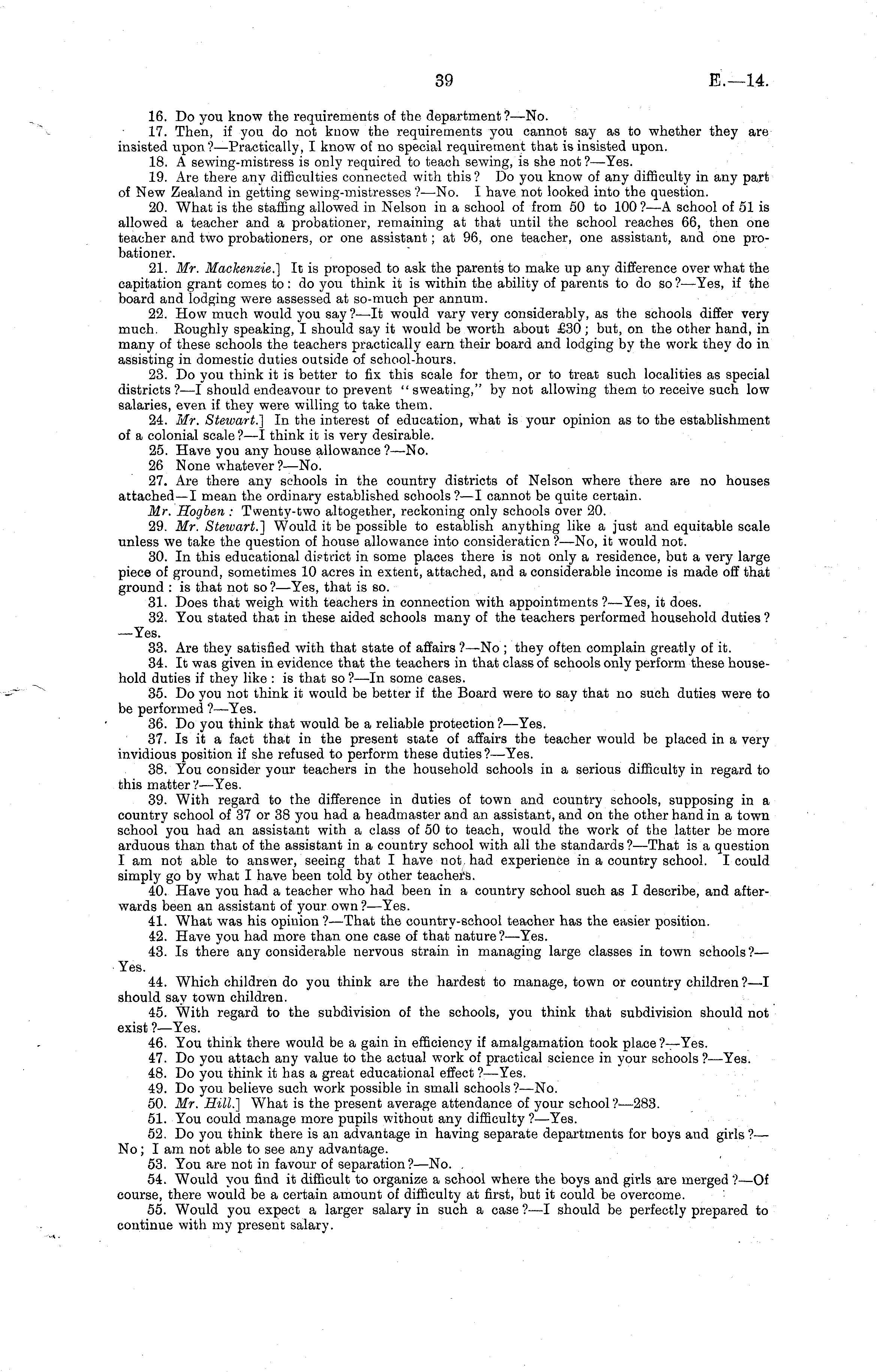 16. Do you know the requirements of the department?— No. 17. Then, if you do not know the requirements you cannot say as to whether they are insisted upon ?—Practically, I know of no special requirement that is insisted upon. 18. A sewing-mistress is only required to teach sewing, is she not ?—Yes. 19. Are there any difficulties connected with this ? Do you know of any difficulty in any part of New Zealand in getting sewing-mistresses ? —No. I have not looked into the question. 20. What is the staffing allowed in Nelson in a school of from 50 to 100 ? —A school of 51 is allowed a teacher and a probationer, remaining at that until the school reaches 66, then one teacher and two probationers, or one assistant; at 96, one teacher, one assistant, and one probationer. 21. Mr. Mackenzie.] It is proposed to ask the parents to make up any difference over what the capitation grant comes to : do you think it is within the ability of parents to do so ?—Yes, if the board and lodging were assessed at so-much per annum. 22. How much would you say?—lt would vary very considerably, as the schools differ very much. Boughly speaking, I should say it would be worth about £30 ; but, on the other hand, in many of these schools the teachers practically earn their board and lodging by the work they do in assisting in domestic duties outside of school-hours. 23. Do you think it is better to fix this scale for them, or to treat such localities as special districts ?—I should endeavour to prevent " sweating," by not allowing them to receive such low salaries, even if they were willing to take them. 24. Mr. Stewart.] In the interest of education, what is your opinion as to the establishment of a colonial scale?—l think it is very desirable. 25. Have you any house allowance ?—-No. 26 None whatever ?—No. 27. Are there any schools in the country districts of Nelson where there are no houses attached—l mean the ordinary established schools?—l cannot be quite certain. Mr. Hogben : Twenty-two altogether, reckoning only schools over 20. 29. Mr. Stewart.] Would it be possible to establish anything like a just and equitable scale unless we take the question of house allowance into consideration ?—No, it would not. 30. In this educational district in some places there is not only a residence, but a very large piece of ground, sometimes 10 acres in extent, attached, and a considerable income is made off that ground : is that not so ?—Yes, that is so. 31. Does that weigh with teachers in connection with appointments ?—Yes, it does. 32. You stated that in these aided schools many of the teachers performed household duties ? —Yes. 33. Are they satisfied with that state of affairs ?—No ; they often complain greatly of it. 34. It was given in evidence that the teachers in that class of schools only perform these household duties if they like : is that so ? —ln some cases. 35. Do you not think it would be better if the Board were to say that no such duties were to be performed ?—Yes. 36. Do you think that would be a reliable protection ?—Yes. 37. Is it a fact that in the present state of affairs the teacher would be placed in a very invidious position if she refused to perform these duties ?—Yes. 38. You consider your teachers in the household schools in a serious difficulty in regard to this matter?— Yes. 39. With regard to the difference in duties of town and country schools, supposing in a country school of 37 or 38 you had a headmaster and an assistant, and on the other hand in a town school you had an assistant with a class of 50 to teach, would the work of the latter be more arduous than that of the assistant in a country school with all the standards ? —That is a question lam not able to answer, seeing that I have not had experience in a country school. I could simply go by what I have been told by other teachers. 40. Have you had a teacher who had been in a country school such as I describe, and afterwards been an assistant of your own? —Yes. 41. What was his opinion ?—That the country-school teacher has the easier position. 42. Have you had more than one case of that nature?— Yes. 43. Is there any considerable nervous strain in managing large classes in town schools?— Yes. 44. Which children do you think are the hardest to manage, town or country children ?—I should say town children. 45. With regard to the subdivision of the schools, you think that subdivision should not exist ?—Yes. 46. You think there would be a gain in efficiency if amalgamation took place ?—Yes. 47. Do you attach any value to the actual work of practical science in your schools ? —Yes. 48. Do you think it has a great educational effect ?—Yes. 49. Do you believe such work possible in small schools ? —No. 50. Mr. Hill.] What is the present average attendance of your school?—2B3. 51. You could manage more pupils without any difficulty ?—Yes. 52. Do you think there is an advantage in having separate departments for boys and girls ?— No; lam not able to see any advantage. 53. You are not in favour of separation?— No. . 54. Would you find it difficult to organize a school where the boys and girls are merged ?—Of course, there would be a certain amount of difficulty at first, but it could be overcome. 55. Would you expect a larger salary in such a case ?—I should be perfectly prepared to continue with my present salary.