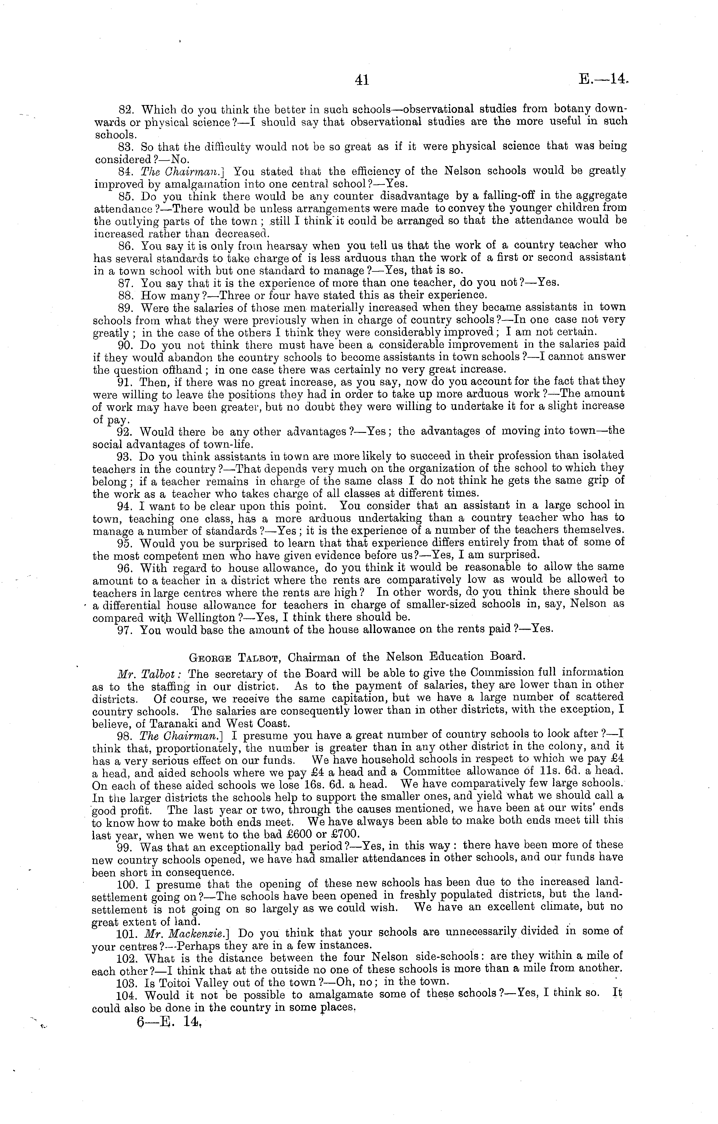 82. Which do you think the better in such schools —observational studies from botany downwards or physical science ?—I should say that observational studies are the more useful in such schools. 83. So that the difficulty would not be so great as if it were physical science that was being considered ?—No. 84. The Chairman.] You stated that the efficiency of the Nelson schools would be greatly improved by amalgamation into one central school?— Yes. 85. Do you think there would be any counter disadvantage by a falling-off in the aggregate attendance ?—There would be unless arrangements were made to convey the younger children from the outlying parts of the town ; still I think" it could be arranged so that the attendance would be increased rather than decreased. 86. You say it is only from hearsay when you tell us that the work of a country teacher who has several standards to take charge of is less arduous than the work of a first or second assistant in a town school with but one standard to manage ? —Yes, that is so. 87. You say that it is the experience of more than one teacher, do you not? —Yes. 88. How many ?—Three or four have stated this as their experience. 89. Were the salaries of those men materially increased when they became assistants in town schools from what they were previously when in charge of country schools ?—ln one case not very greatly ; in the case of the others I think they were considerably improved; lam not certain. 90. Do you not think there must have been a considerable improvement in the salaries paid if they would abandon the country schools to become assistants in town schools ?—I cannot answer the question offhand; in one case there was certainly no very great increase. 91. Then, if there was no great increase, as you say, now do you account for the fact that they were willing to leave the positions they had in order to take up more arduous work ? —The amount of work may have been greater, but no doubt they were willing to undertake it for a slight increase of pay. 92. Would there be any other advantages ?—Yes; the advantages of moving into town—the social advantages of town-life. 93. Do you think assistants in town are more likely to succeed in their profession than isolated teachers in the country ?—That depends very much on the organization of the school to which they belong; if a teacher remains in charge of the same class I do not think he gets the same grip of the work as a teacher who takes charge of all classes at different times. 94. I want to be clear upon this point. You consider that an assistant in a large school in town, teaching one class, has a more arduous undertaking than a country teacher who has to manage a number of standards ?—Yes ; it is the experience of a number of the teachers themselves. 95. Would you be surprised to learn that that experience differs entirely from that of some of the most competent men who have given evidence before us? —Yes, I am surprised. 96. With regard to house allowance, do you think it would be reasonable to allow the same amount to a teacher in a district where the rents are comparatively low as would be allowed to teachers in large centres where the rents are high ? In other words, do you think there should be a differential house allowance for teachers in charge of smaller-sized schools in, say, Nelson as compared with Wellington ? —Yes, I think there should be. 97. You would base the amount of the house allowance on the rents paid ?—Yes. George Talbot, Chairman of the Nelson Education Board. Mr. Talbot: The secretary of the Board will be able to give the Commission full information as to the staffing in our district. As to the payment of salaries, they are lower than in other districts. Of course, we receive the same capitation, but we have a large number of scattered country schools. The salaries are consequently lower than in other districts, with the exception, I believe, of Taranaki and West Coast. 98. The Chairman.] I presume you have a great number of country schools to look after ?—I think that, proportionately, the number is greater than in any other district in the colony, and it has a very serious effect on our funds. We have household schools in respect to which we pay £4 a head, and aided schools where we pay £4 a head and a Committee allowance of lis. 6d. a head. On each of these aided schools we lose 16s. 6d. a head. We have comparatively few large schools. In the larger districts the schools help to support the smaller ones, and yield what we should call a good profit. The last year or two, through the causes mentioned, we have been at our wits' ends to know how to make both ends meet. We have always been able to make both ends meet till this last year, when we went to the bad £600 or £700. 99. Was that an exceptionally bad period?— Yes, in this way : there have been more of these new country schools opened, we have had smaller attendances in other schools, and our funds have been short in consequence. 100. I presume that the opening of these new schools has been due to the increased landsettlement going on ?—The schools have been opened in freshly populated districts, but the landsettlement is not going on so largely as we could wish. We have an excellent climate, but no great extent of land. 101. Mr. Mackenzie.] Do you think that your schools are unnecessarily divided in some of your centres? —Perhaps they are in a few instances. 102. What is the distance between the four Nelson side-schools: are they within a mile of each other?—l think that at the outside no one of these schools is more than a mile from another. 103. Is Toitoi Valley out of the town ?—Oh, no; in the town. 104. Would it not be possible to amalgamate some of these schools ?—Yes, I think so. It could also be done in the country in some places. a—c. i 4?