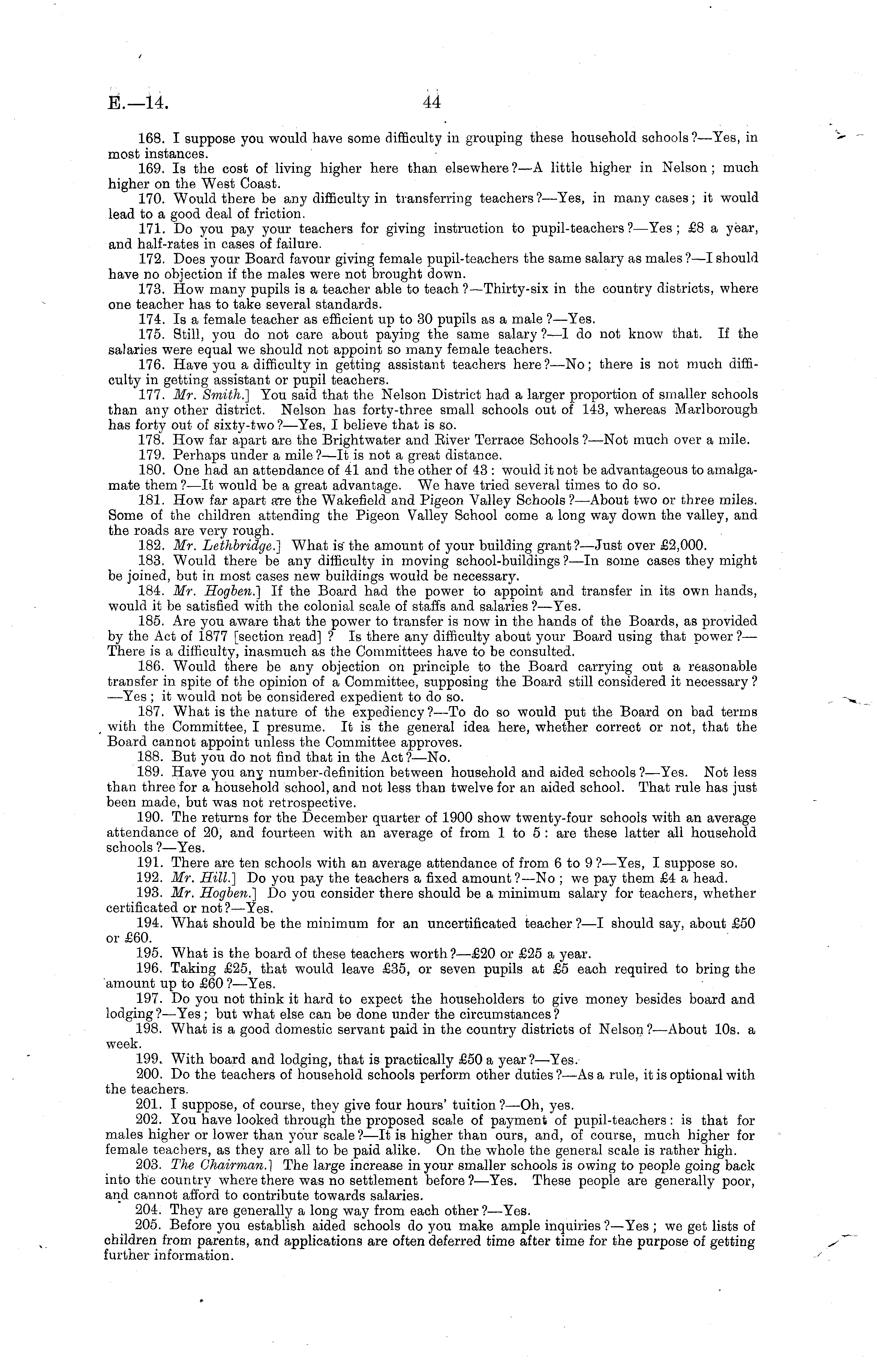 168. I suppose you would have some difficulty in grouping these household schools ?—Yes, in most instances. 169. Is the cost of living higher here than elsewhere ? —A little higher in Nelson ; much higher on the West Coast. 170. Would there be any difficulty in transferring teachers ?—Yes, in many cases; it would lead to a good deal of friction. 171. Do you pay your teachers for giving instruction to pupil-teachers? —Yes; £8 a year, and half-rates in cases of failure. 172. Does your Board favour giving female pupil-teachers the same salary as males ?—I should have no objection if the males were not brought down. 173. How many pupils is a teacher able to teach ?—Thirty-six in the country districts, where one teacher has to take several standards. 174. Is a female teacher as efficient up to 30 pupils as a male ? —Yes. 175. Still, you do not care about paying the same salary ? —1 do not know that. If the salaries were equal we should not appoint so many female teachers. 176. Have you a difficulty in getting assistant teachers here ?—No; there is not much difficulty in getting assistant or pupil teachers. 177. Mr. Smith.] You said that the Nelson District had a larger proportion of smaller schools than any other district. Nelson has forty-three small schools out of 143, whereas Marlborough has forty out of sixty-two ?—Yes, I believe that is so. 178. How far apart are the Brightwater and Biver Terrace Schools ?—Not much over a mile. 179. Perhaps under a mile ?—lt is not a great distance. 180. One had an attendance of 41 and the other of 43 : would it not be advantageous to amalgamate them ? —lt would be a great advantage. We have tried several times to do so. 181. How far apart are the Wakefield and Pigeon Valley Schools ? —About two or three miles. Some of the children attending the Pigeon Valley School come a long way down the valley, and the roads are very rough. 182. Mr. Lethbridge.] What is the amount of your building grant? —Just over £2,000. 183. Would there be any difficulty in moving school-buildings ? —ln some cases they might be joined, but in most cases new buildings would be necessary. 184. Mr. Hogben.] If the Board had the power to appoint and transfer in its own hands, would it be satisfied with the colonial scale of staffs and salaries ?—Yes. 185. Are you aware that the power to transfer is now in the hands of the Boards, as provided by the Act of 1877 [section read] ? Is there any difficulty about your Board using that power ? —■ There is a difficulty, inasmuch as the Committees have to be consulted. 186. Would there be any objection on principle to the Board carrying out a reasonable transfer in spite of the opinion of a Committee, supposing the Board still considered it necessary ? —Yes; it would not be considered expedient to do so. 187. What is the nature of the expediency ?—To do so would put the Board on bad terms with the Committee, I presume. It is the general idea here, whether correct or not, that the Board cannot appoint unless the Committee approves. 188. But you do not find that in the Act ?—No. 189. Have you any number-definition between household and aided schools ?—Yes. Not less than three for a household school, and not less than twelve for an aided school. That rule has just been made, but was not retrospective. 190. The returns for the December quarter of 1900 show twenty-four schools with an average attendance of 20, and fourteen with an average of from 1 to 5 : are these latter all household schools ?—Yes. 191. There are ten schools with an average attendance of from 6 to 9?— Yes, I suppose so. 192. Mr. Hill.] Do you pay the teachers a fixed amount? —No ; we pay them £4 a head. 193. Mr. Hogben.] Do you consider there should be a minimum salary for teachers, whether certificated or not?— Yes. 194. What should be the minimum for an uncertificated teacher ? —I should say, about £50 or £60. 195. What is the board of these teachers worth? —£20 or £25 a year. 196. Taking £25, that would leave £35, or seven pupils at £5 each required to bring the amount up to £60 ?—Yes. 197. Do you not think it hard to expect the householders to give money besides board and lodging ? —Yes ; but what else can be done under the circumstances ? 198. What is a good domestic servant paid in the country districts of Nelson ?—About 10s. a week. 199. With board and lodging, that is practically £50 a year?—-Yes. 200. Do the teachers of household schools perform other duties?— Asa rule, it is optional with the teachers. 201. I suppose, of course, they give four hours' tuition ?—Oh, yes. 202. You have looked through the proposed scale of payment of pupil-teachers : is that for males higher or lower than your scale ?—lt is higher than ours, and, of course, much higher for female teachers, as they are all to be paid alike. On the whole the general scale is rather high. 203. The Chairman.] The large increase in your smaller schools is owing to people going back into the country where there was no settlement before ?—Yes. These people are generally poor, and cannot afford to contribute towards salaries. 204. They are generally a long way from each other?— Yes. 205. Before you establish aided schools do you make ample inquiries ? —Yes ; we get lists of children from parents, and applications are often deferred time after time for the purpose of getting further information.