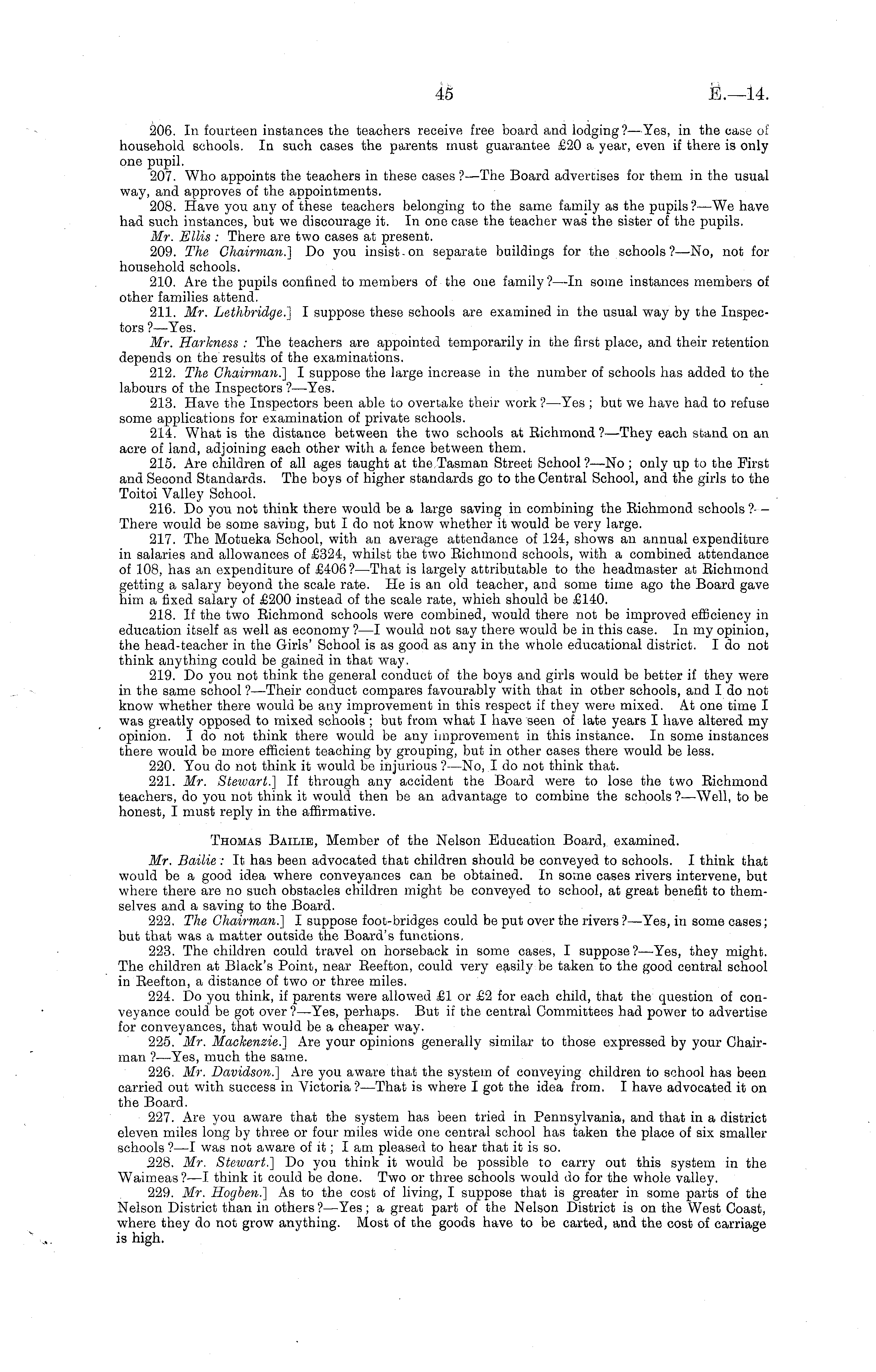 206. In fourteen instances the teachers receive free board and lodging? —Yes, in the case of household schools. In such cases the parents must guarantee £20 a year, even if there is only one pupil. 207. Who appoints the teachers in these cases ? —The Board advertises for them in the usual way, and approves of the appointments. 208. Have you any of these teachers belonging to the same family as the pupils?—We have had such instances, but we discourage it. In one case the teacher was the sister of the pupils. Mr. Ellis : There are two cases at present. 209. The Chairman.] Do you insist .on separate buildings for the schools?—No, not for household schools. 210. Are the pupils confined to members of the one family ?—ln some instances members of other families attend. 211. Mr. Lethbridge.] I suppose these schools are examined in the usual way by the Inspectors ?—Yes. Mr. Harkness : The teachers are appointed temporarily in the first place, and their retention depends on the results of the examinations. 212. The Chairman.] I suppose the large increase in the number of schools has added to the labours of the Inspectors ?—Yes. 213. Have the Inspectors been able to overtake their work ? —Yes ; but we have had to refuse some applications for examination of private schools. 214. What is the distance between the two schools at Bichmond ? —-They each stand on an acre of land, adjoining each other with a fence between them. 215. Are children of all ages taught at theTasman Street School ? —No ; only up to the First and Second Standards. The boys of higher standards go to the Central School, and the girls to the Toitoi Valley School. 216. Do you not think there would be a large saving in combining the Bichmond schools ?- - There would be some saving, but I do not know whether it would be very large. 217. The Motueka School, with an average attendance of 124, shows an annual expenditure in salaries and allowances of £324, whilst the two Bichmond schools, with a combined attendance of 108, has an expenditure of £406?— That is largely attributable to the headmaster at Bichmond getting a salary beyond the scale rate. He is an old teacher, and some time ago the Board gave him a fixed salary of £200 instead of the scale rate, which should be £140. 218. If the two Bichmond schools were combined, would there not be improved efficiency in education itself as well as economy ? —I would not say there would be in this case. In my opinion, the head-teacher in the Girls' School is as good as any in the whole educational district. Ido not think anything could be gained in that way. 219. Do you not think the general conduct of the boys and girls would be better if they were in the same school ? —Their conduct compares favourably with that in other schools, and I do not know whether there would be any improvement in this respect if they were mixed. At one time I was greatly opposed to mixed schools ; but from what I have seen of late years I have altered my opinion. I do not think there would be any improvement in this instance. In some instances there would be more efficient teaching by grouping, but in other cases there would be less. 220. You do not think it would be injurious ? —No, I do not think that. 221. Mr. Stewart.] If through any accident the Board were to lose the two Bichmond teachers, do you not think it would then be an advantage to combine the schools?— Well, to be honest, I must reply in the affirmative. Thomas Bailie, Member of the Nelson Education Board, examined. Mr. Bailie: It has been advocated that children should be conveyed to schools. I think that would be a good idea where conveyances can be obtained. In some cases rivers intervene, but where there are no such obstacles children might be conveyed to school, at great benefit to themselves and a saving to the Board. 222. The Chairman.] I suppose foot-bridges could be put over the rivers ?—Yes, in some cases; but that was a matter outside the Board's functions. 223. The children could travel on horseback in some cases, I suppose?— Yes, they might. The children at Black's Point, near Beefton, could very easily be taken to the good central school in Beefton, a distance of two or three miles. 224. Do you think, if parents were allowed £1 or £2 for each child, that the question of conveyance could be got over ? —Yes, perhaps. But if the central Committees had power to advertise for conveyances, that would be a cheaper way. 225. Mr. Mackenzie.] Are your opinions generally similar to those expressed by your Chairman ?—Yes, much the same. 226. Mr. Davidson.] Are you aware that the system of conveying children to school has been carried out with success in Victoria ?—That is where I got the idea from. I have advocated it on the Board. 227. Are you aware that the system has been tried in Pennsylvania, and that in a district eleven miles long by three or four miles wide one central school has taken the place of six smaller schools ?—I vvas not aware of it; lam pleased to hear that it is so. 328. Mr. Steivart.] Do you think it would be possible to carry out this system in the Waimeas? —I think it could be done. Two or three schools would do for the whole valley. 229. Mr. Hogben.] As to the cost of living, I suppose that is greater in some parts of the Nelson District than in others ?—Yes ; a great part of the Nelson District is on the West Coast, where they do not grow anything. Most of the goods have to be carted, and the cost of carriage is high.