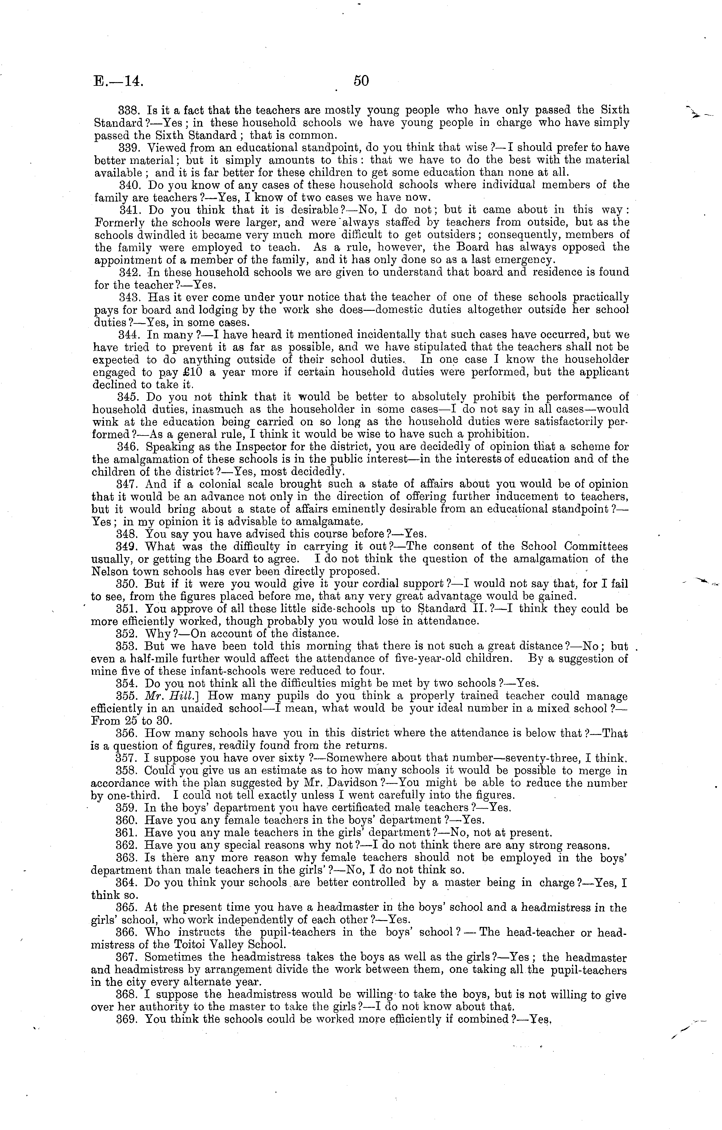 338. Is it a fact that the teachers are mostly young people who have only passed the Sixth Standard ? —Yes; in these household schools we have young people in charge who have simply passed the Sixth Standard; that is common. 339. Viewed from an educational standpoint, do you think that wise ?—I should prefer to have better material; but it simply amounts to this : that we have to do the best with the material available ; and it is far better for these children to get some education than none at all. 340. Do you know of any cases of these household schools where individual members of the family are teachers ?—Yes, I know of two cases we have now. 341. Do you think that it is desirable?—No, I do not; but it came about in this way: Formerly the schools were larger, and w T ere "always staffed by teachers from outside, but as the schools dwindled it became very much more difficult to get outsiders; consequently, members of the family were employed to teach. As a rule, however, the Board has always opposed the appointment of a member of the family, and it has only done so as a last emergency. 342. In these household schools we are given to understand that board and residence is found for the teacher?— Yes. 343. Has it ever come under your notice that the teacher of one of these schools practically pays for board and lodging by the work she does—domestic duties altogether outside her school duties ?—Yes, in some cases. 344. In many ?—I have heard it mentioned incidentally that such cases have occurred, but we have tried to prevent it as far as possible, and we have stipulated that the teachers shall not be expected to do anything outside of their school duties. In one case I know the householder engaged to pay £10 a year more if certain household duties were performed, but the applicant declined to take it. 345. Do you not think that it would be better to absolutely prohibit the performance of household duties, inasmuch as the householder in some cases—l do not say in all cases—would wink at the education being carried on so long as the household duties were satisfactorily performed?—As a general rule, I think it would be wise to have such a prohibition. 346. Speaking as the Inspector for the district, you are decidedly of opinion that a scheme for the amalgamation of these schools is in the public interest—in the interests of education and of the children of the district? —Yes, most decidedly. 347. And if a colonial scale brought such a state of affairs about you would be of opinion that it would be an advance not only in the direction of offering further inducement to teachers, but it would bring about a state of affairs eminently desirable from an educational standpoint ?— Yes; in my opinion it is advisable to amalgamate. 348. You say you have advised this course before?— Yes. 349. What was the difficulty in carrying it out?— The consent of the School Committees usually, or getting the Board to agree. Ido not think the question of the amalgamation of the Nelson town schools has ever been directly proposed. 350. But if it were you would give it your cordial support ? —I would not say that, for I fail to see, from the figures placed before me, that any very great advantage would be gained. 351. You approve of all these little side-schools up to Standard II.?—I think they could be more efficiently worked, though probably you would lose in attendance. 352. Why?—On account of the distance. 353. But we have been told this morning that there is not such a great distance?—No; but even a half-mile further would affect the attendance of five-year-old children. By a suggestion of mine five of these infant-schools were reduced to four. 354. Do you not think all the difficulties might be met by two schools ?—Yes. 355. Mr. Hill.] How many pupils do you think a properly trained teacher could manage efficiently in an unaided school—l mean, what would be your ideal number in a mixed school ?— From 25 to 30. 356. How many schools have you in this district where the attendance is below that ? —That is a question of figures, readily found from the returns. 357. I suppose you have over sixty ?—Somewhere about that number —seventy-three, I think. 358. Could you give us an estimate as to how many schools it would be possible to merge in accordance with the plan suggested by Mr. Davidson ? —You might be able to reduce the number by one-third. I could not tell exactly unless I went carefully into the figures. 359. In the boys' department you have certificated male teachers ?—Yes. 360. Have you any female teachers in the boys' department ?—Yes. 361. Have you any male teachers in the girls' department? —No, not at present. 362. Have you any special reasons why not ?—I do not think there are any strong reasons. 363. Is there any more reason why female teachers should not be employed in the boys' department than male teachers in the girls' ?—No, I do not think so. 364. Do you think your schools are better controlled by a master being in charge ?—Yes, I think so. 365. At the present time you have a headmaster in the boys' school and a headmistress in the girls' school, who work independently of each other? —Yes. 366. Who instructs the pupil-teachers in the boys' school ? — The head-teacher or headmistress of the Toitoi Valley School. 367. Sometimes the headmistress takes the boys as well as the girls?— Yes; the headmaster and headmistress by arrangement divide the work between them, one taking all the pupil-teachers in the city every alternate year. 368. I suppose the headmistress would be willing-to take the boys, but is not willing to give over her authority to the master to take the girls ?—I do not know about that. 369. You think the schools could be worked more efficiently if combined?— Yes,